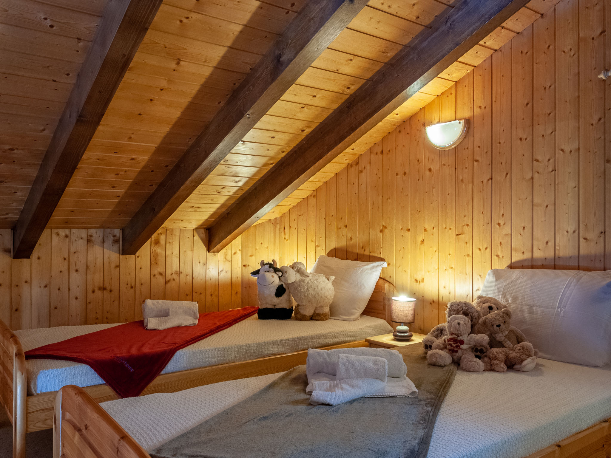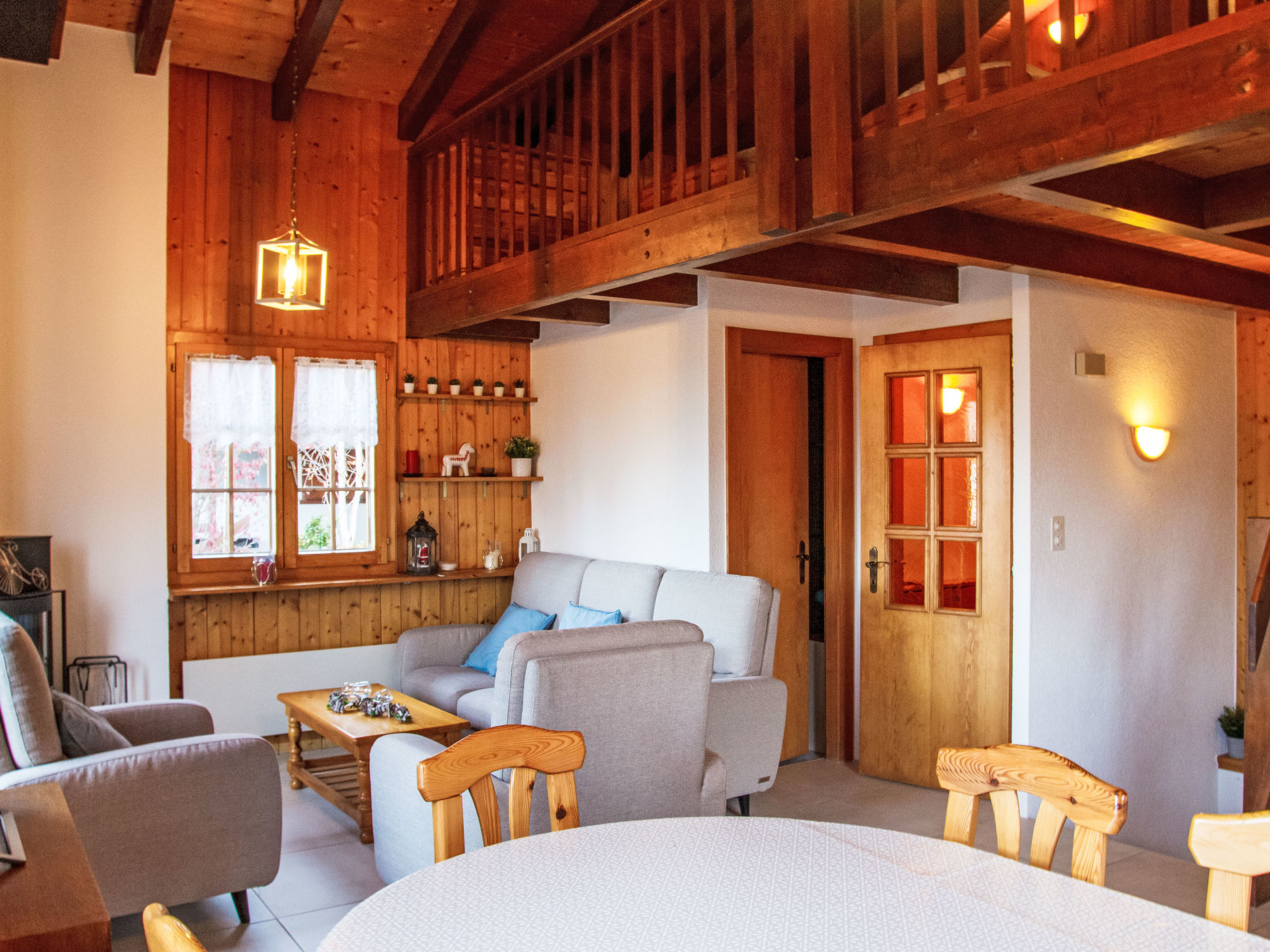 "Anusach", chalet 3 pièces 80 m2 sur 2 niveaux. Partiellement rénové en 2022, aménagement confortable et avec beaucoup de bois: petite entrée. Séjour/salle à manger avec poêle suédois et TV (câblée). Sortie sur la terrasse, orientée nord et orientée ouest. Cuisine ouverte (four, lave-vaisselle, 4 plaques vitrocéramiques, grille-pain, bouilloire électrique, micro-ondes, cafetière électrique, appareil à raclette, service à fondue (fondue au fromage)). Douche/WC. Chauffage électrique. À l'étage inférieur: 1 chambre avec 1 grand-lit (1 x 160 cm, longueur 200 cm). 1 chambre avec 1 x 2 lits superposés (90 cm, longueur 190 cm). Bain/WC. À l'étage supérieur: (escalier raide) galerie mansardée, ouverte avec 2 lits (90 cm, longueur 190 cm). Terrasse, situation nord. Très belle vue sur les montagnes et la vallée. A disposition: lave-linge, sèche-cheveux. Internet (Connexion WIFI, gratuit). Garage (1 Voiture), hauteur 200 cm, largeur 225 cm. Veuillez noter: logement non-fumeur. 1 animal/ chien de petite taille autorisé. Au lieu d'une chambre fermée, des espaces de couchage sont situés dans une zone ouverte (galerie, alcôve...).