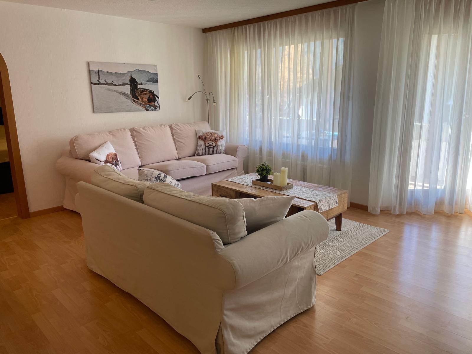 L'appartement de vacances Cadras 14 est un appartement de 3.5 pièces de 80m2 au 1er étage d'un immeuble collectif. 1 chambre avec un lit double boxspring (180cmx200cm) et 1 lit bébé/petit enfant (100cmx140cm), 1 chambre avec un lit double boxspring (180cmx200cm), 1 canapé-lit (largeur 140-160cm) dans le salon. Occupation pour 5 adultes et un petit enfant. Cuisine ouverte avec four, réfrigérateur, plaque de cuisson à induction, lave-vaisselle, micro-ondes et machine à café (Nespresso). Bouilloire, grille-pain, presse-purée, appareil à gazéifier Sodastream. Four à raclette et caquelon à fondue. Baignoire avec robinetterie de douche et WC. Smart-TV, lecteur Blu-Ray/DVD, WLAN, radio. Animaux domestiques non autorisés. Appartement non-fumeur. Linge de lit, linge de toilette et de cuisine disponibles. Balcon pour les invités. Lave-linge et sèche-linge, ainsi que local à skis en commun dans la maison. Place de garage n° 14, possibilité de garer les vélos, hauteur de l'entrée du garage 180 cm.