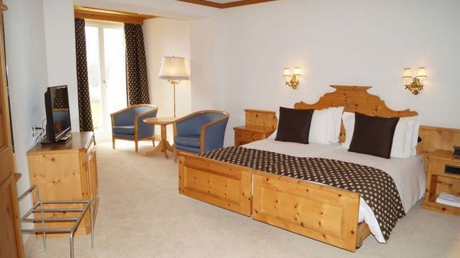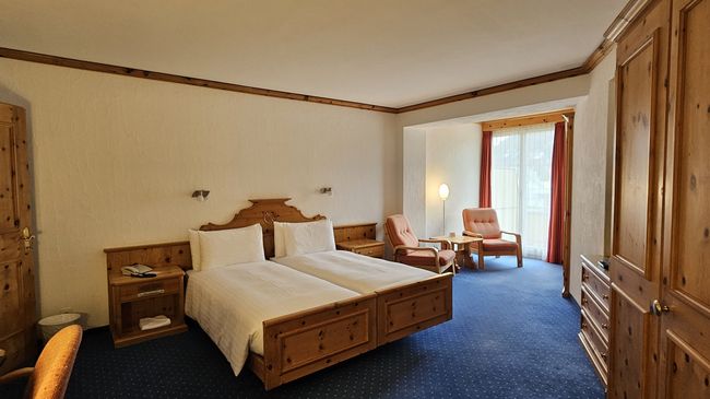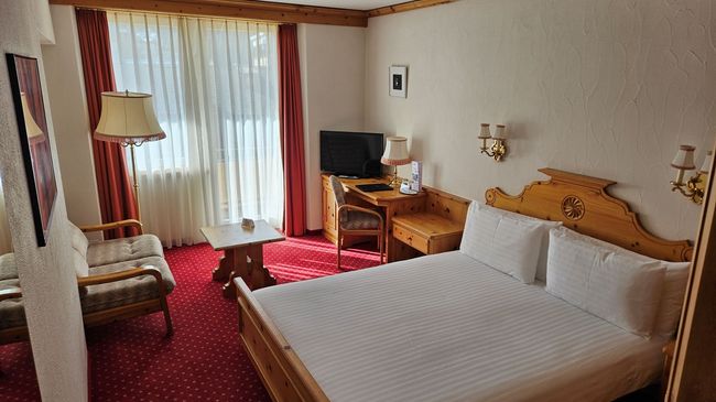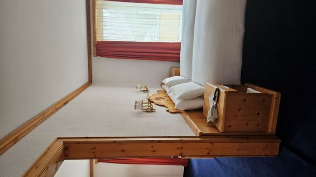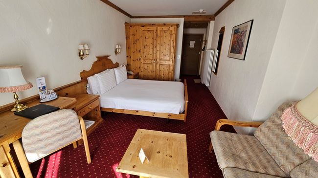 La chambre style Alpin est charmante avec moquette et meubles en pin massif.