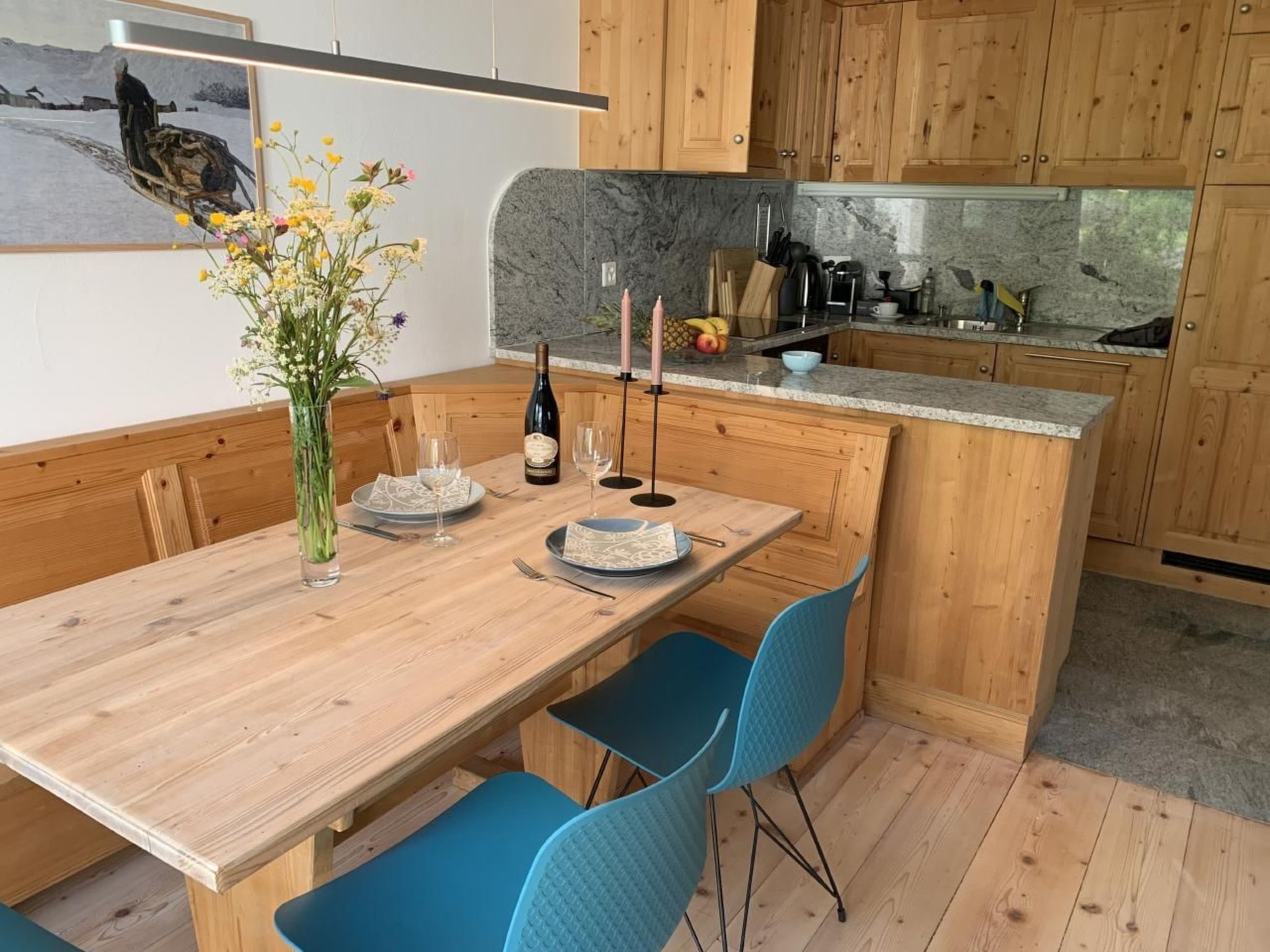 Welcome to your holiday home away from the hustle and bustle, nestled in the picturesque beauty of the Upper Engadine. This pretty flat in Madulain offers the ideal retreat for your next holiday. With two comfortable bedrooms, two modern bathrooms, a fully equipped kitchen and an inviting dining/living room with a lovely fireplace, this accommodation offers everything you need for a comfortable stay.