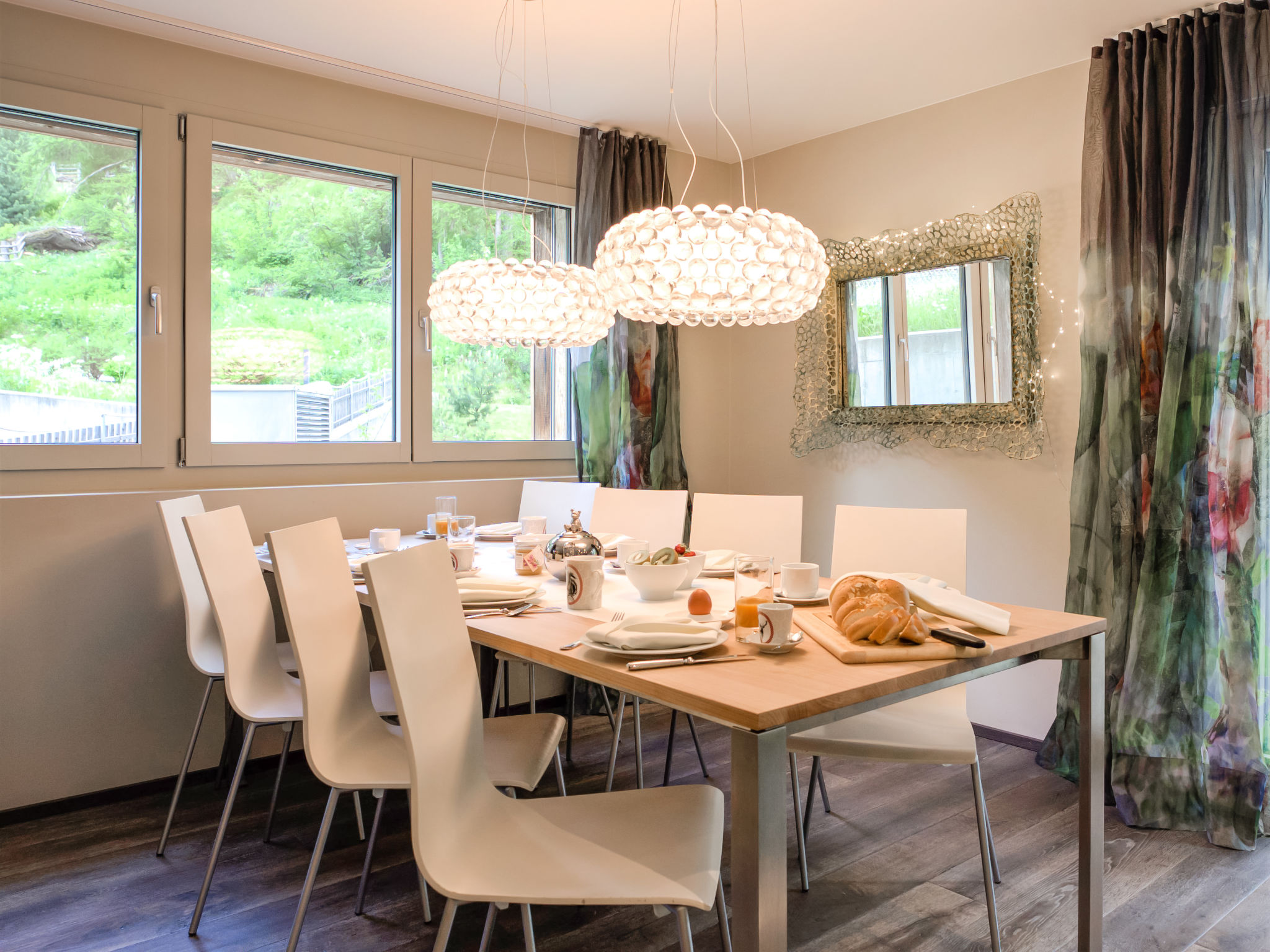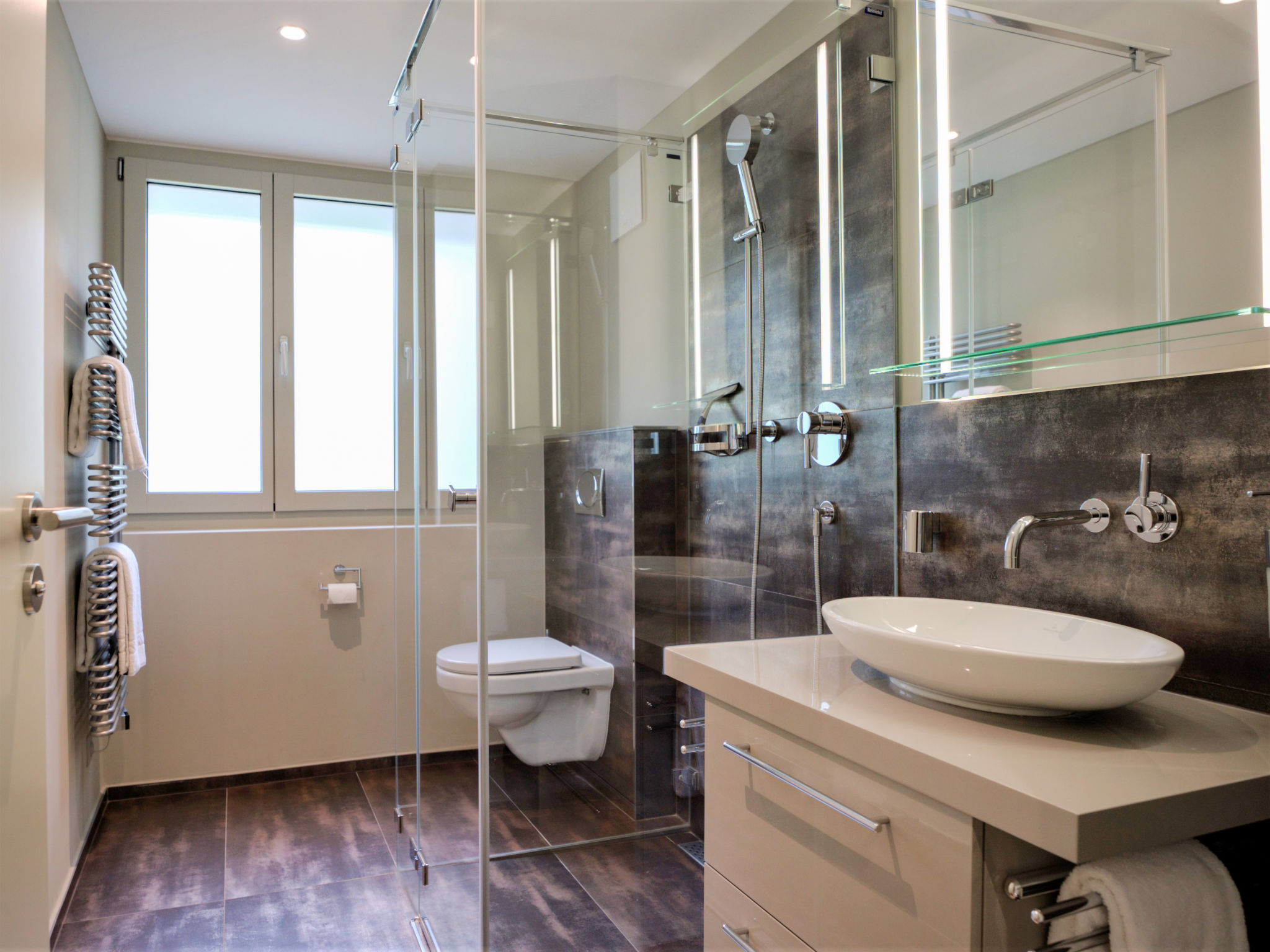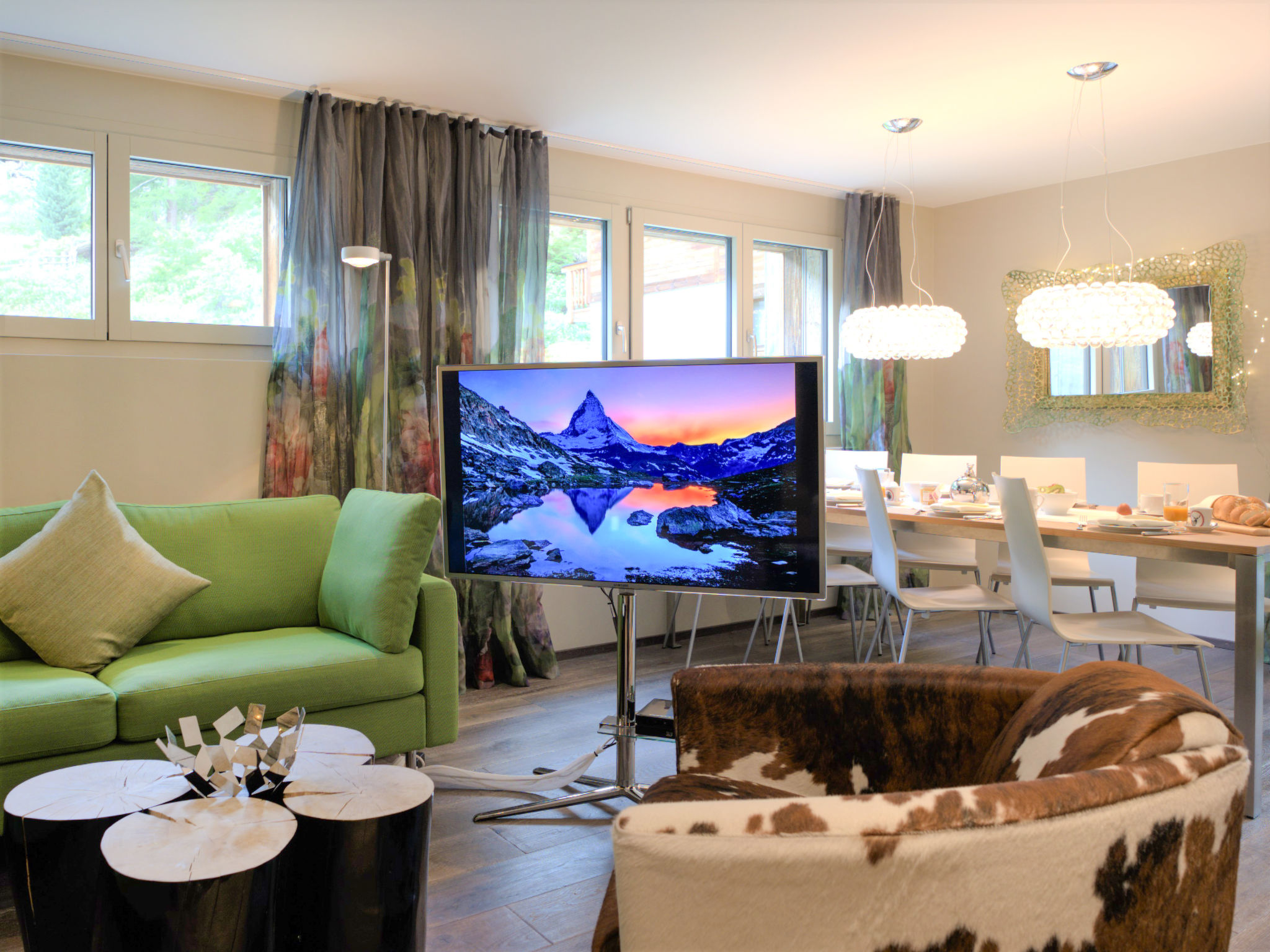 Apt 5 pièces 120 m2 sur 2 niveaux, au rez-de-chaussée. Logement idéal pour 6 adultes + 2 enfants. Spacieux et clair, aménagement moderne et luxueux: à l'étage inférieur: séjour/salle à manger ouvert avec TV. Cuisine ouverte (four, lave-vaisselle, 4 plaques vitrocéramiques, grille-pain, bouilloire électrique, congélateur, cafetière électrique, appareil à raclette, combiné micro-ondes, service à fondue (fondue chinoise, fondue au fromage)) avec table pour les repas. Sortie sur la terrasse. À l'étage supérieur: 1 chambre double avec 1 lit double (180 cm, longueur 200 cm). Sortie sur le balcon. 1 chambre double avec 1 lit double (180 cm, longueur 200 cm), douche/WC. 1 grande chambre double avec 1 lit double (180 cm, longueur 200 cm), bain/douche/WC. Sortie sur la terrasse. 1 chambre d'enfants avec 1 x 2 lits superposés (90 cm, longueur 200 cm). Douche/WC. Balcon, grande terrasse. Meubles de terrasse. Vue partielle sur le Cervin. A disposition: coffre-fort, sèche-cheveux. Internet (Connexion WIFI, gratuit). Veuillez noter: logement non-fumeur.