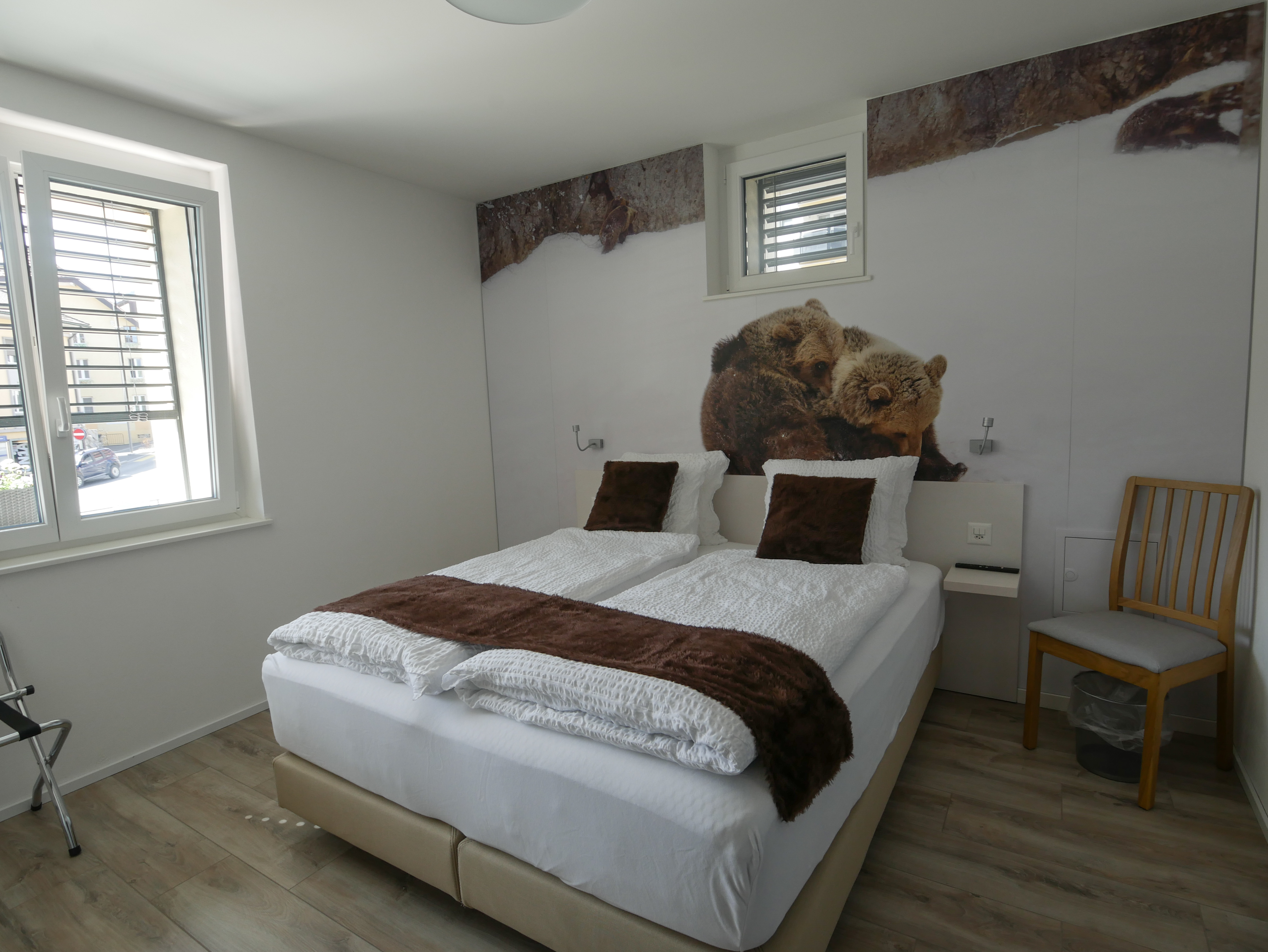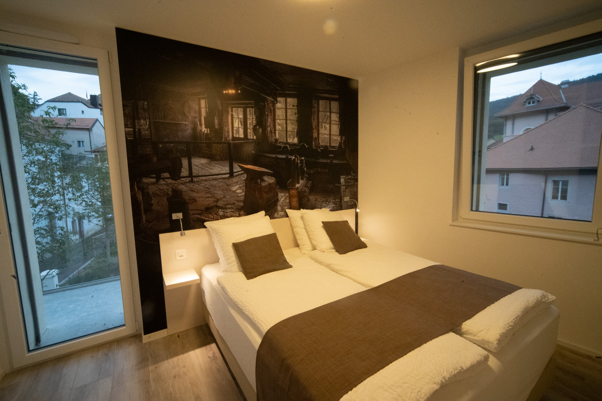 De plus, l'hôtel est équipé des dernières technologies permettant un accès facile par téléphone portable une fois votre réservation confirmée. Choisissez votre chambre à thème parmi le fort de Pré Giroud, les grottes de Vallorbe, le musée du fer et du chemin de fer, ou Juraparc... et profitez des nombreuses activités de la région, des visites des 4 sites touristiques, des innombrables promenades (trail, marche, VTT,...), de la vallée de la Joux et de son lac, du Saut du Jour et des gorges de l'Orbe... Toutes les chambres peuvent accueillir 2 personnes - dont une pour les personnes handicapées - avec salle de bain moderne, télévision à écran plat avec de nombreuses chaînes multilingues et radio, wifi, cafetière/théière, coffre-fort, minibar,.... Nous nous réjouissons de vous accueillir prochainement