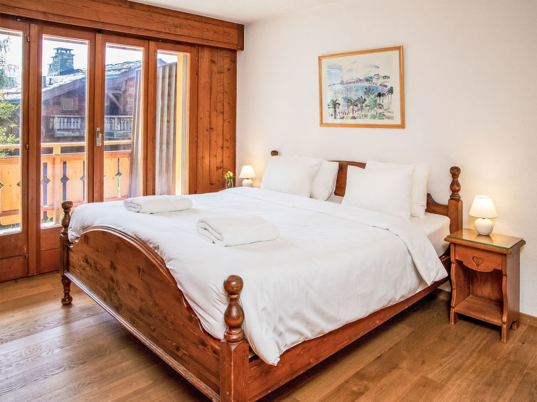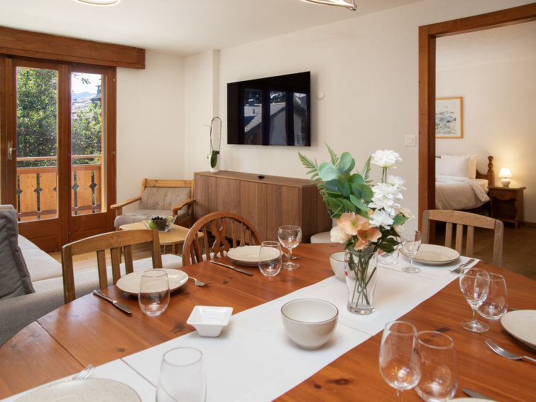 "Val Fleuri 208", apt 4 pièces 100 m2 au 2ème étage, situation sud. Aménagement agréable et de bon goût: grand séjour/salle à manger avec cheminée et TV (câblée) (écran plat). Sortie sur la terrasse. 1 grande chambre avec 1 lit double (1 x 160 cm, longueur 200 cm). Sortie sur la terrasse. 2 grandes chambres, chaque chambre avec: 2 lits (90 cm, longueur 200 cm). Cuisine ouverte (4 plaques de cuisson, four, lave-vaisselle, grille-pain, bouilloire électrique, micro-ondes, congélateur, cafetière électrique, Capsules pour machine à café (Nespresso) (NON INCLUSES), appareil à raclette, service à fondue (fondue au fromage)) avec passe-plat. Bain/WC, douche/WC. Chauffage, chauffage électrique, chauffage par le sol. Sol en parquet. Très belle vue sur les montagnes. A disposition: lave-linge, sèche-linge, sèche-cheveux. Internet (Connexion WIFI, gratuit). Place de parking. Veuillez noter: logement non-fumeur.