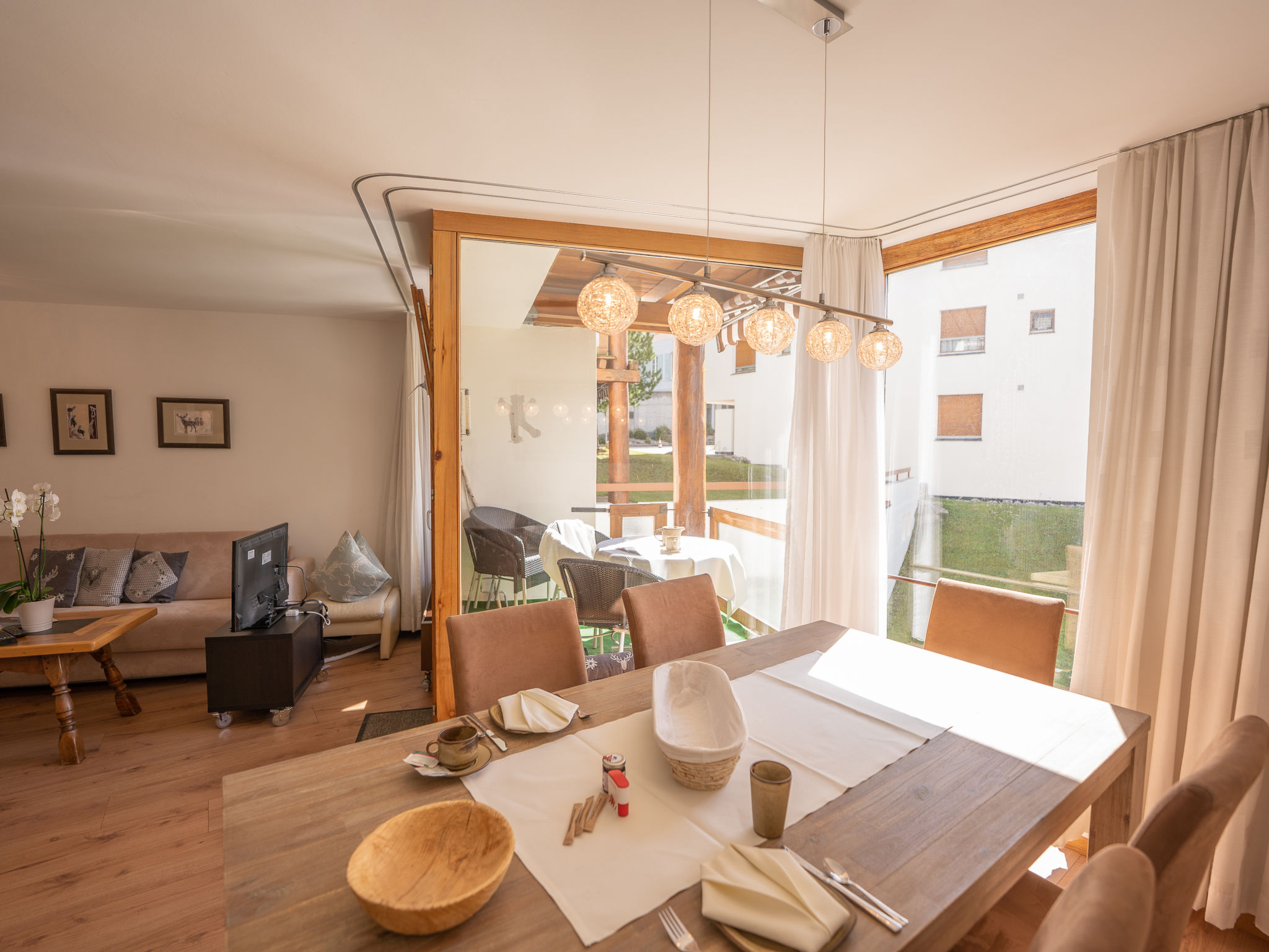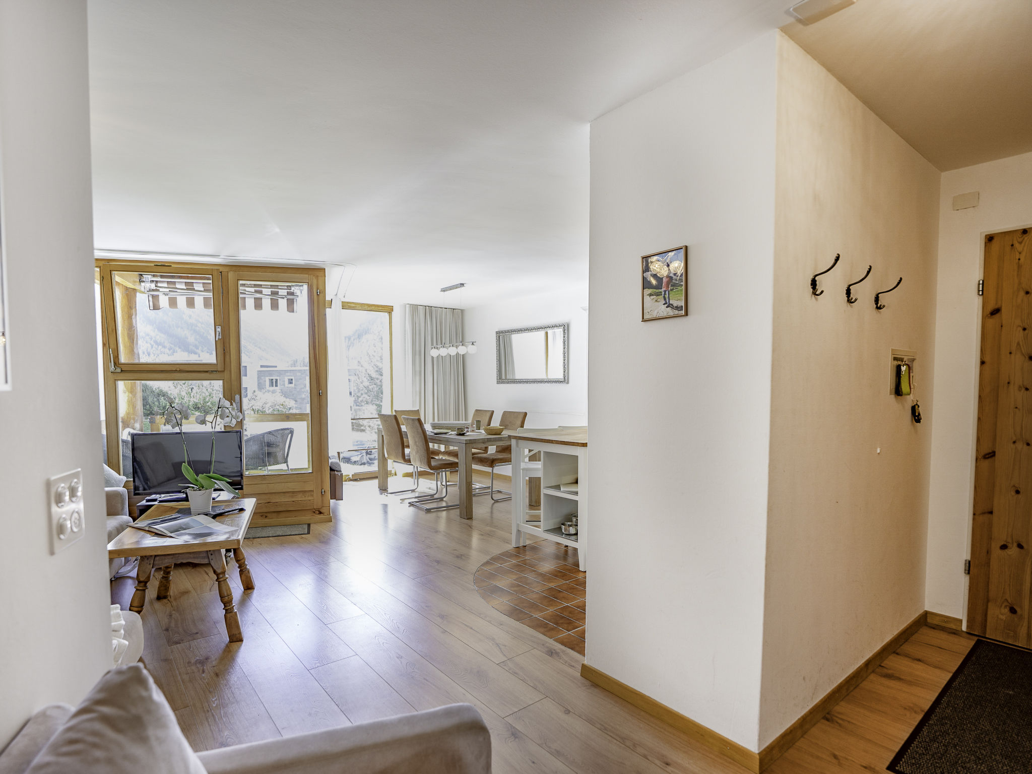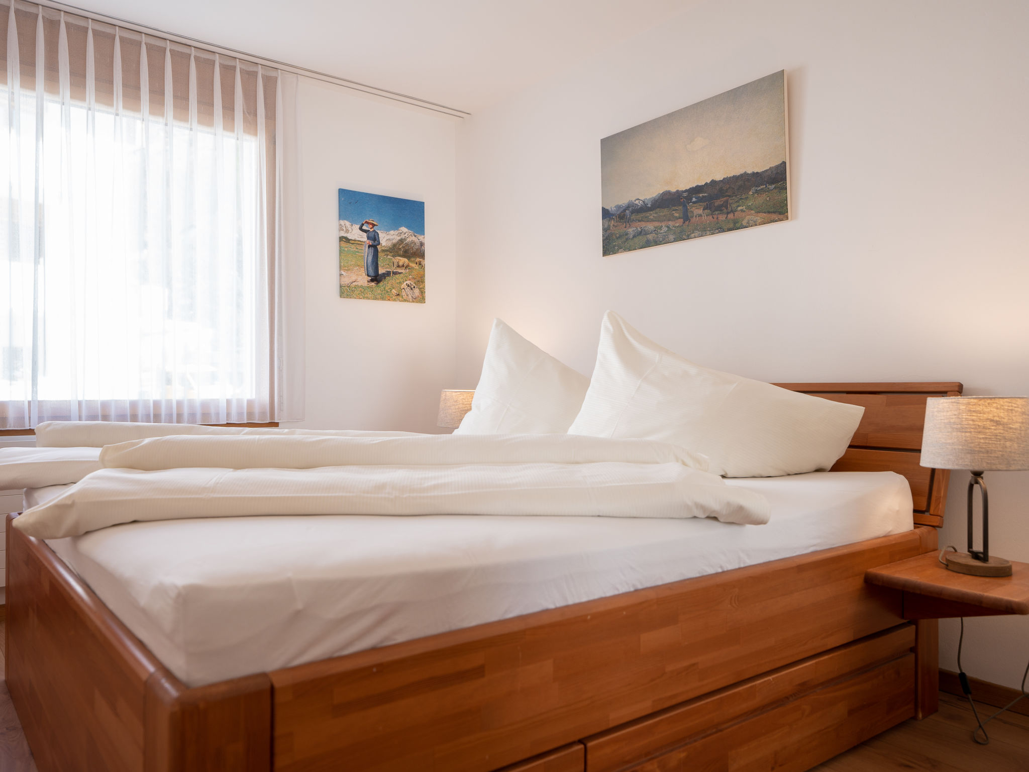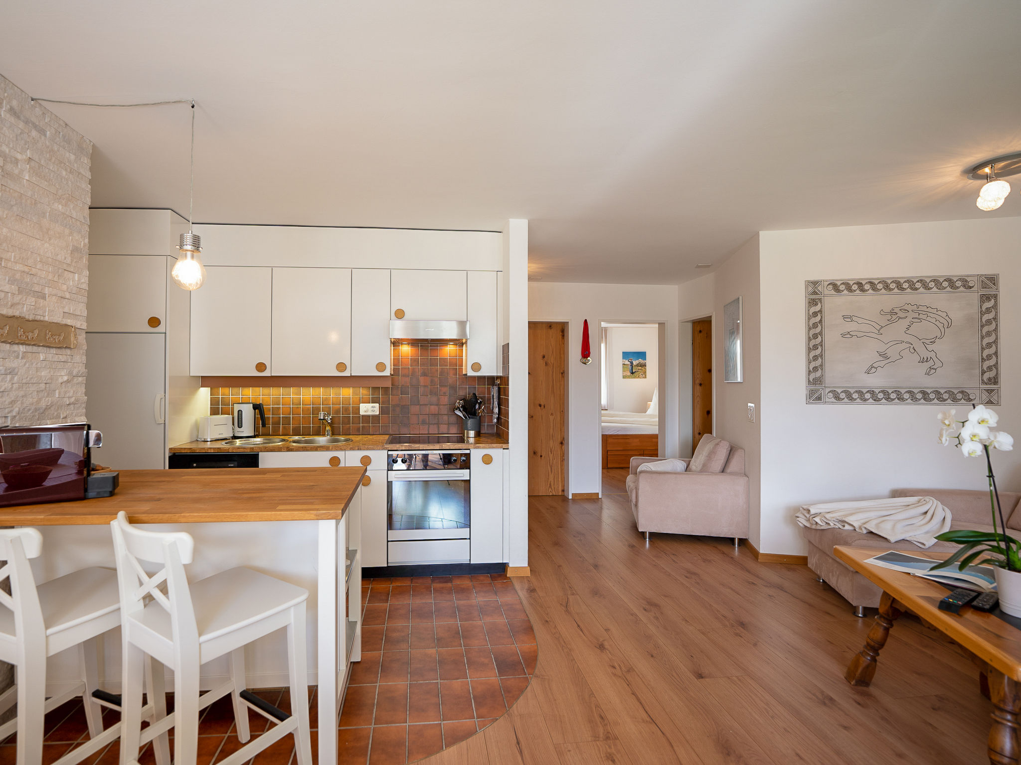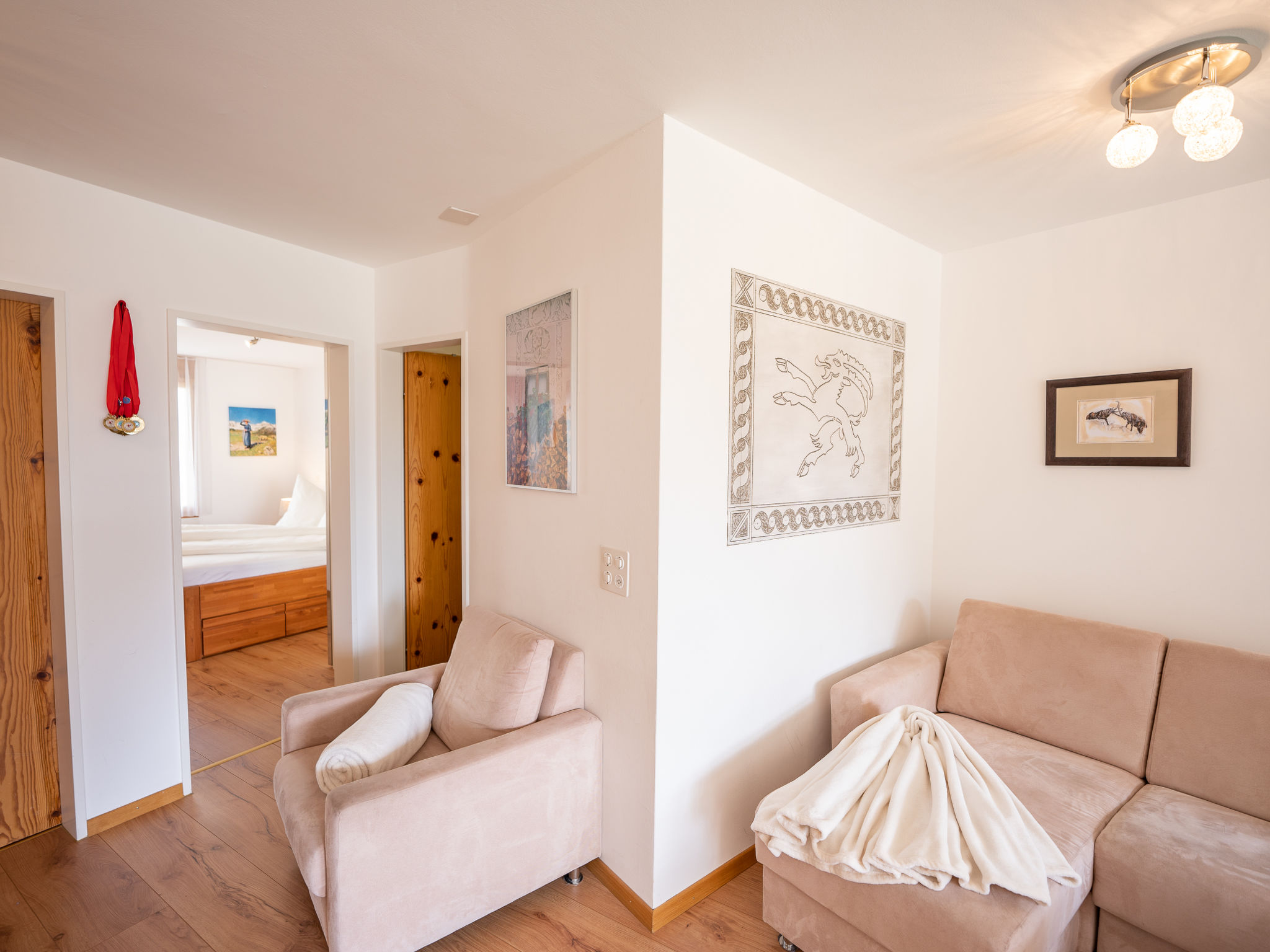 "Chesa Piz Cotschen 3", apt 2 pièces 60 m2 au 1er étage. Clair, aménagement moderne et plaisant: séjour/salle à manger avec table pour les repas et TV (écran plat). Sortie sur la loggia. 1 chambre double avec 1 lit double (2 x 90 cm, longueur 200 cm). Cuisine ouverte (four, lave-vaisselle, 4 plaques vitrocéramiques, grille-pain, bouilloire électrique, cafetière électrique, Capsules pour machine à café (Delizio Migros) (NON INCLUSES), appareil à raclette, service à fondue (fondue au fromage)). Douche/WC. Sol en bois. Mobilier de balcon. Belle vue sur les montagnes et les alentours. A disposition: lit bébé (en sus), sèche-cheveux. Internet (Connexion WIFI, gratuit). Garage No DIEAG (50m), hauteur 200 cm, largeur 220 cm. Veuillez noter: logement non-fumeur maison non-fumeur. Maximum 1 animal/ chien autorisé.