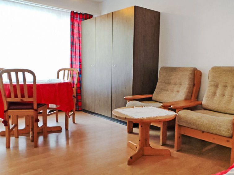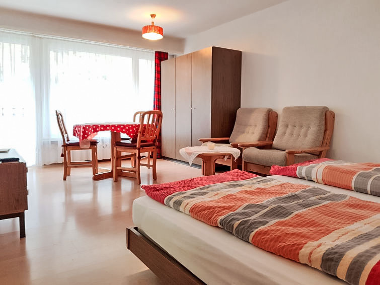 Studio 30 m2, au rez-de-chaussée. Aménagement simple et fonctionnel: séjour/chambre à coucher avec 1 lit double (2 x 90 cm, longueur 200 cm), table pour les repas, TV (câblée) et radio. Sortie sur le balcon. Cuisine (3 plaques de cuisson, grille-pain, bouilloire électrique, congélateur, cafetière électrique, service à fondue (fondue au fromage)). Bain/WC. Balcon 8 m2, situation est. Mobilier de balcon. Vue sur les montagnes. A disposition: sèche-cheveux. Internet (Connexion WIFI, gratuit). Veuillez noter: logement non-fumeur. Maximum 1 animal/ chien autorisé.