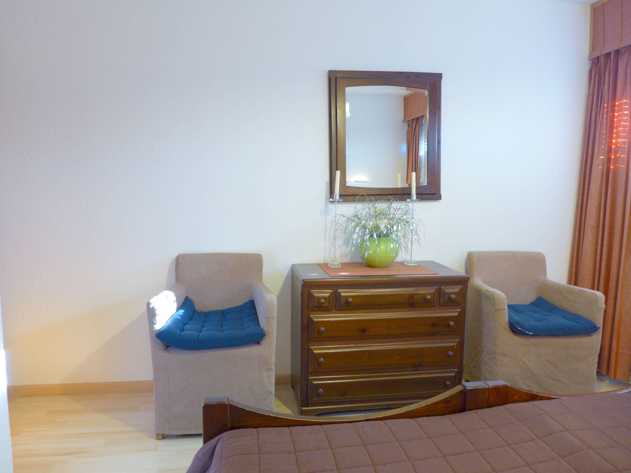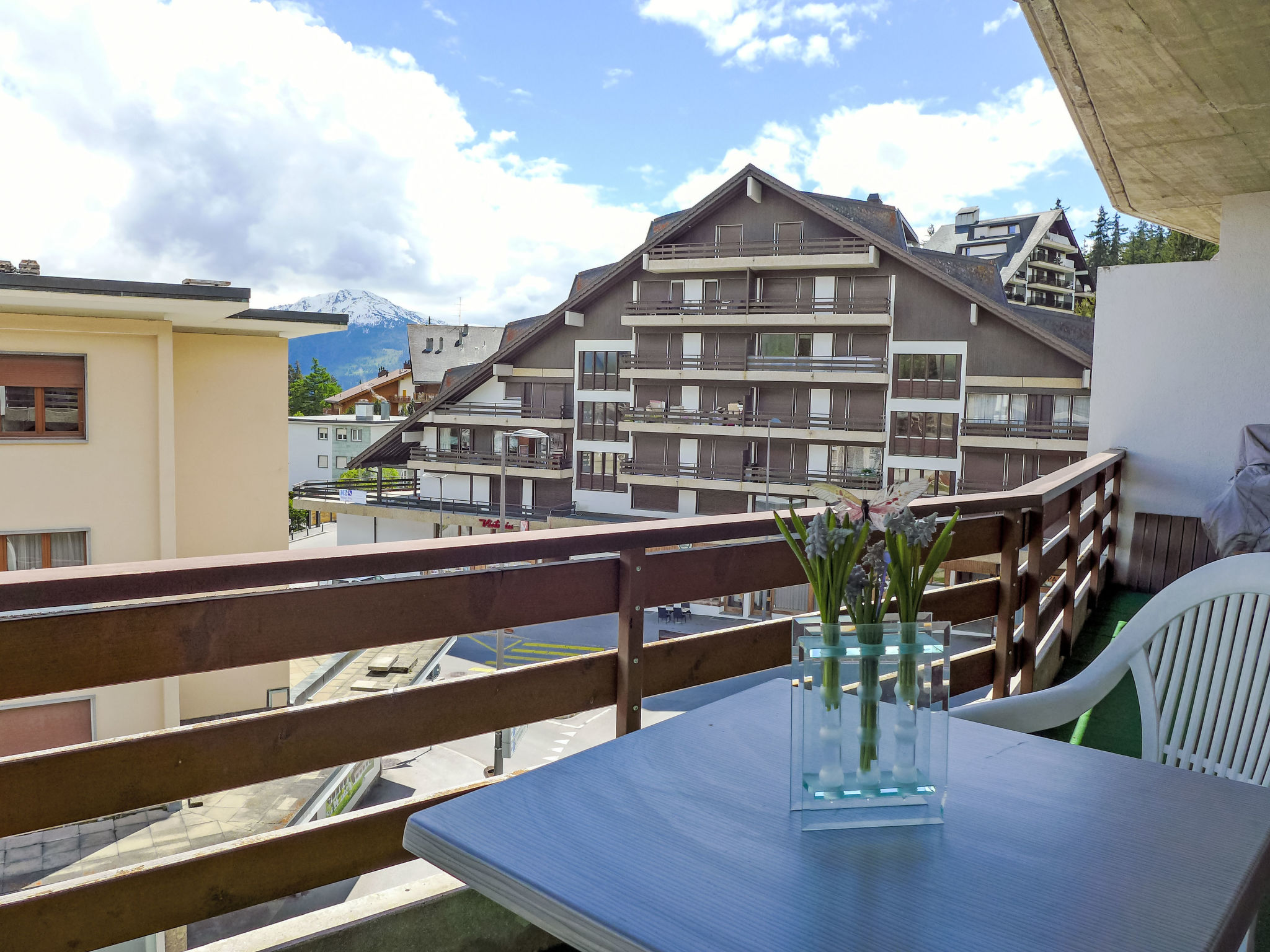 "Rond-Point 27", apt 2 pièces 46 m2 au 3ème étage, situation sud. Aménagement agréable: séjour/salle à manger orientée sud avec 1 divan-lit double (140 cm, longueur 190 cm), coin repas. Sortie sur le balcon. 1 chambre orientée sud avec 2 lits (90 cm, longueur 190 cm). Sortie sur le balcon. Cuisine ouverte (3 plaques de cuisson, four, micro-ondes, cafetière électrique) avec table pour les repas. Bain/bidet/WC. Chauffage au fuel. Balcon 8 m2, situation sud. Mobilier de balcon. Vue latérale sur les montagnes et la localité. A disposition: Internet (Connexion WIFI). Garage No 27. Veuillez noter: TV seulement CH.