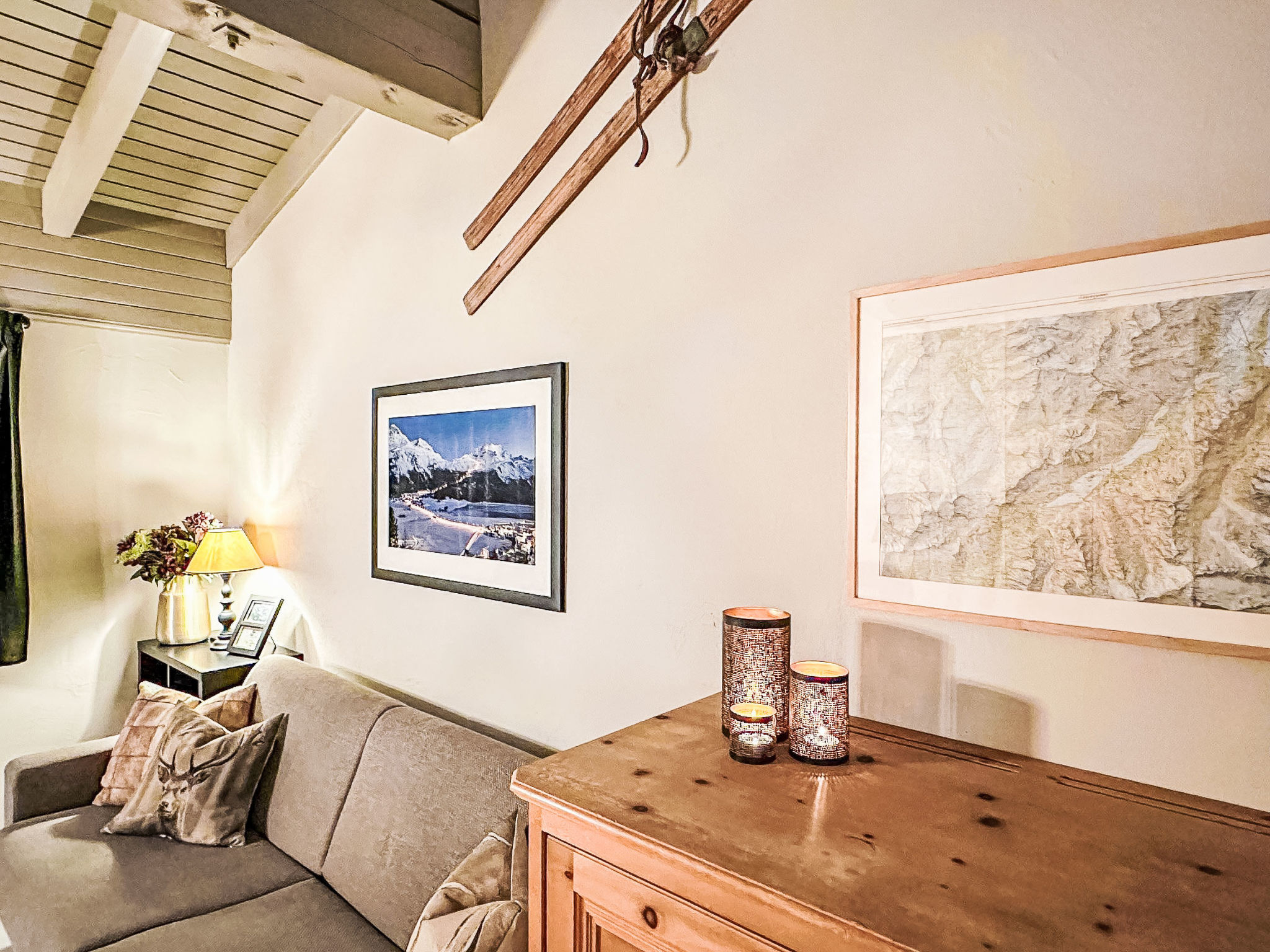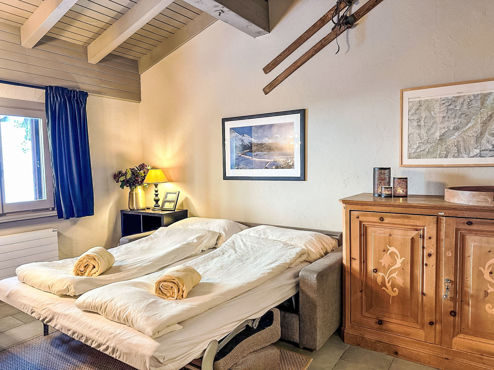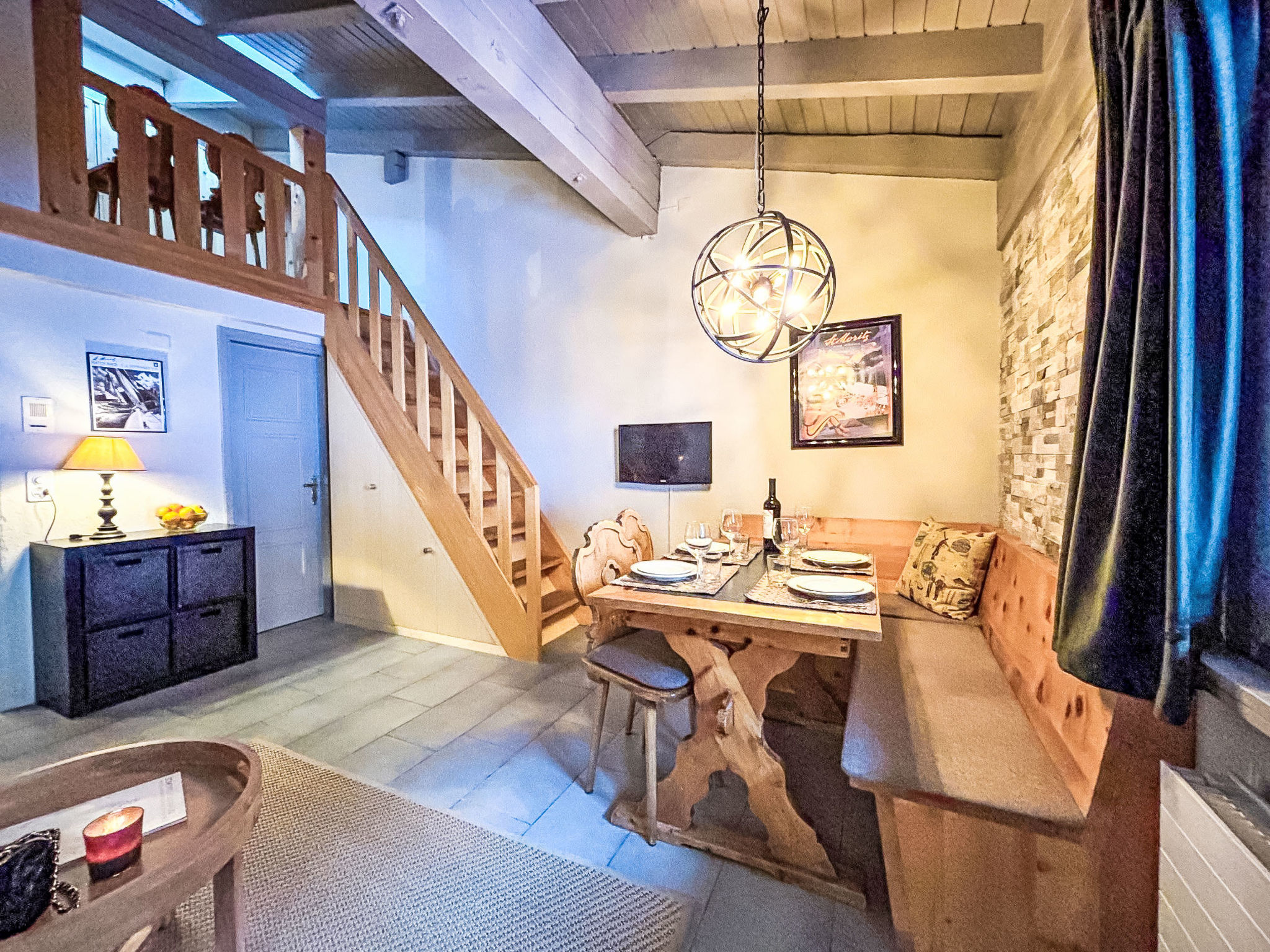 "Residenza Chesa Margun 24-1" studio 34 m2 sur 2 niveaux, situation nord. Rénové en 2024, aménagement confortable et agréable: séjour/salle à manger avec 1 divan-lit double (170 cm, longueur 200 cm), coin repas, TV (câblée), écran plat et radio. Cuisine dans l'entrée (4 plaques de cuisson, four, lave-vaisselle, 4 plaques vitrocéramiques, cafetière électrique, Capsules pour machine à café (Nespresso) (NON INCLUSES)). Douche/WC. À l'étage supérieur: galerie mansardée, ouverte avec fenêtre sous le toit avec 2 lits (80 cm, longueur 200 cm). A disposition: Internet (Connexion WIFI, gratuit). Veuillez noter: adapté(e) aux familles logement côté cour. Logement non-fumeur. Au lieu d'une chambre fermée, des espaces de couchage sont situés dans une zone ouverte (galerie, alcôve...).