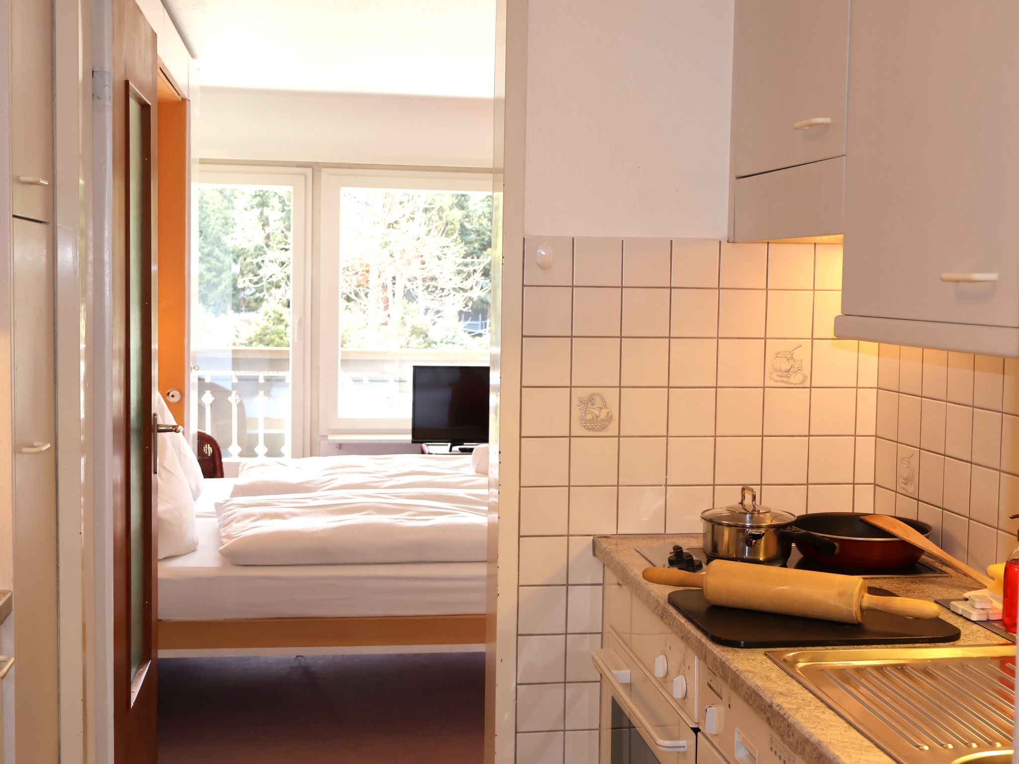 Studio 33 m2, situation sud. Clair, aménagement simple et plaisant: séjour/chambre à coucher avec 2 lits armoires (90 cm, longueur 200 cm), table pour les repas et Télévision numérique. Sortie sur le balcon, orientée sud. Cuisine (2 plaques de cuisson, four, lave-vaisselle, micro-ondes, congélateur, cafetière électrique). Bain/WC. Chauffage. Balcon, situation sud. Mobilier de balcon. Belle vue sur le Cervin. Veuillez noter: logement non-fumeur.