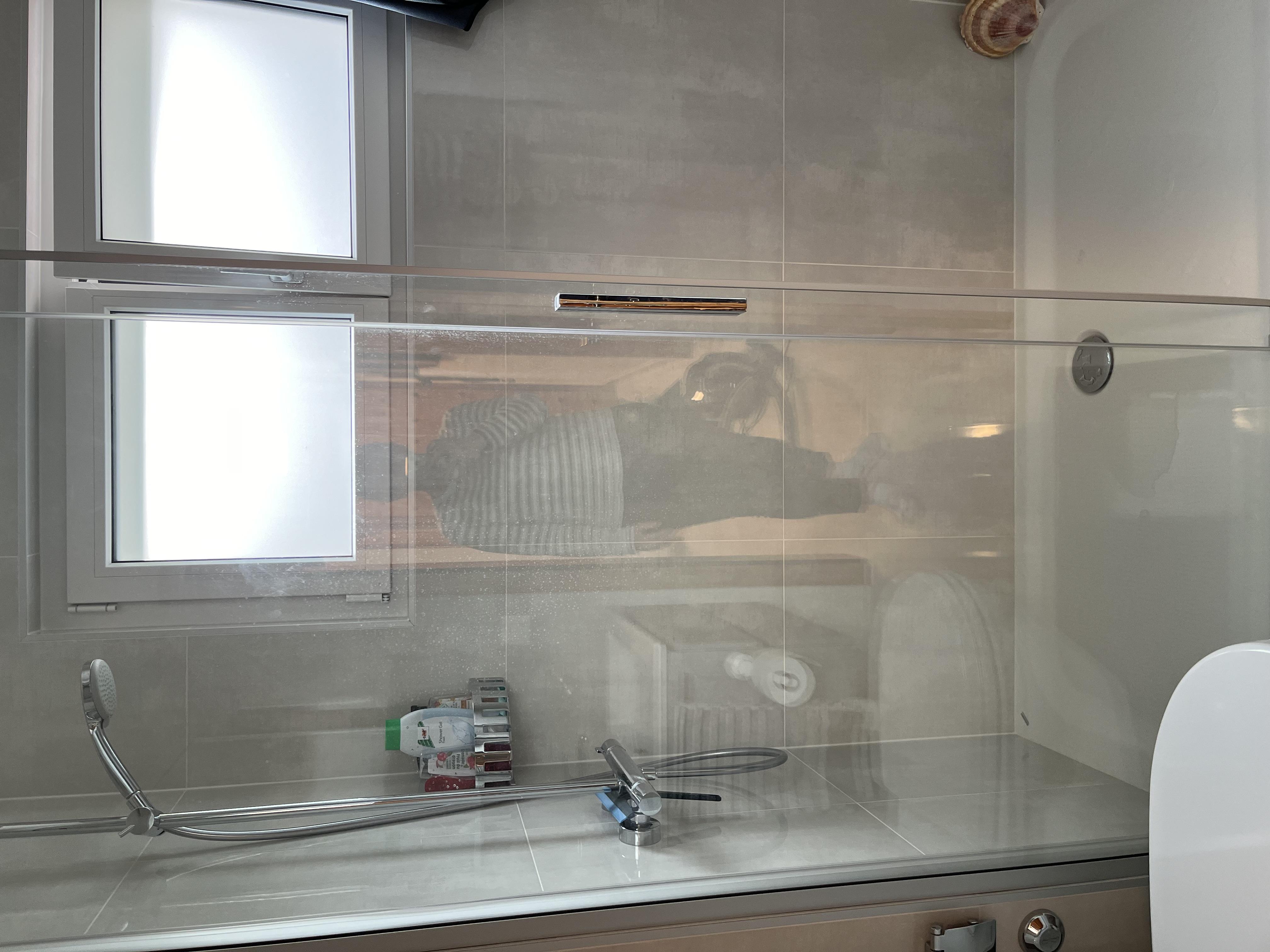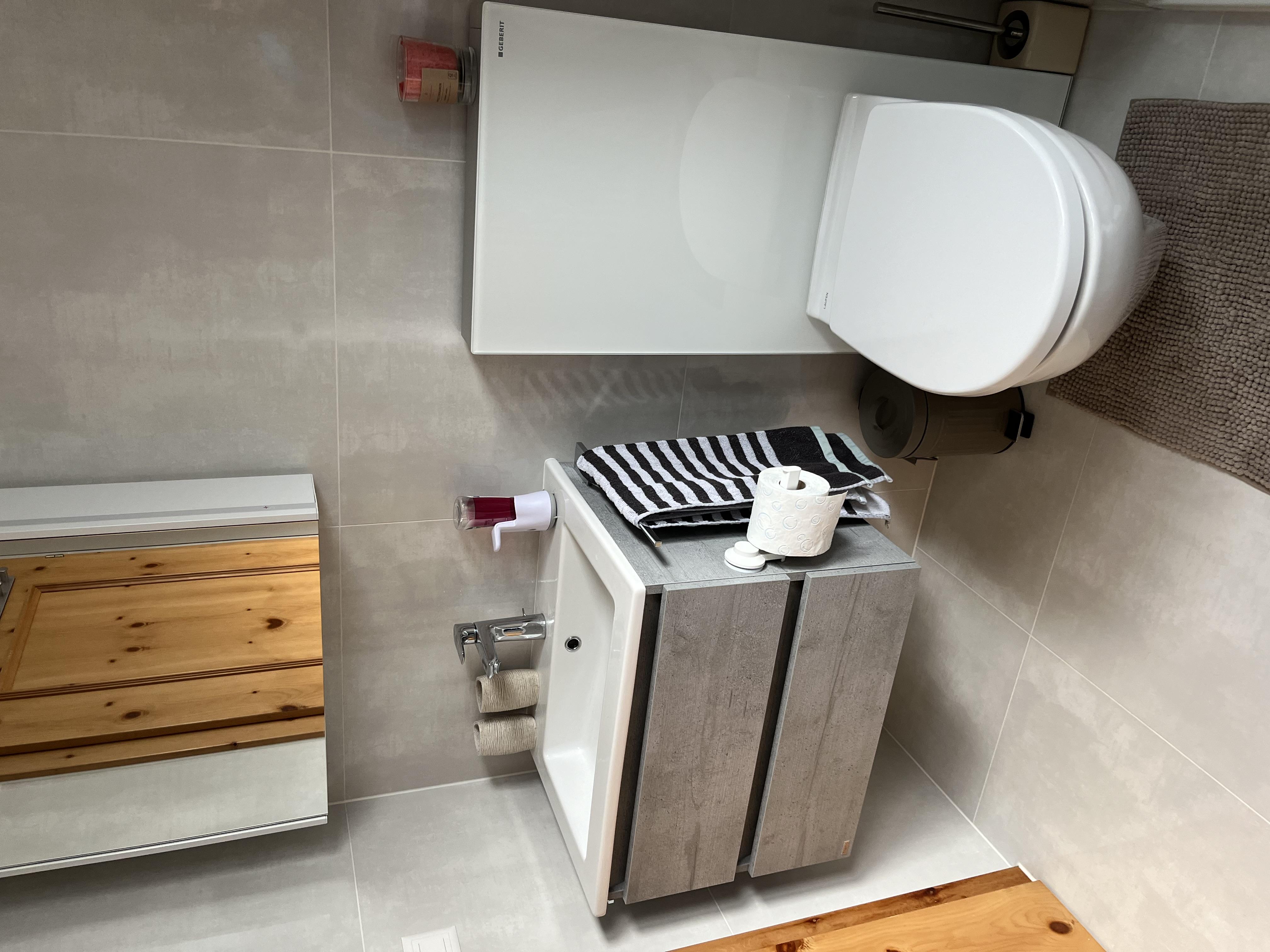 * Helles Badezimmer mit WC, Lavabo, grosser Regen-Dusche, Shampoo/Duschmittel/Conditioner/WC-Papier vorhanden