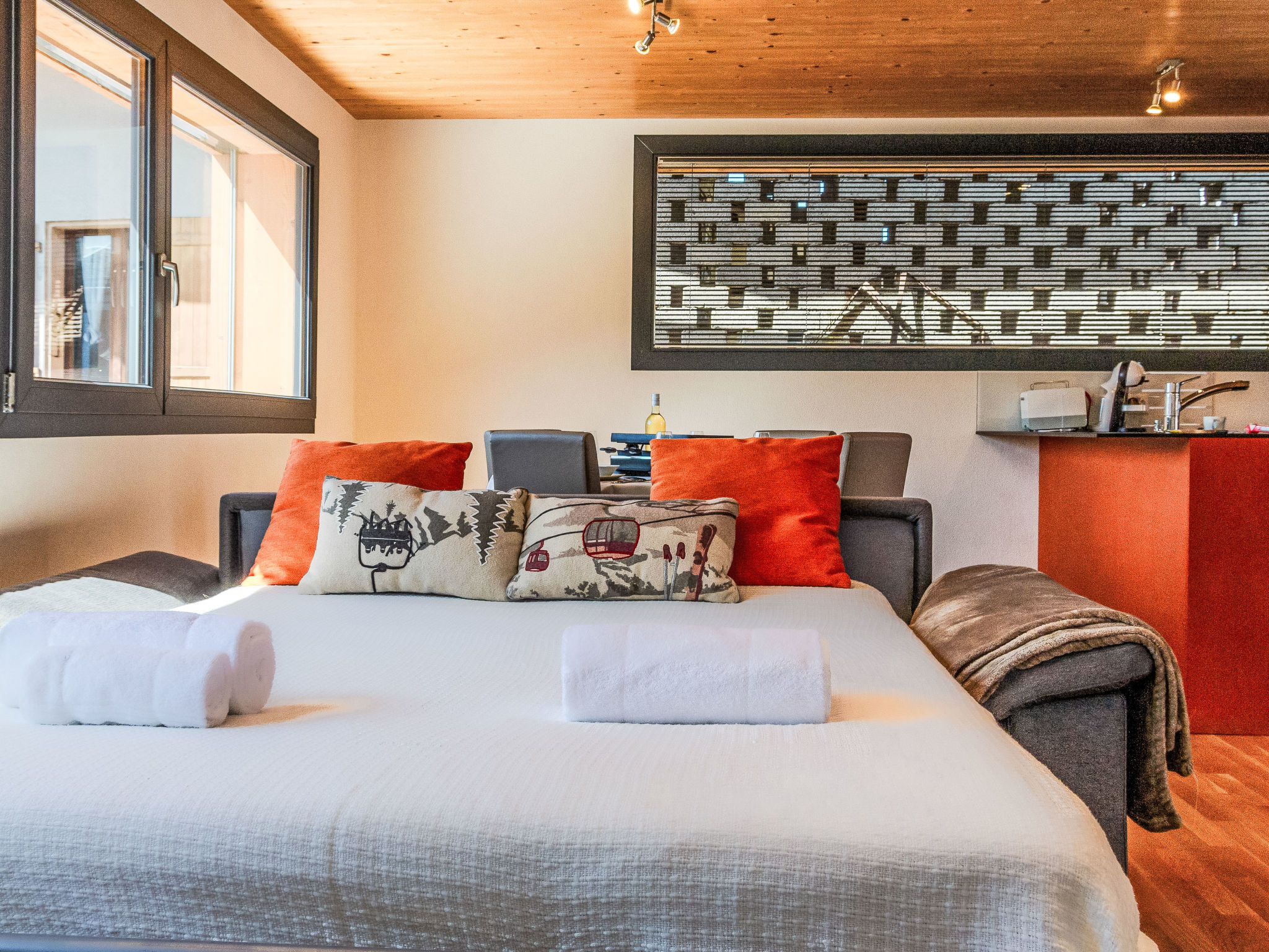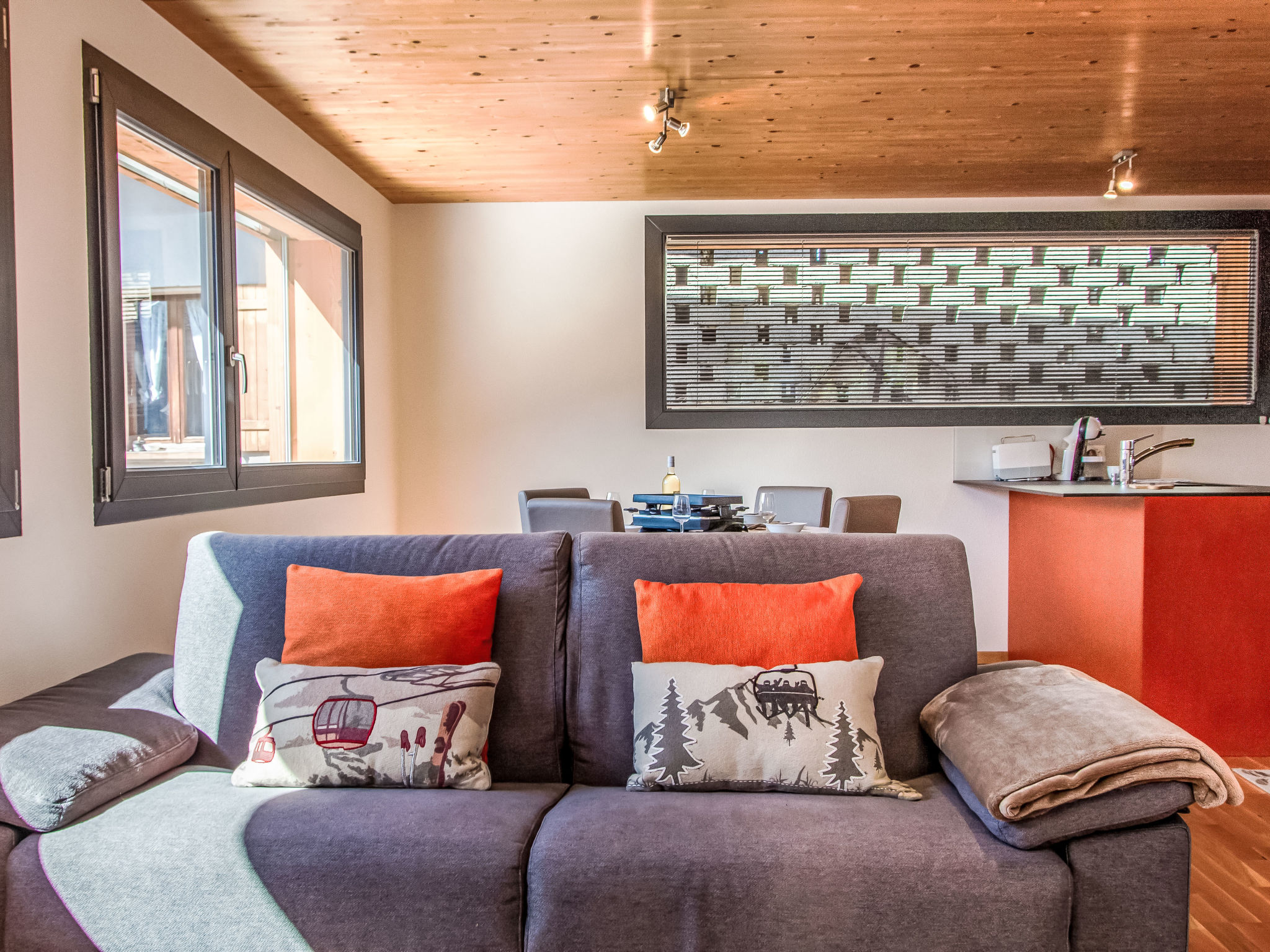 "Le Raccard", chalet 2 locali 65 m2 su 2 piani. Luminoso, completamente restaurato nel 2019, arredamento molto confortevole e romantico: soggiorno/sala da pranzo 36 m2 con 1 divano letto (160 cm, lunghezza 200 cm), TV (via cavo) e radio. Cucina aperta (forno, lavastoviglie, 4 piastre ad induzione, forno a microonde, macchina da caffè elettrica, capsule per la macchina da caffè (Dolce Gusto) extra, set per raclette, set per fondue (chinoise, formaggio)). WC separato. Riscaldamento a gas. Piano superiore: 1 camera mansardata, aperta grande, altezza del soffitto 120 - 300 cm con 1 letto alla francese (160 cm, lunghezza 200 cm), doccia/WC. Piccola terrazza 15 m2, esposizione sud. Mobili da terrazza. Splendida vista sulle montagne. A disposizione: lavatrice, asciugatrice. Internet (wifi, gratis). Prego notare: non adatto a bambini al di sotto dei 6 anni. Appartamento per non fumatori.