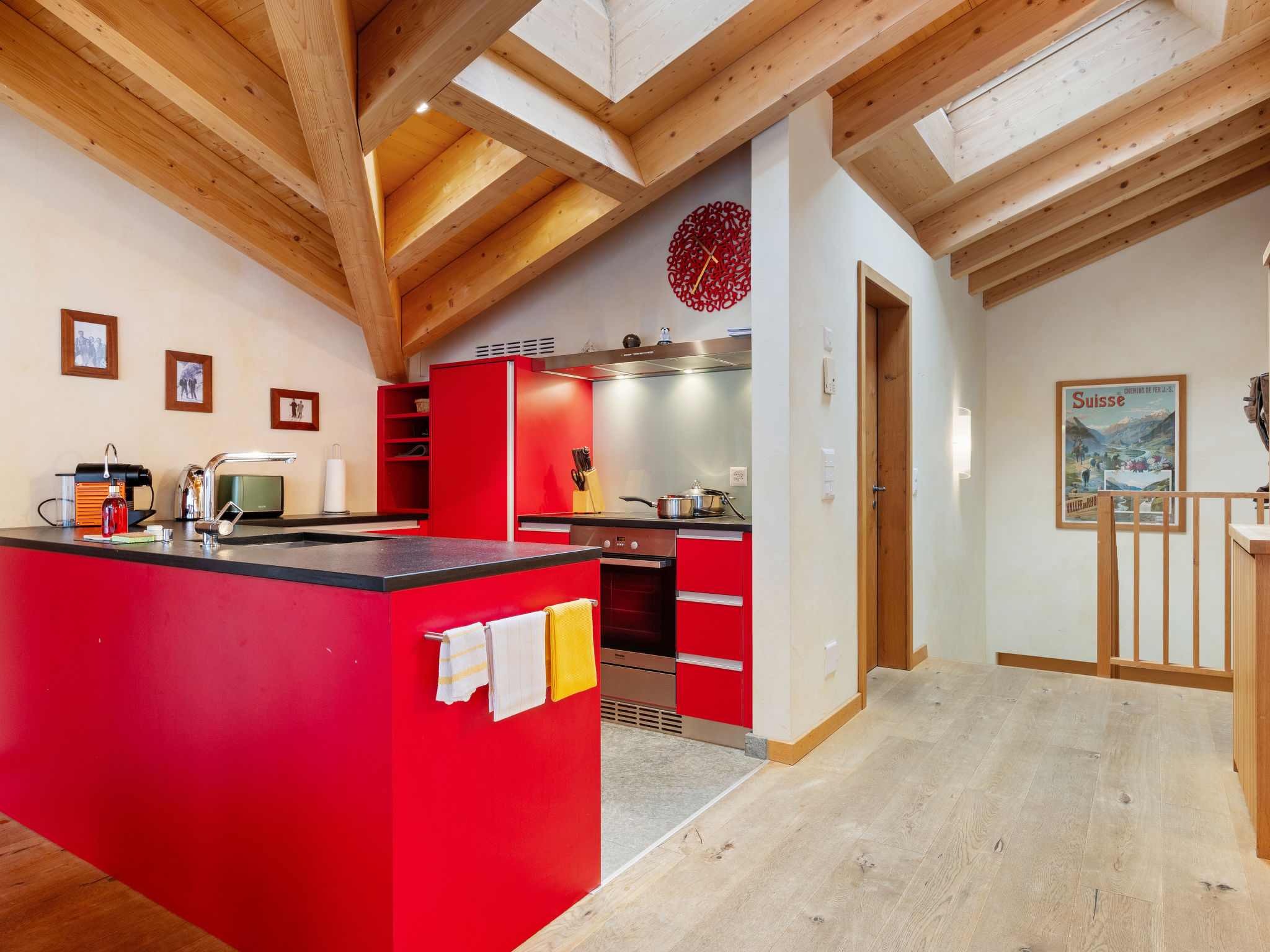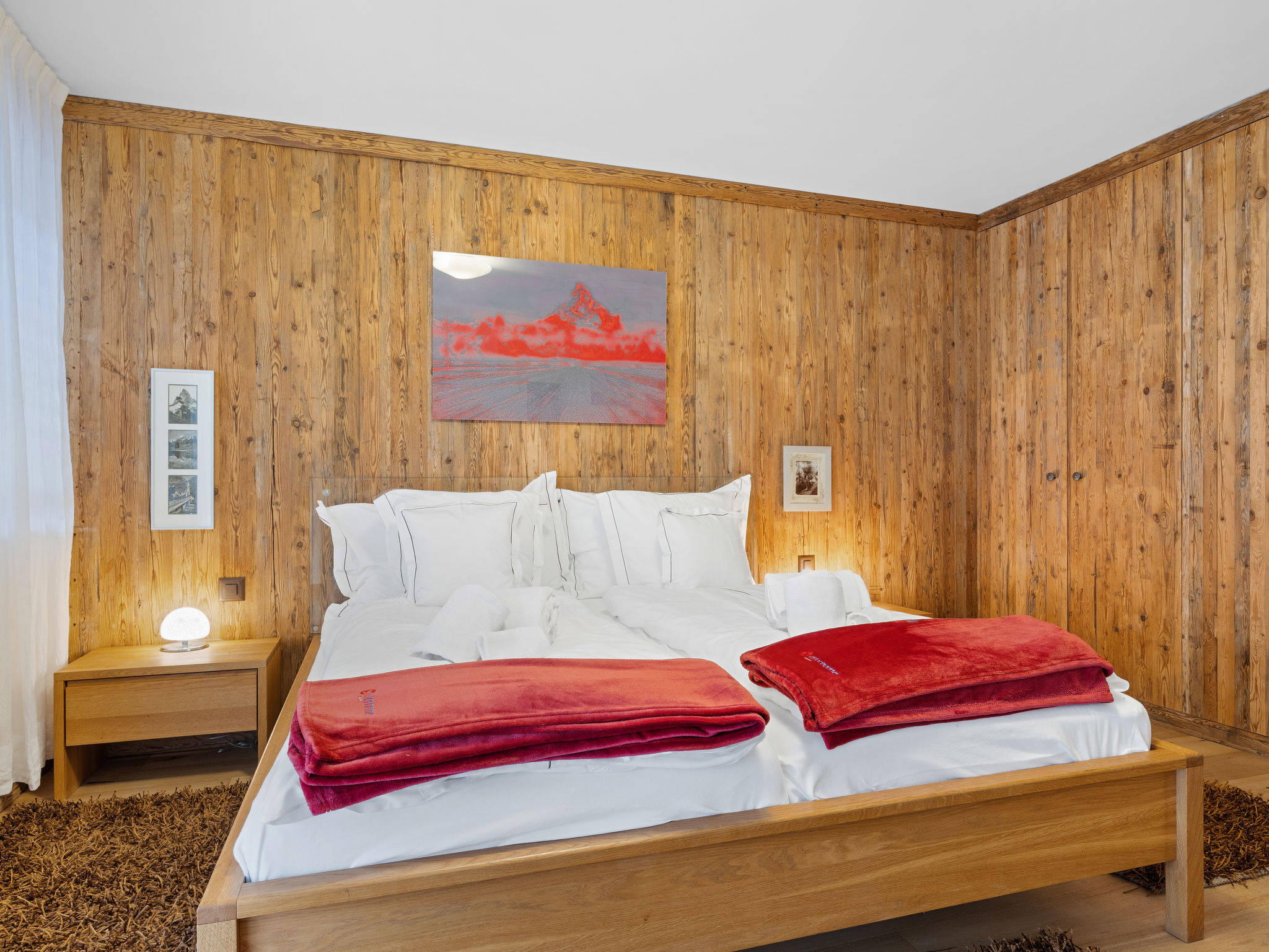 Apt. di 8 locali 255 m2 su 2 piani al 3. piano. Arredamento lussuoso e accogliente: 2 camere matrimoniali, ogni camera con 1 letto doppio e TV. Soggiorno/sala da pranzo con camino, tavolo da pranzo, TV, radio, CD e DVD. Uscita sul balcone. Cucina aperta (forno, lavastoviglie, 4 piastre ad induzione, tostapane, bollitore elettrico, congelatore, macchina da caffè elettrica, capsule per la macchina da caffè (Nespresso) extra, set per raclette, set per fondue (formaggio)). 2 vasca/WC, vasca idromassaggio. Piano inferiore: 3 camere matrimoniali, ogni camera con 1 letto doppio. 1 camera con 2 letti (90 cm, lunghezza 200 cm). 2 vasca/WC, vasca idromassaggio. Balcone 14 m2, esposizione sud balcone 12 m2, esposizione sud. Mobili da balcone. Vista Cervino. A disposizione: cassaforte, asciugacapelli. Internet (wifi, gratis). Prego notare: appartamento per non fumatori. Combinazione (porta comunicante) da 2 appartamenti duplex.