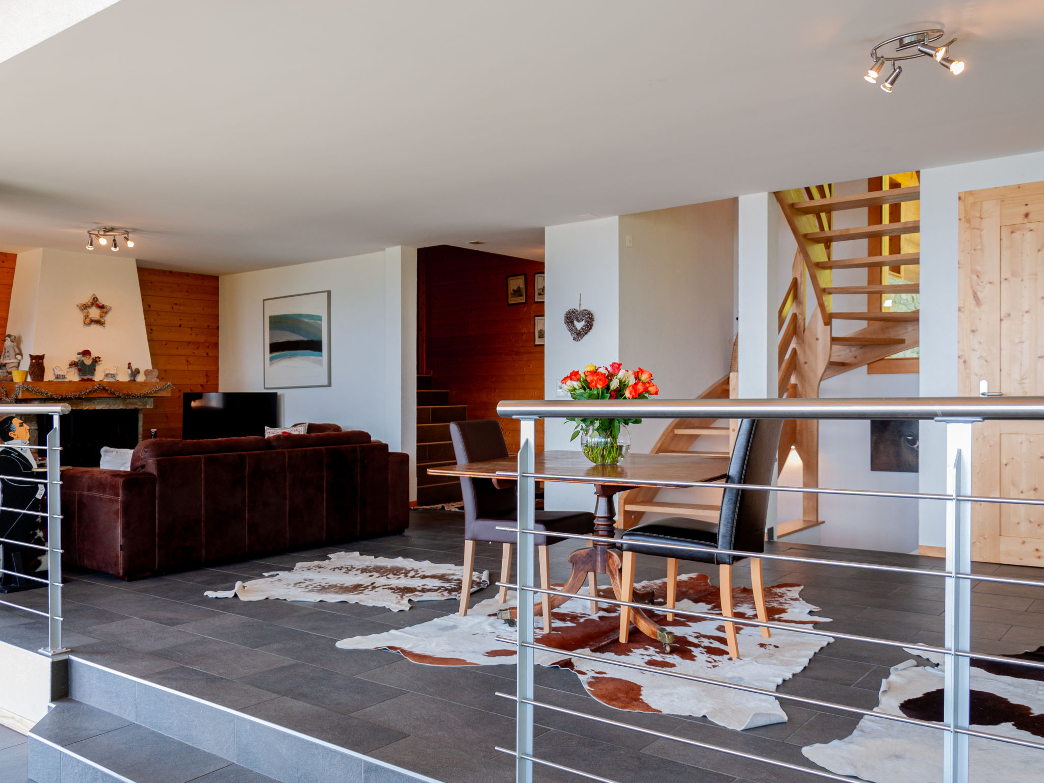 "Chalet Arvine", chalet 5 locali 200 m2 su 3 piani. Arredamento gradevole e di buon gusto: ingresso. Soggiorno/sala da pranzo grande 80 m2 con finestra panoramica con camino, tavolo da pranzo, TV (via cavo) e impianto stereo. Uscita sul balcone, sulla terrazza. Cucina aperta (forno, lavastoviglie, 4 piastre cottura in vetroceramica, tostapane, bollitore elettrico, forno a microonde, macchina da caffè elettrica, capsule per la macchina da caffè (Nespresso) extra, set per raclette, set per fondue (chinoise, formaggio)). WC separato. Riscaldamento. Piano inferiore: 1 camera con 1 letto alla francese (160 cm, lunghezza 200 cm), vasca/WC. 1 camera con 2 letti (90 cm, lunghezza 200 cm), doccia/WC. Piano superiore: 1 camera grande con 1 letto alla francese (180 cm, lunghezza 200 cm), vasca/WC e lavabo doppio. 1 camera grande con 1 letto alla francese (160 cm, lunghezza 200 cm), vasca/WC. Mobili da terrazza, barbecue, sedie a sdraio (2). Vista panoramica sulle montagne, sulla valle e sulla località. A disposizione: lavatrice, asciugatrice, seggiolone, lettino per bimbi. Internet (wifi, gratis). Parcheggio (3 Auto). Prego notare: appartamento per non fumatori. 1 posto auto nel parcheggio sotterraneo Télé-Nendaz disponibile in inverno.