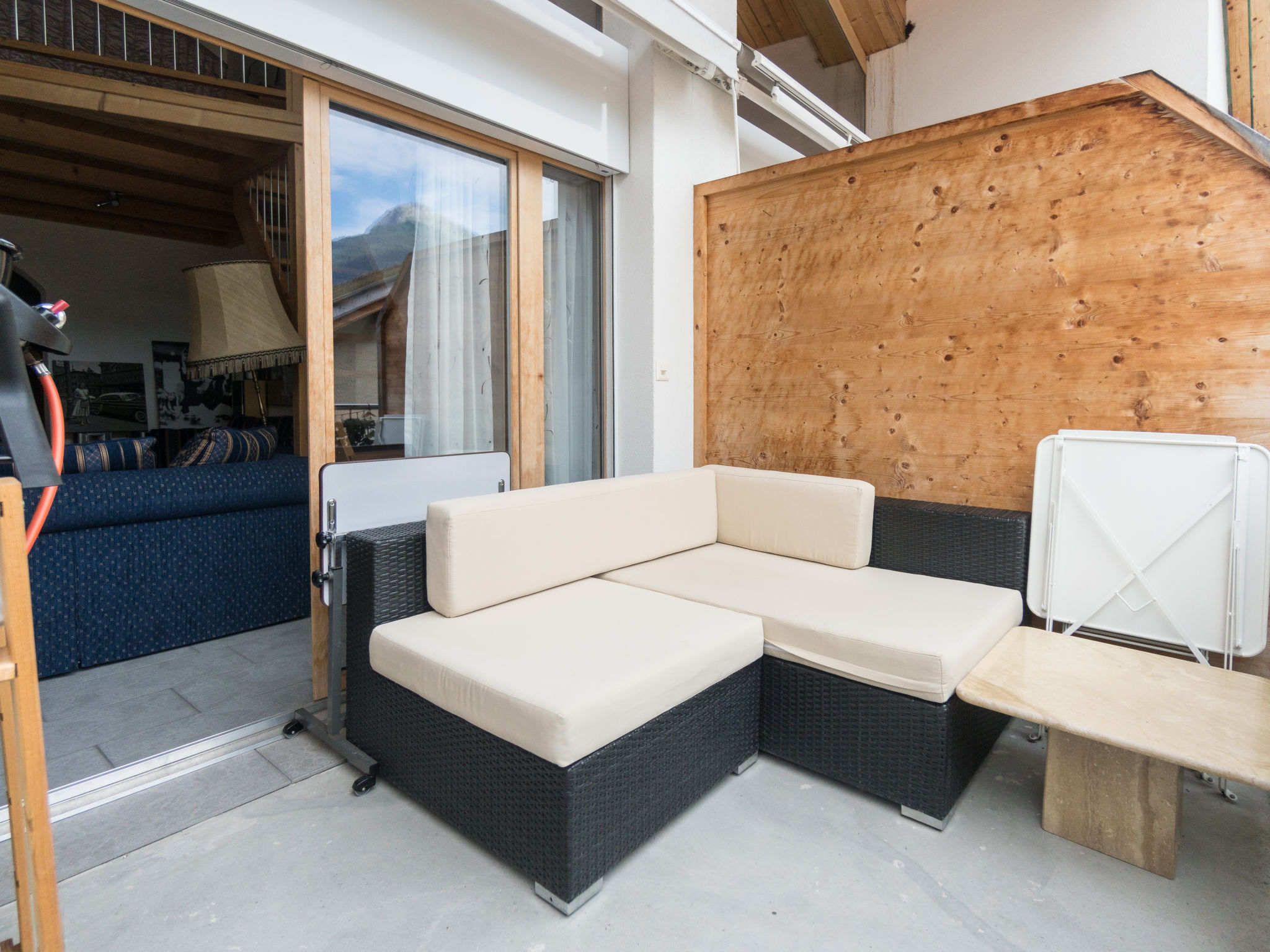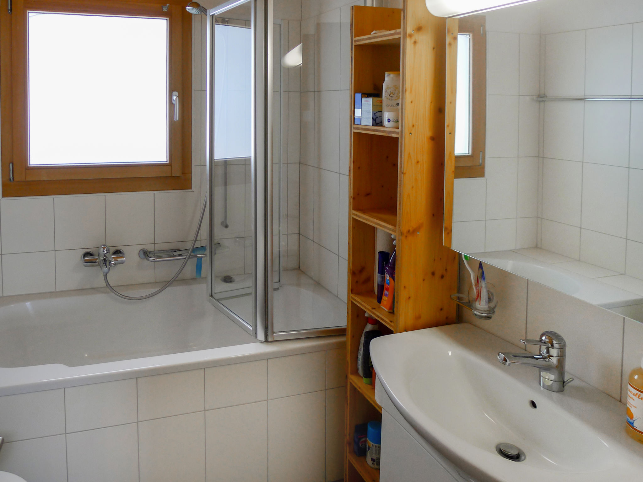 Apt. di 3 locali 77 m2 su 2 piani al 1. piano. Arredamento confortevole e accogliente: soggiorno/sala da pranzo con 1 posto letto e TV (satellite) (schermo piatto). Uscita sul balcone. 2 camere, ogni camera con 1 letto doppio. Cucina aperta (forno, lavastoviglie, 4 piastre cottura in vetroceramica, bollitore elettrico, forno a microonde, macchina da caffè elettrica, set per fondue (formaggio)). Vasca/WC. Piano superiore: (scala ripida) soppalco mansardato, aperto con 1 letto alla francese. Balcone 7 m2. Mobili da balcone, ripostiglio. Bella vista sulle montagne, sul paesaggio e sulla località. A disposizione: lavatrice, asciugatrice. Internet (wifi, gratis). Parcheggio (1 Auto), garage nr. 2 (1 Auto) vicino alla casa. Prego notare: appartamento per non fumatori. Uno o più posti letto adibiti a zona notte si trovano in area aperta o di passaggio (come soppalco, corridoio, alcova e simili).