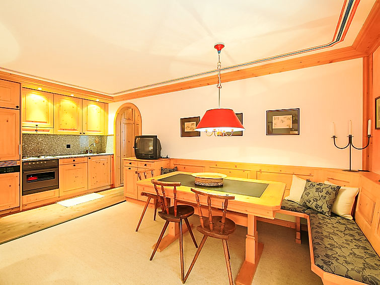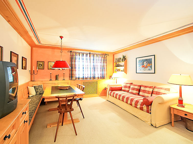 "Residenza Chesa Margun 57-4", apt. di 2 locali 47 m2, esposizione nord. Arredamento rustico e accogliente: soggiorno/sala da pranzo con TV e radio. 1 camera con 2 letti. Cucina aperta (forno, lavastoviglie). Vasca/WC. Vista sulle montagne, sulla località e sul bosco. Prego notare: appartamento per non fumatori.