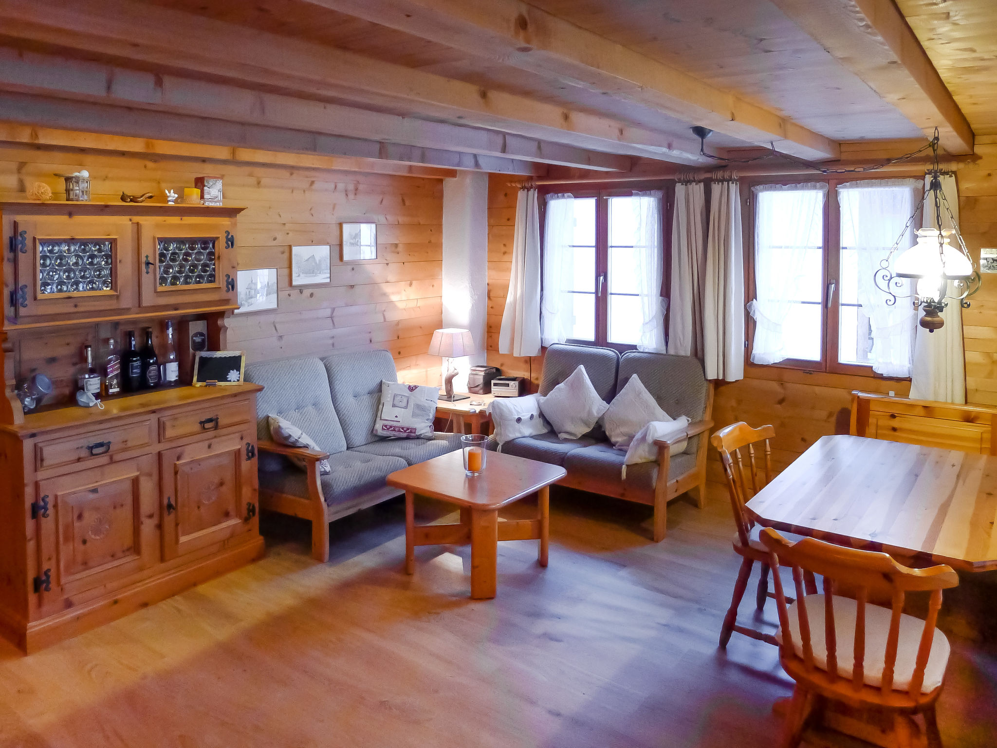 Apt. di 4 locali 75 m2 al 2. piano. Arredamento rustico e accogliente: soggiorno/sala da pranzo con stufa svedese e radio. Uscita sul balcone. Camera di passaggio con 2 divani letto, tv digitale, schermo piatto e DVD. 1 camera con 2 letti e lavabo. Uscita verso il patio. 1 camera piccola con 1 x 2 letti a castello. Cucina aperta (3 punti cottura, forno, lavastoviglie, tostapane, forno a microonde, set per raclette, set per fondue (formaggio)). Vasca/WC. Riscaldamento elettrico, riscaldamento a legna, boiler (150 litri). Pavimenti in legno. Balcone 13 m2, patio 15 m2. Mobili da balcone. Bella vista sulle montagne, sul paesaggio e sulla località. A disposizione: Internet (wifi, gratis). Parcheggio (coperto). Prego notare: appartamento per non fumatori.