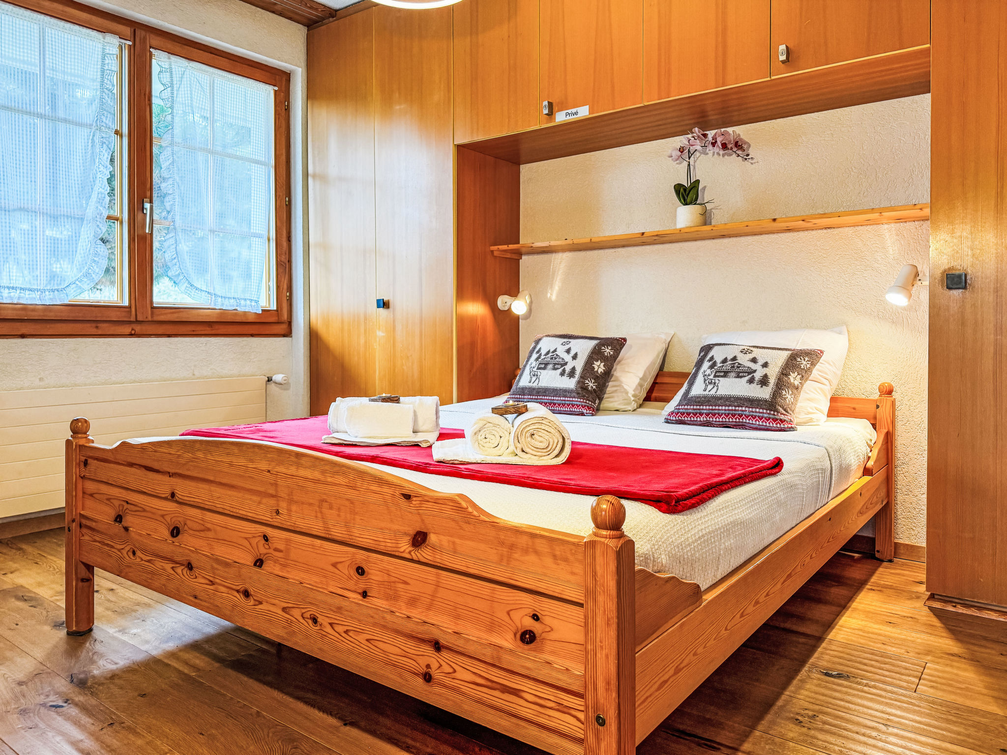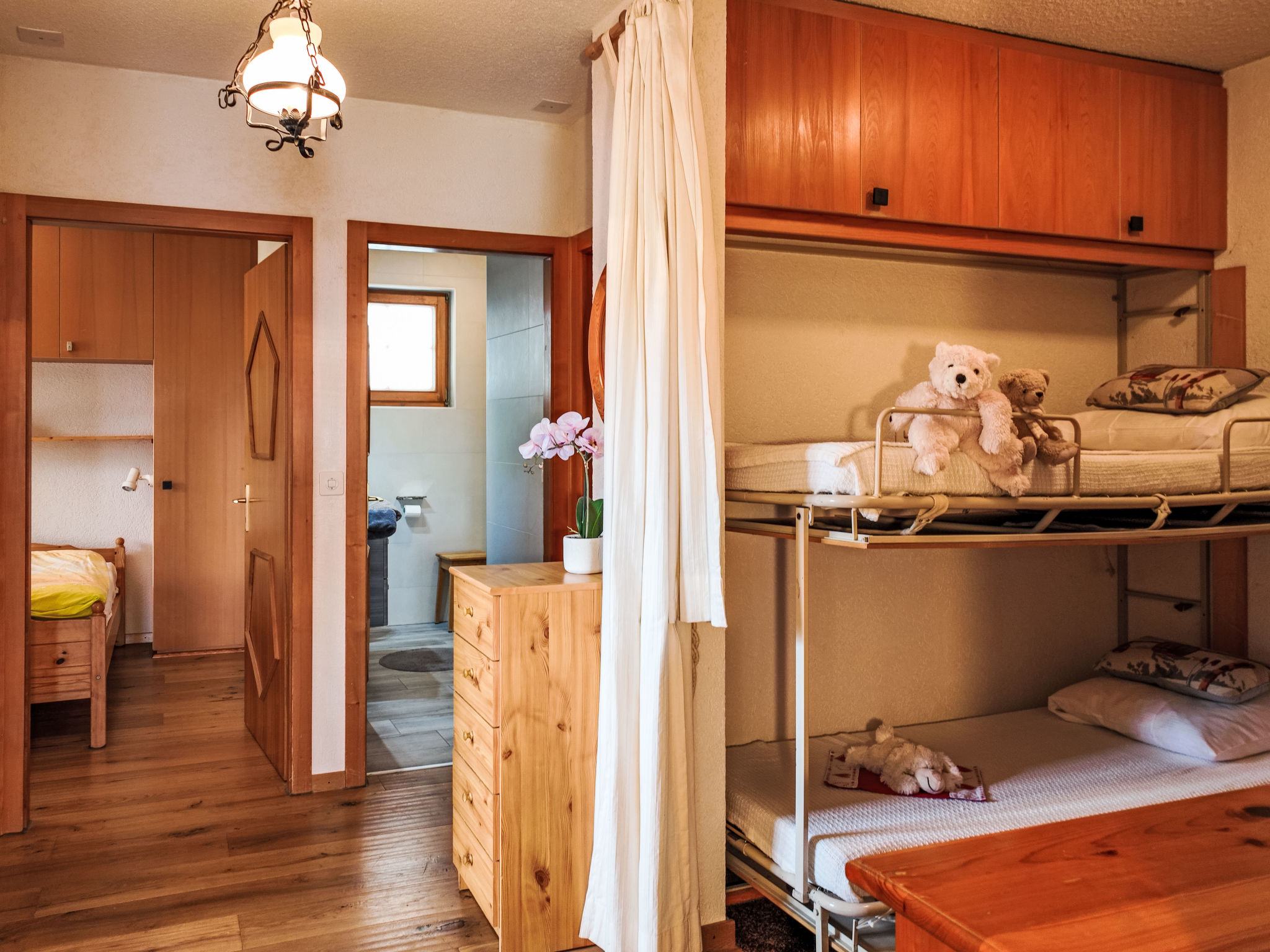"Chamois AZ1", apt. di 3 locali 80 m2, al pianterreno. Oggetto adatto a 4 adulti + 2 bambini. Luminoso, arredamento funzionale e confortevole: ingresso con 2 letti pieghevoli (80 cm, lunghezza 190 cm). Soggiorno/sala da pranzo con TV, CD e DVD. Uscita sul giardino, sulla terrazza. 1 camera con 2 letti (80 cm, lunghezza 190 cm). 1 camera con 1 letto alla francese (160 cm, lunghezza 200 cm). Cucina aperta (forno, lavastoviglie, 4 piastre cottura in vetroceramica, tostapane, bollitore elettrico, forno a microonde, macchina da caffè elettrica, capsule per la macchina da caffè (Nespresso) extra, set per raclette, set per fondue (formaggio)). Vasca/WC, doccia/WC. Piccola terrazza, giardino, esposizione nord e esposizione est. Bella vista sulle montagne. A disposizione: asciugacapelli. Internet (wifi, gratis). Prego notare: appartamento per non fumatori. Uno o più posti letto adibiti a zona notte si trovano in area aperta o di passaggio (come soppalco, corridoio, alcova e simili).