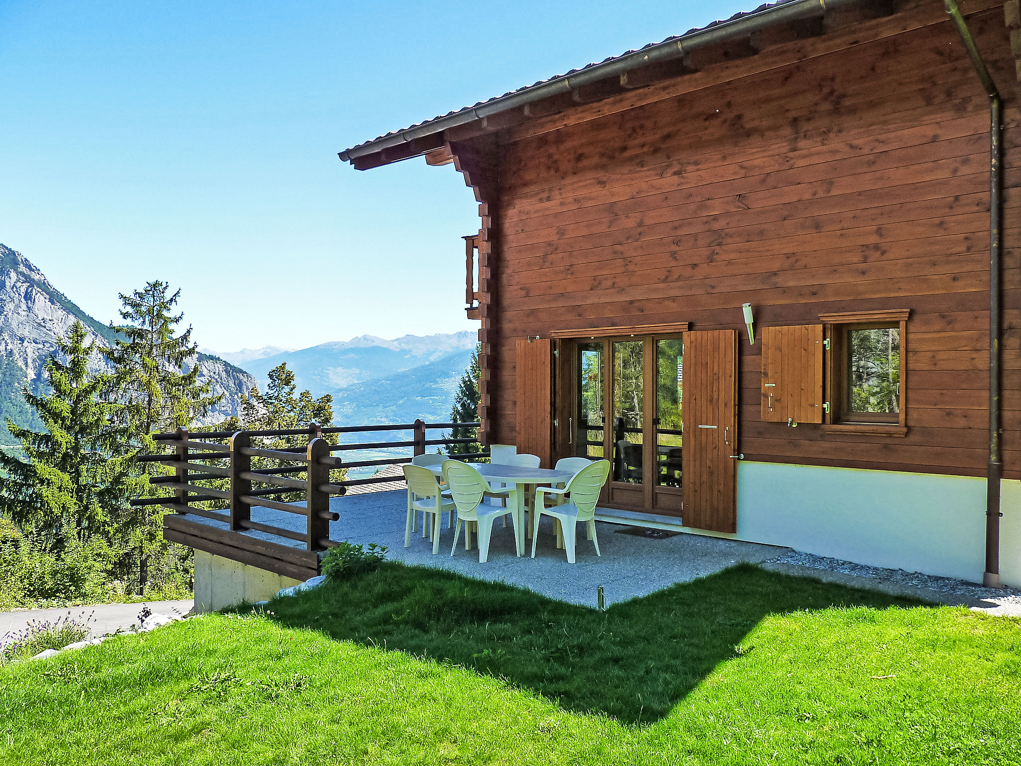 "Escapade", chalet 4 locali 100 m2 su 2 piani. Arredamento confortevole e di buon gusto: ingresso. Soggiorno/sala da pranzo con camino, TV (satellite), schermo piatto, CD, impianto stereo e DVD. Uscita sulla terrazza, esposizione sud. Cucina aperta (forno, lavastoviglie, 4 piastre cottura in vetroceramica, forno a microonde, congelatore, macchina da caffè elettrica, capsule per la macchina da caffè (Nespresso) extra, set per raclette, set per fondue (chinoise, formaggio)) con bancone. Doccia/WC. Piano superiore: 1 camera con 1 letto alla francese (160 cm, lunghezza 200 cm), radio. Uscita sul balcone. 1 camera con 1 letto alla francese (160 cm, lunghezza 200 cm), radio. Uscita sul balcone. 1 camera con 1 letto estraibile (2 pers. 2 x 90 cm, lunghezza 200 cm), radio. Vasca/WC. Grande terrazza 60 m2. Mobili da terrazza, barbecue, sedie a sdraio (6), ripostiglio. Splendida vista sulle montagne e sulla valle. A disposizione: lavatrice, asciugatrice, ferro da stiro, seggiolone, lettino per bimbi fino 3 anni, asciugacapelli, legna (gratis). Parcheggio (2 Auto), garage. Prego notare: appartamento per non fumatori.