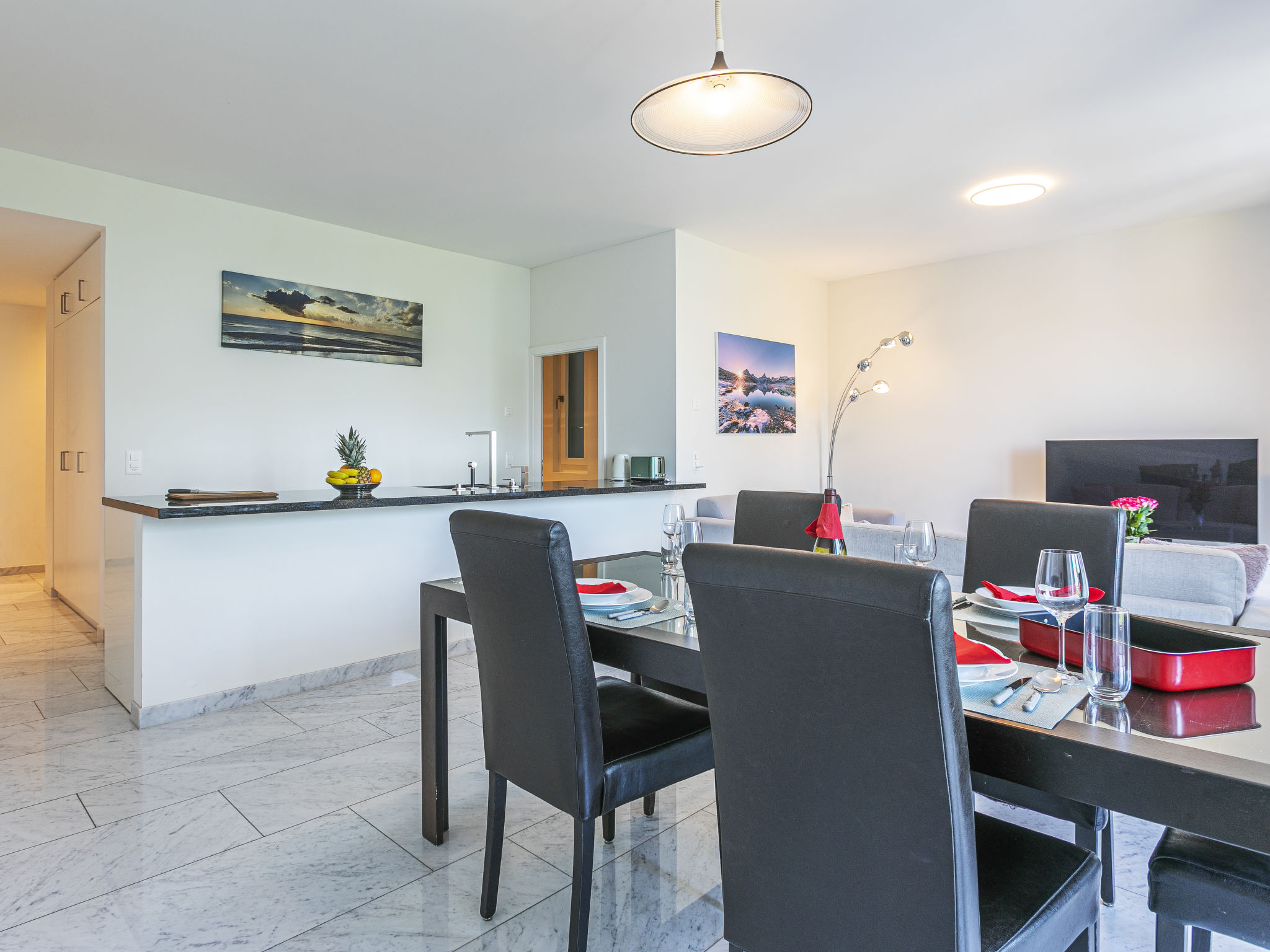 "Le Jazz", apt. di 3 locali 101 m2 al 3. piano. Arredamento confortevole e di buon gusto: soggiorno/sala da pranzo con TV (via cavo) (schermo piatto). Uscita sul balcone. 1 camera con 1 letto doppio (160 cm, lunghezza 200 cm), vasca/WC, ventilatore e tapparelle elettriche. 1 camera con 1 letto doppio (140 cm, lunghezza 200 cm). Cucina (lavastoviglie, 4 piastre ad induzione, tostapane, bollitore elettrico, forno a microonde, congelatore, macchina da caffè elettrica, cucina ad isola). Doccia/WC. Piccolo balcone 3 m2. Mobili da balcone. Splendida vista sul lago, sulle montagne e sulla località. A disposizione: lavatrice, asciugatrice. Internet (wifi). Prego notare: appartamento per non fumatori, senza parcheggio.