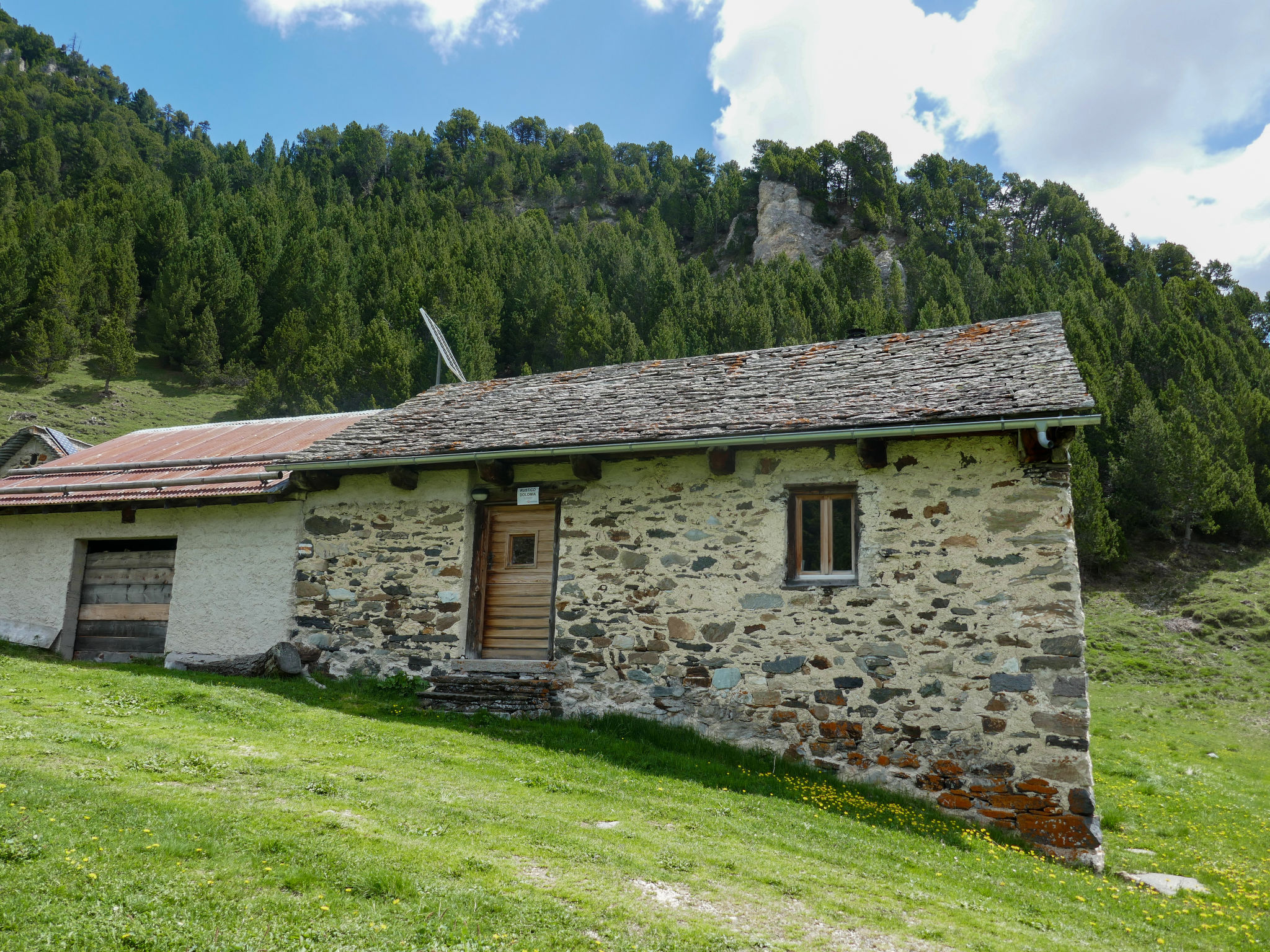 "Rustico Dolomia", 2 locali casa di campagna. Spazioso, in parte mansardato, arredamento semplice e rustico: soggiorno/sala da pranzo aperto con radio. Uscita sul giardino. Cucina aperta (forno, fornello a gas, 4 fuochi). Piano inferiore: 1 camera matrimoniale con 1 letto doppio (2 x 80 cm, lunghezza 200 cm). Uscita sul giardino. Doccia/WC. Riscaldamento a legna. Corrente da energia solare. 2. piano superiore: (scala ripida) mezzanino aperta con 4 letti (80 cm, lunghezza 200 cm). Mobili da terrazza. Magnifica vista panoramica sulle montagne, sulla valle e sul paesaggio. A disposizione: seggiolone, lettino per bimbi fino 2 anni (extra). Prego notare: casa per non fumatori. Massimo 1 animale/cane consentito. Estintore. NL-00007006