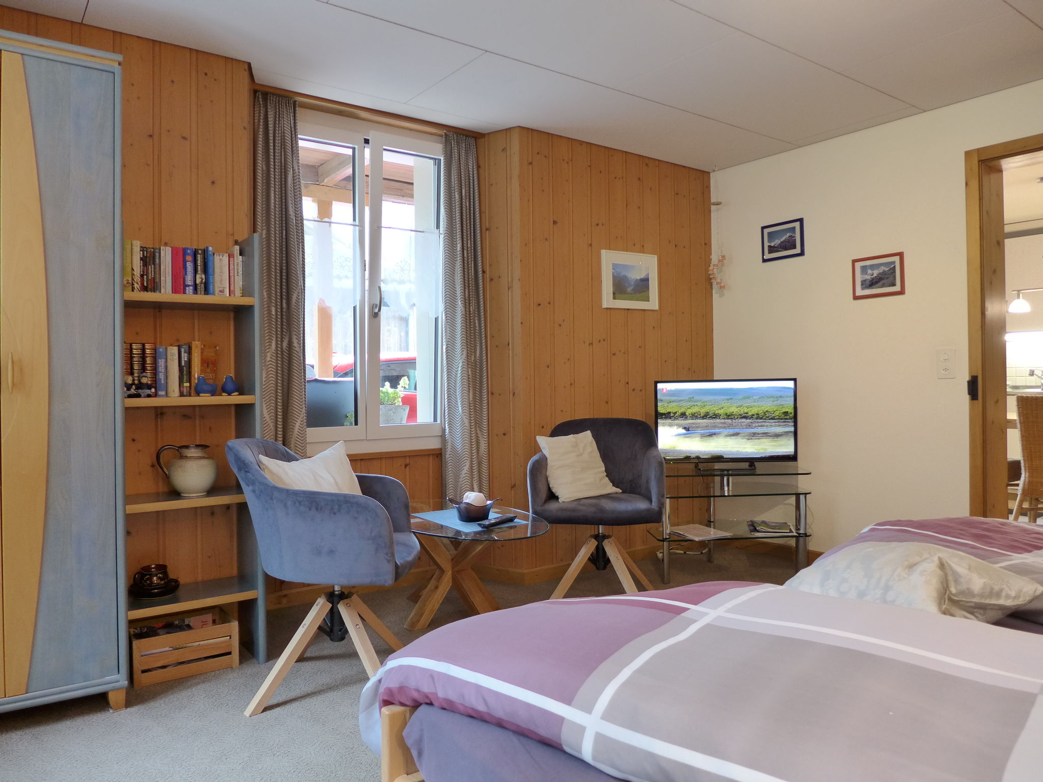 Monolocale 40 m2, al pianterreno. Spazioso, arredamento confortevole e accogliente: soggiorno/camera 20 m2 con 2 letti e TV (via cavo) (schermo piatto), radio e CD. Grande cucina abitabile (3 punti cottura, forno, tostapane, bollitore elettrico, macchina da caffè elettrica, set per raclette, set per fondue (formaggio)) con tavolo da pranzo. Doccia/WC. Riscaldamento elettrico, boiler (150 litri). Patio. Mobili da terrazza, sedie a sdraio. Bella vista sulle montagne e sul paesaggio. A disposizione: asciugacapelli. Internet (wifi, gratis). Parcheggio. Prego notare: appartamento per non fumatori. Estintore.