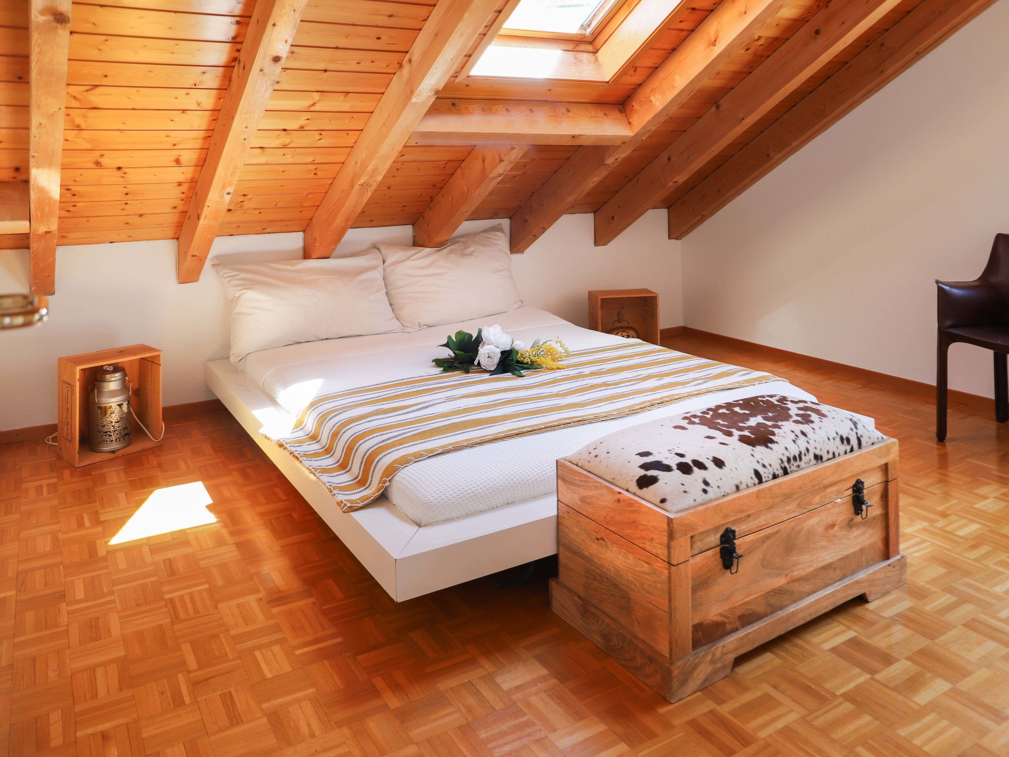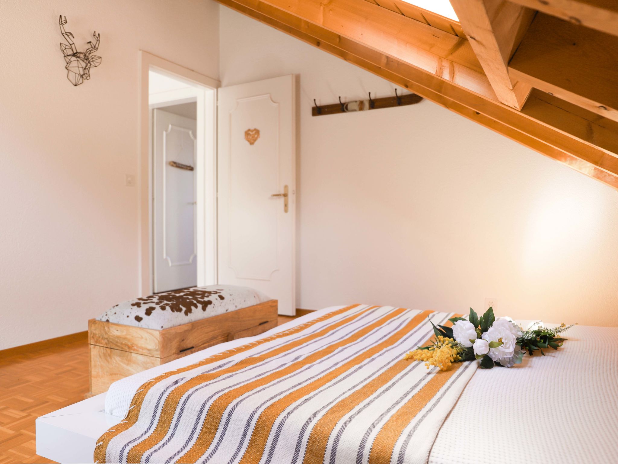 "Route de la Muraz 9", villa 4 locali su 2 piani. Arredamento confortevole e di buon gusto: soggiorno/sala da pranzo con TV (via cavo) (schermo piatto). Uscita sul balcone, sulla terrazza. 1 camera con 1 letto doppio (160 cm, lunghezza 200 cm). Cucina aperta (forno, lavastoviglie, 4 piastre cottura in vetroceramica, tostapane, bollitore elettrico, macchina da caffè elettrica, capsule per la macchina da caffè (Nespresso), set per fondue (formaggio)). Doccia/WC. Piano superiore: 1 camera grande con 1 letto doppio. Uscita sul balcone. 1 camera mansardata con 1 letto doppio (2 x 90 cm, lunghezza 200 cm). Vasca/WC. 2 balconi, terrazza. Mobili da balcone. Magnifica vista sul lago, sulle montagne, sul paesaggio e sulla località. A disposizione: seggiolone, asciugacapelli. Internet (wifi). Parcheggio vicino alla casa. Prego notare: appartamento per non fumatori. Non ci sono tende o persiane nelle camere da letto superiori.