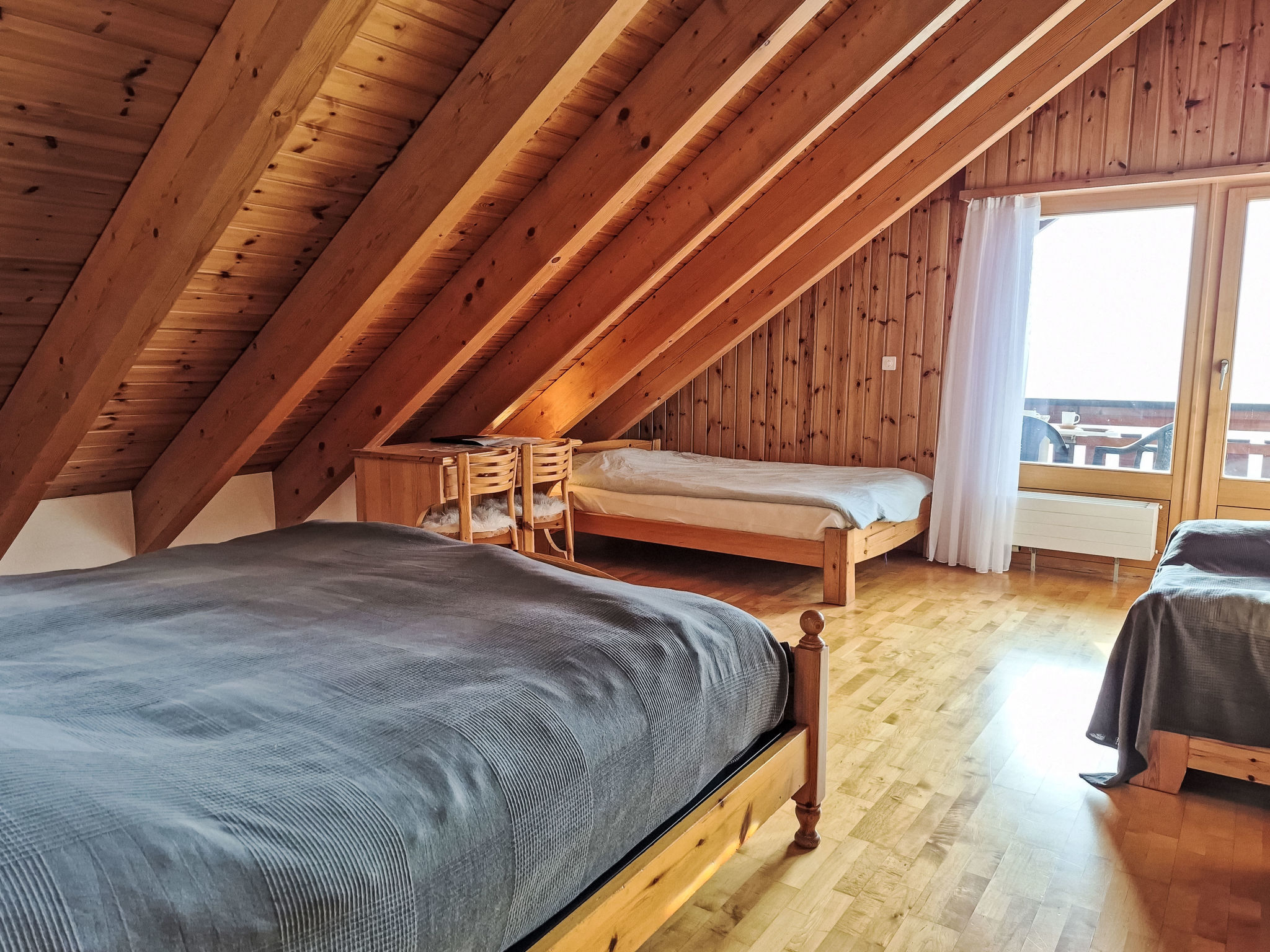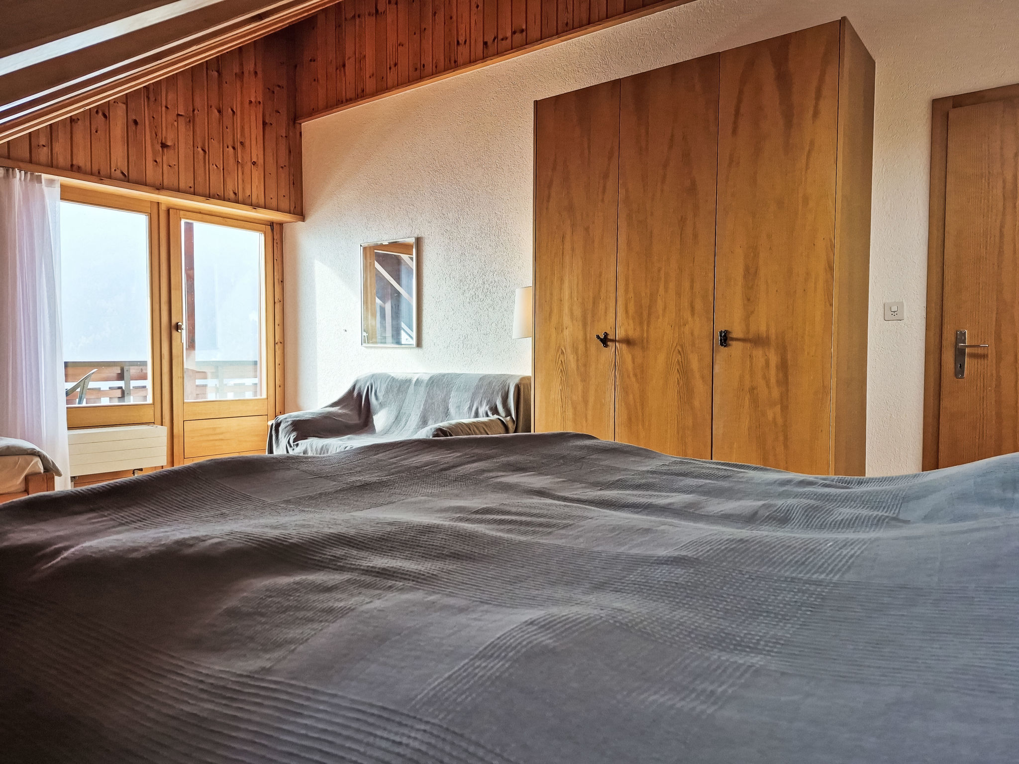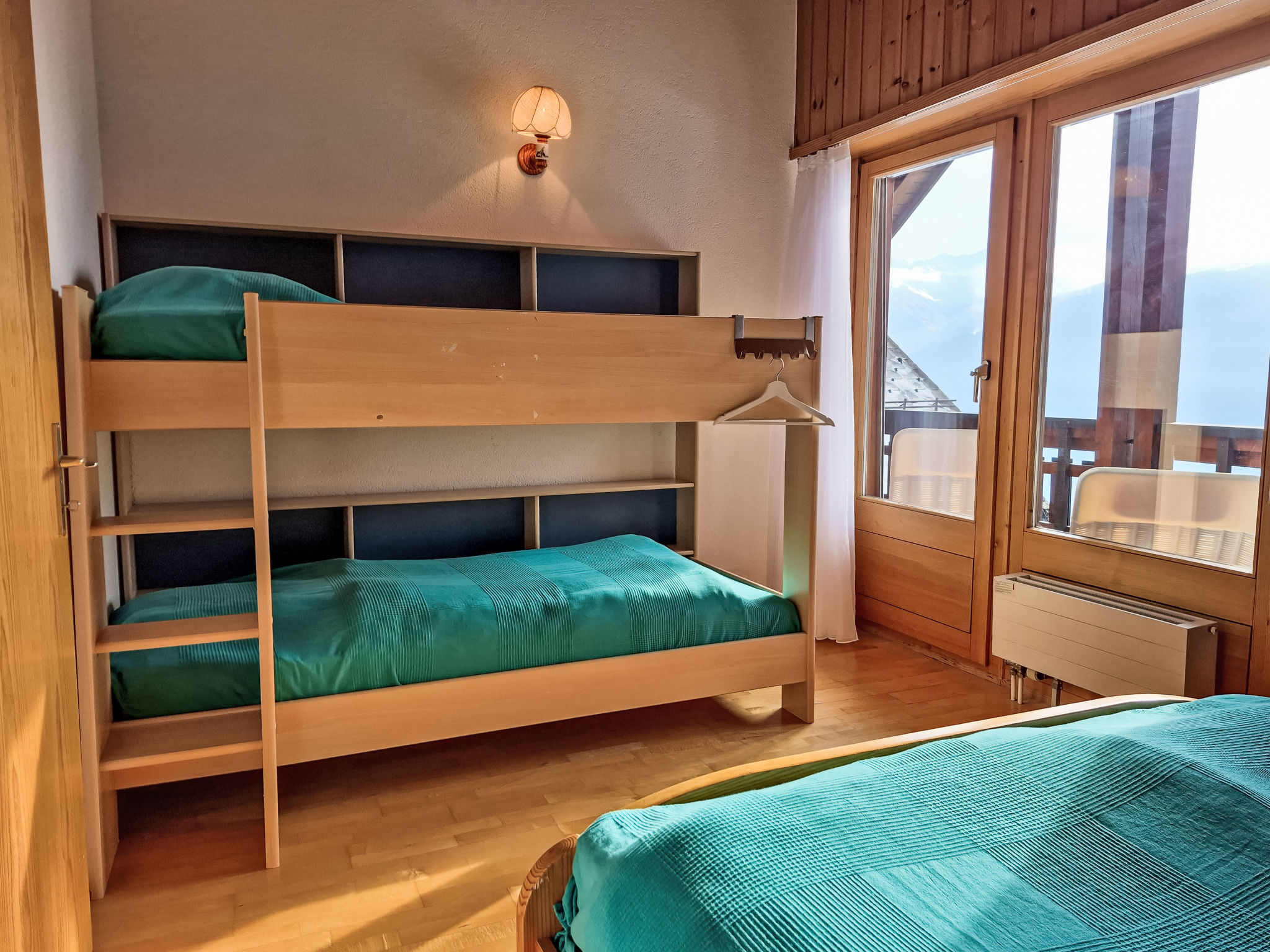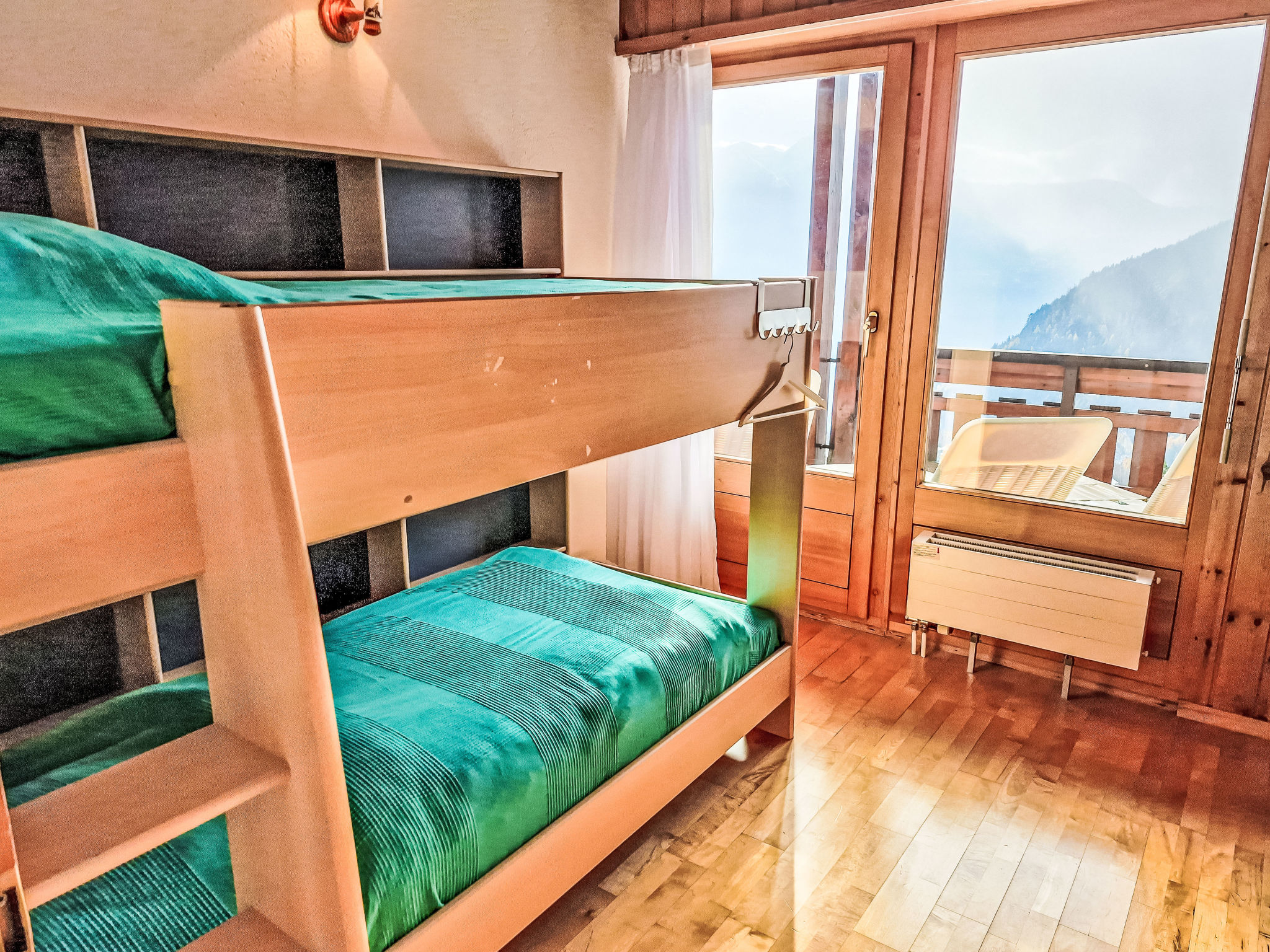 "Les Thermalies 202", apt. di 3 locali 79 m2 su 2 piani al 2. piano, esposizione sud. Luminoso, in parte restaurato nel 2025, arredamento confortevole e di buon gusto: soggiorno/sala da pranzo con TV (via cavo). Uscita sul balcone. Cucina aperta (forno, lavastoviglie, 4 piastre cottura in vetroceramica, tostapane, bollitore elettrico, macchina da caffè elettrica, capsule per la macchina da caffè (Nespresso) extra, set per raclette, set per fondue (chinoise, formaggio)). WC separato. Piano superiore: 1 camera mansardata grande con 1 letto alla francese (180 cm, lunghezza 200 cm). Uscita sul balcone. 1 camera mansardata con 1 x 2 letti a castello (90 cm, lunghezza 200 cm), 1 letto alla francese (160 cm, lunghezza 200 cm). Uscita sul balcone. Vasca/WC. 2 balconi 15 m2, esposizione sud-ovest. Mobili da balcone, sedie a sdraio (6), posto a sedere. Magnifica vista sulle montagne, sulla piscina e sul bosco. A disposizione: ferro da stiro, seggiolone, lettino per bimbi, asciugacapelli. Internet (wifi, gratis). Garage nr. 202 (1 Auto), altezza 215 cm, larghezza 250 cm. Prego notare: adatto alle famiglie. Frigorifero senza congelatore, appartamento per non fumatori.