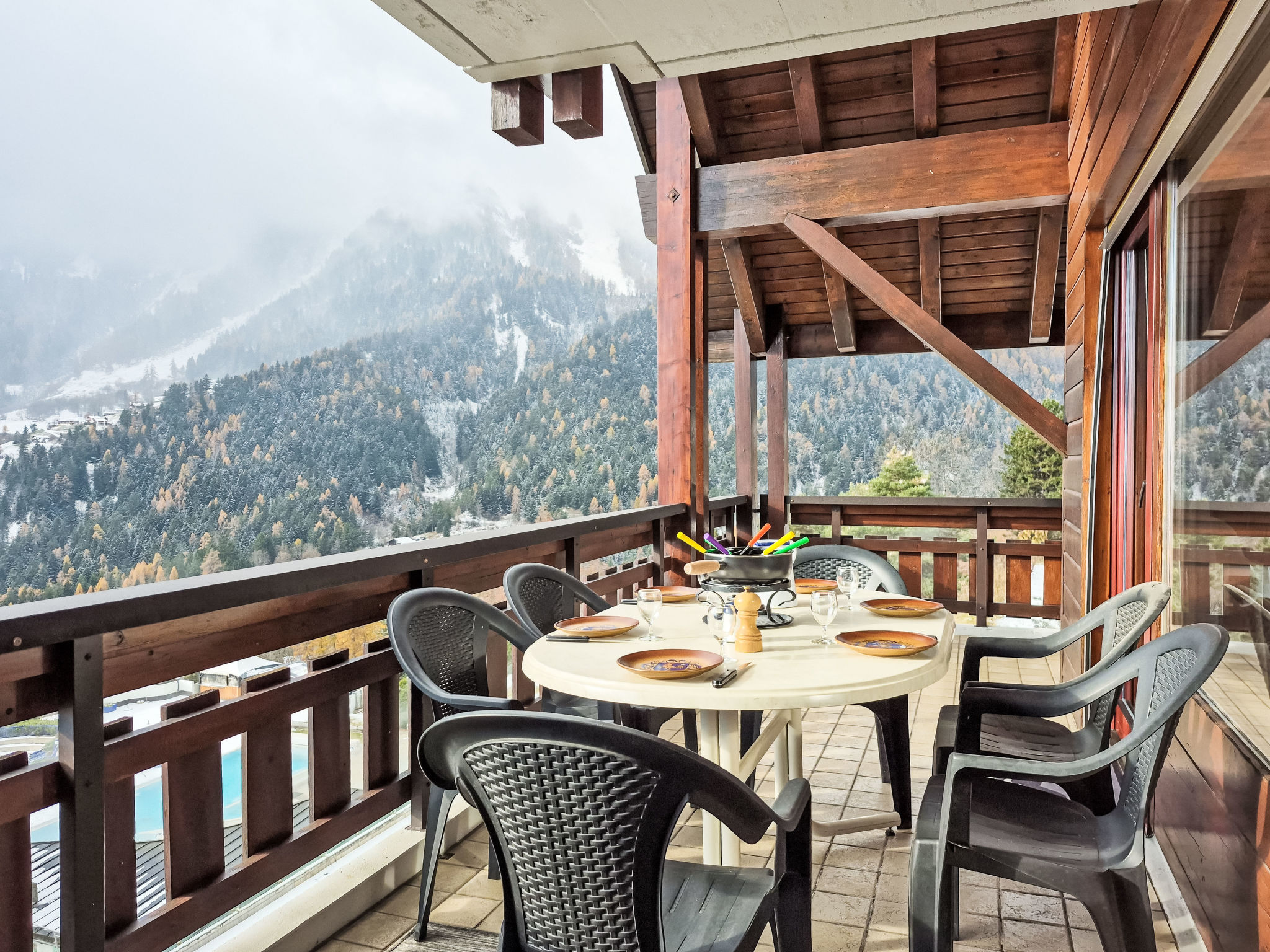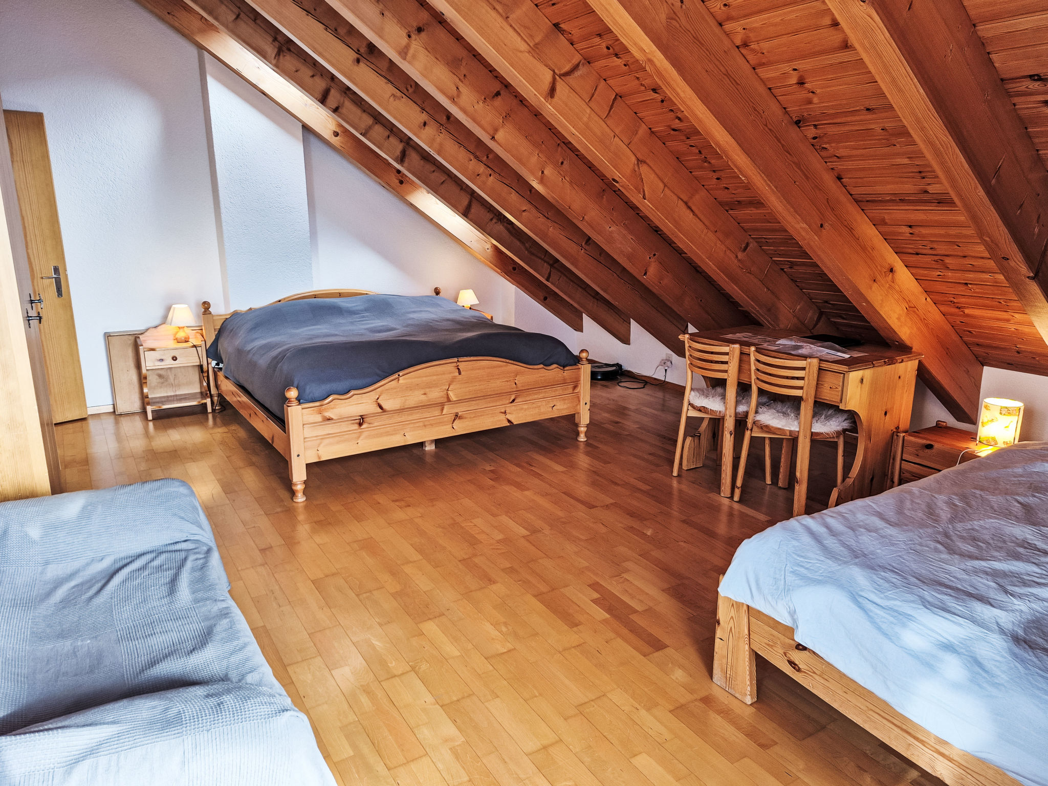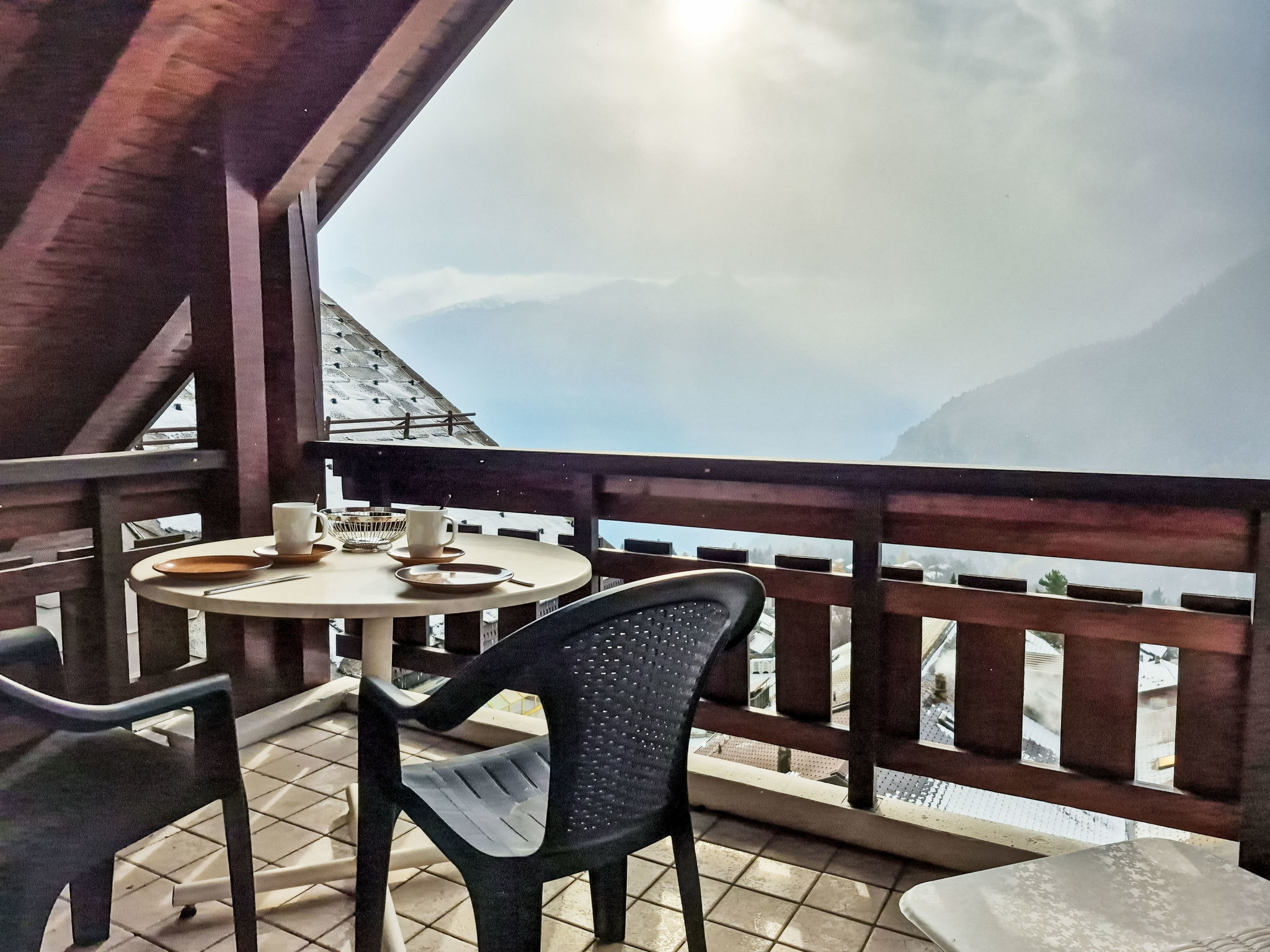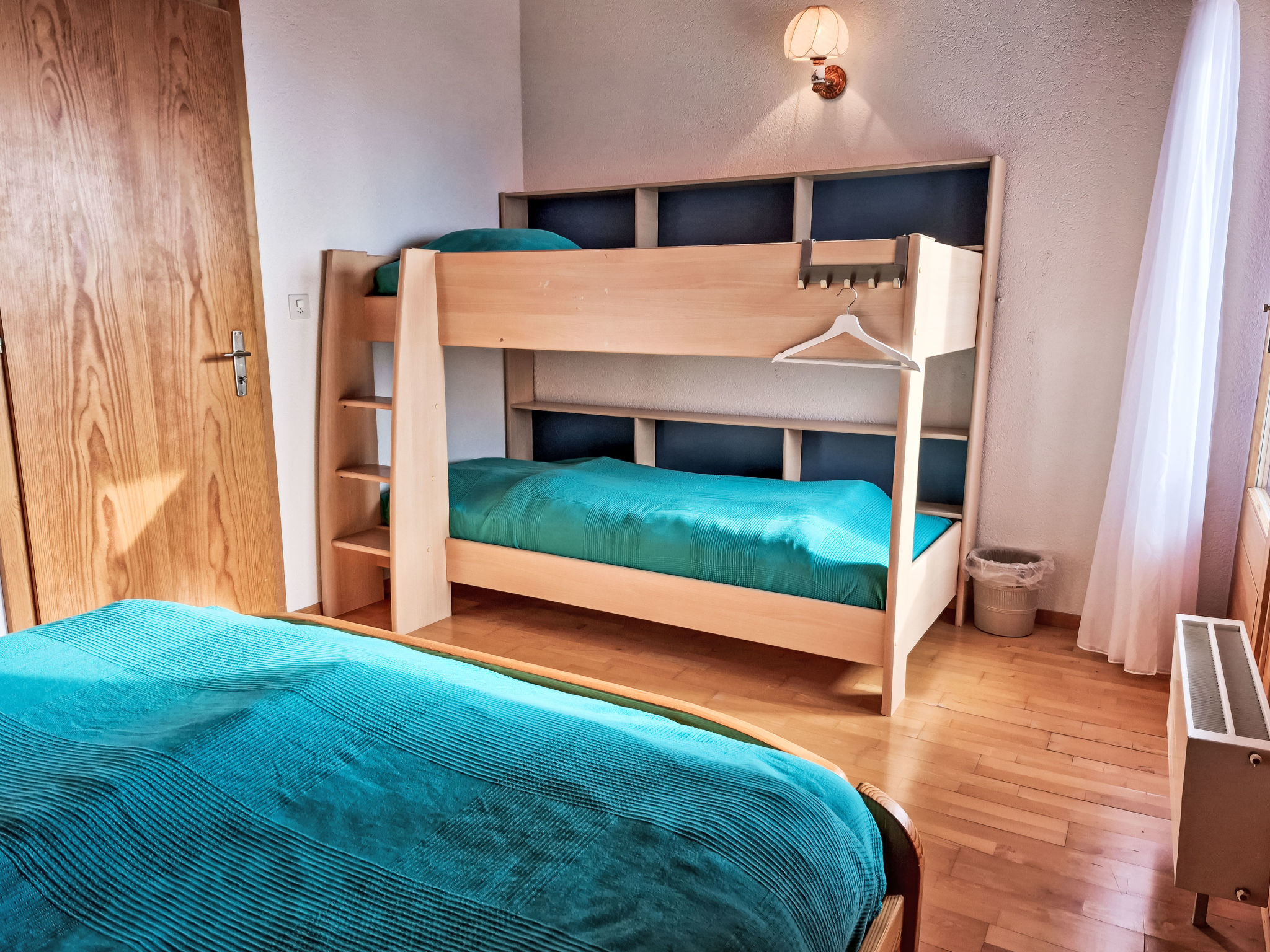 "Les Thermalies 202", apt. di 3 locali 79 m2 su 2 piani al 2. piano, esposizione sud. Luminoso, in parte restaurato nel 2025, arredamento confortevole e di buon gusto: soggiorno/sala da pranzo con TV (via cavo). Uscita sul balcone. Cucina aperta (forno, lavastoviglie, 4 piastre cottura in vetroceramica, tostapane, bollitore elettrico, macchina da caffè elettrica, capsule per la macchina da caffè (Nespresso) extra, set per raclette, set per fondue (chinoise, formaggio)). WC separato. Piano superiore: 1 camera mansardata grande con 1 letto alla francese (180 cm, lunghezza 200 cm). Uscita sul balcone. 1 camera mansardata con 1 x 2 letti a castello (90 cm, lunghezza 200 cm), 1 letto alla francese (160 cm, lunghezza 200 cm). Uscita sul balcone. Vasca/WC. 2 balconi 15 m2, esposizione sud-ovest. Mobili da balcone, sedie a sdraio (6), posto a sedere. Magnifica vista sulle montagne, sulla piscina e sul bosco. A disposizione: ferro da stiro, seggiolone, lettino per bimbi, asciugacapelli. Internet (wifi, gratis). Garage nr. 202 (1 Auto), altezza 215 cm, larghezza 250 cm. Prego notare: adatto alle famiglie. Frigorifero senza congelatore, appartamento per non fumatori.