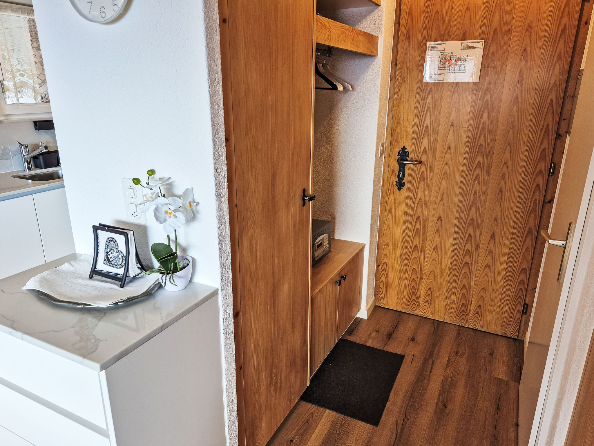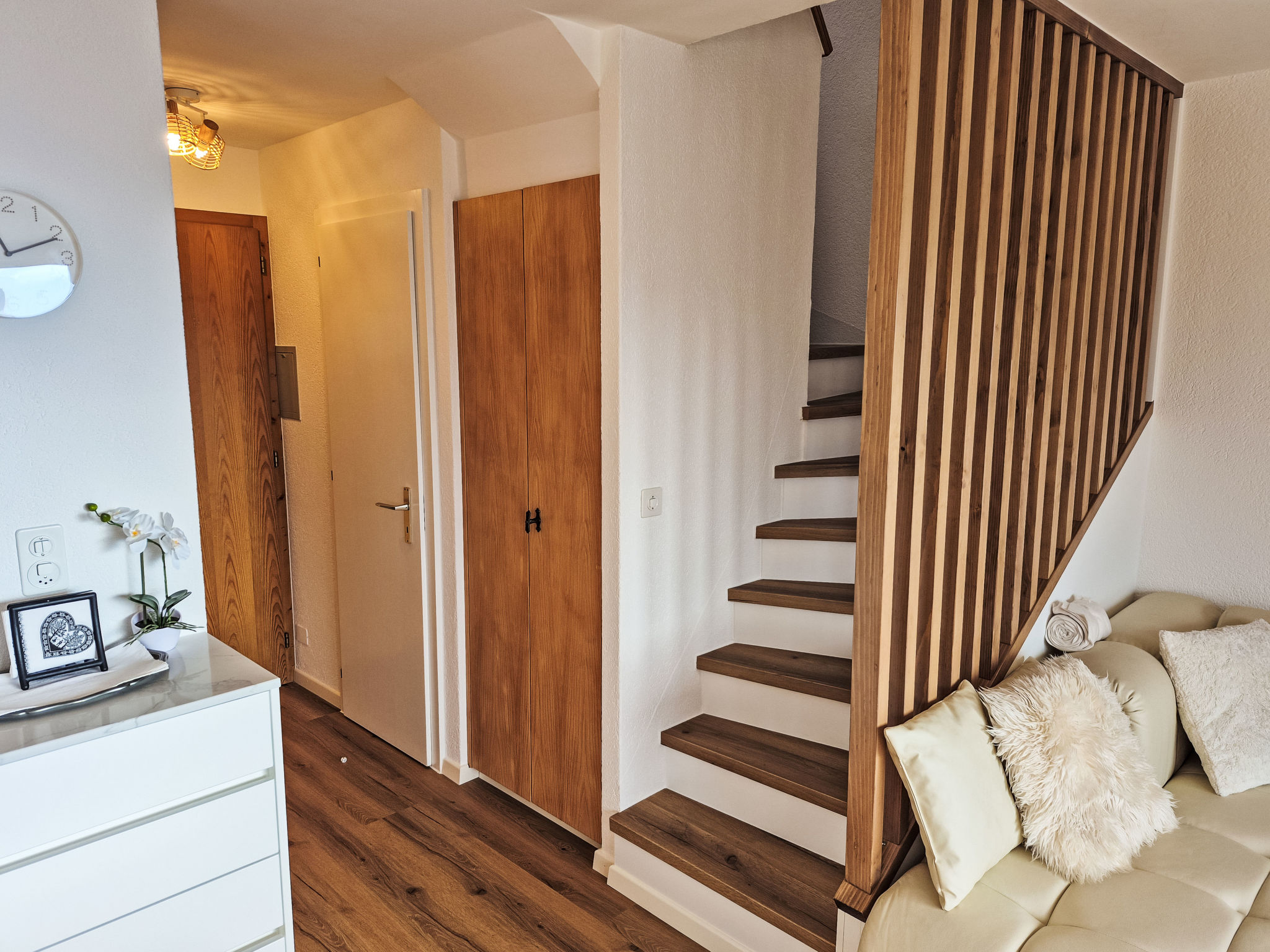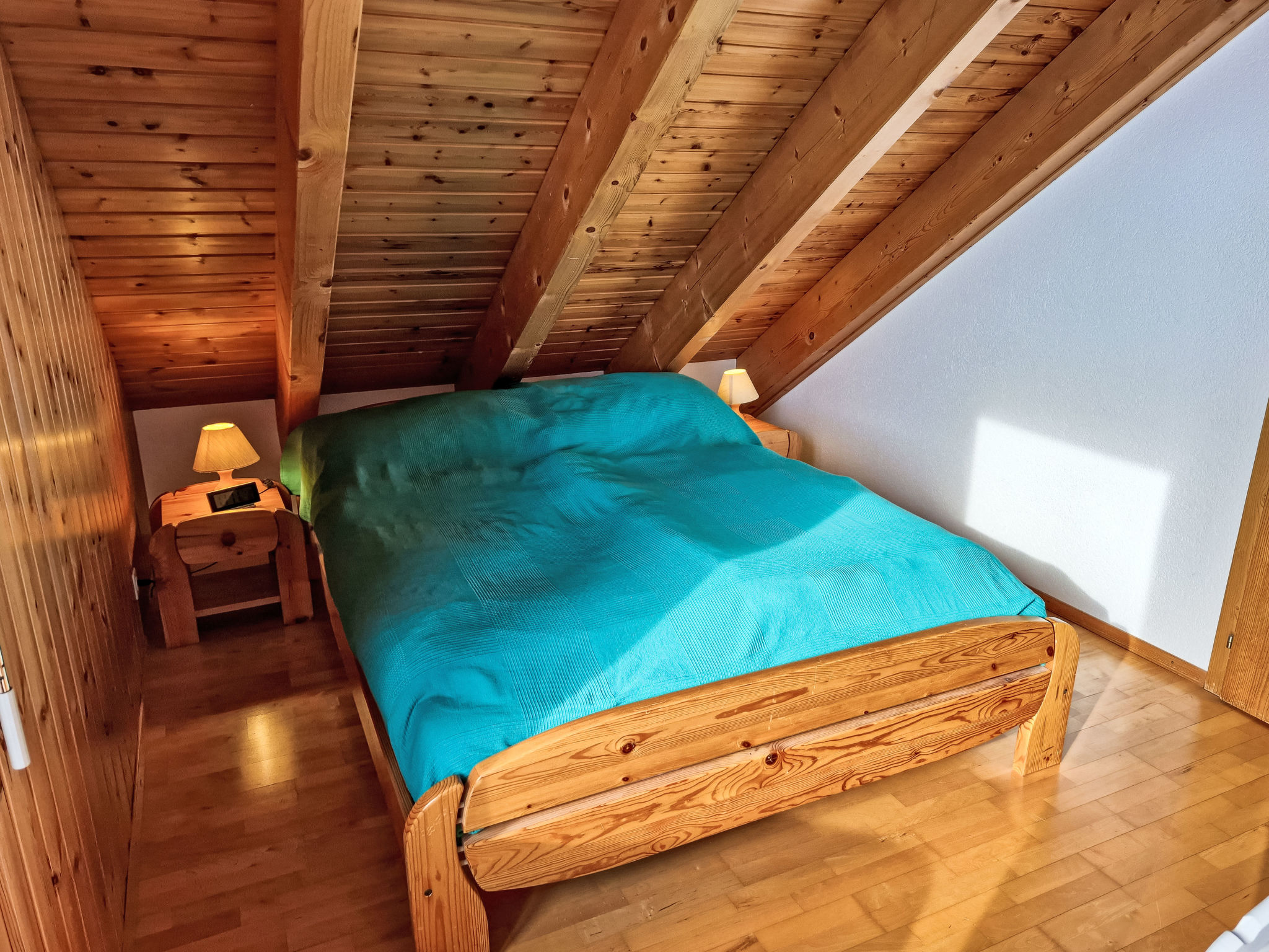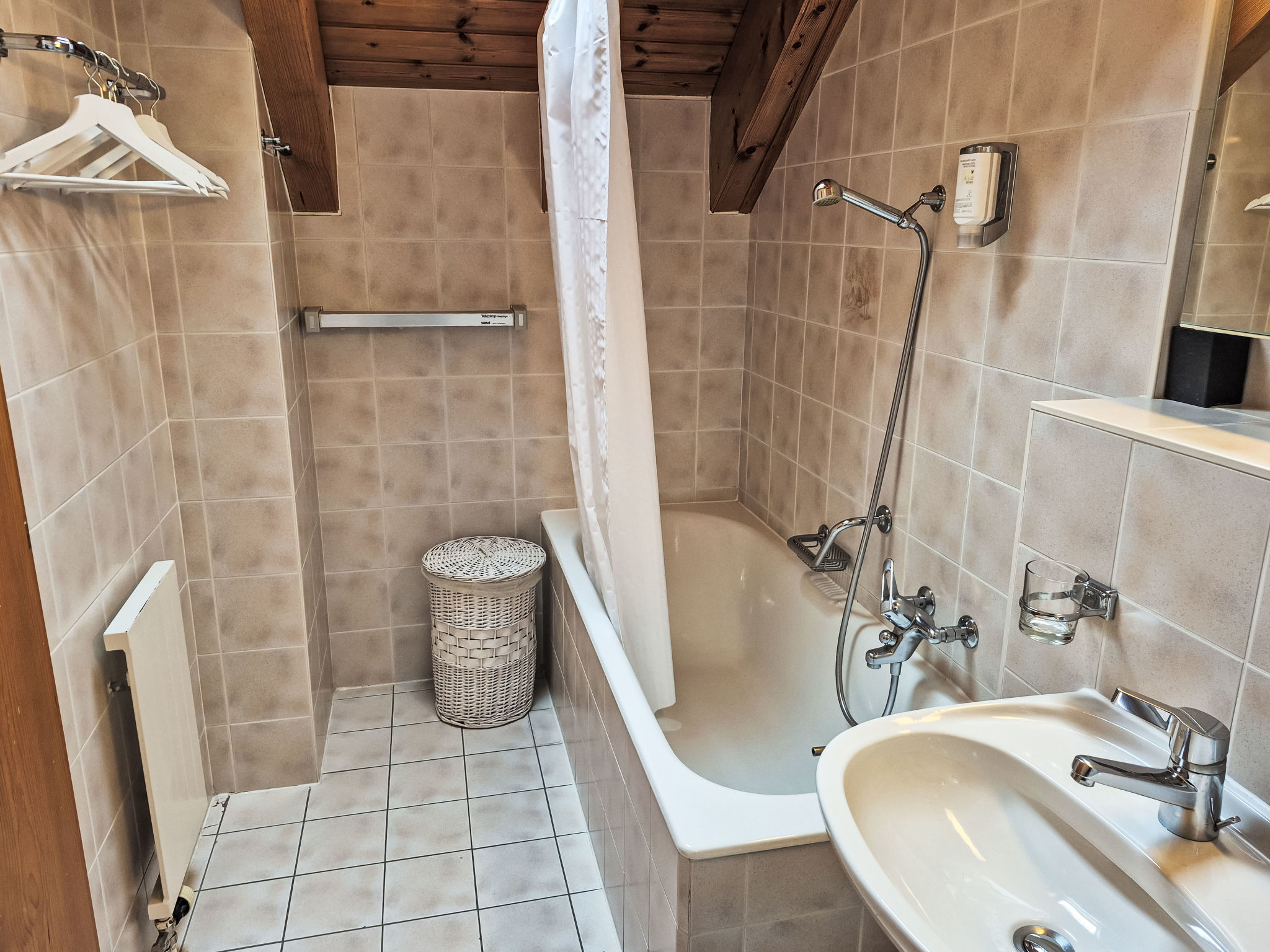 "Les Thermalies 202", apt. di 3 locali 79 m2 su 2 piani al 2. piano, esposizione sud. Luminoso, in parte restaurato nel 2025, arredamento confortevole e di buon gusto: soggiorno/sala da pranzo con TV (via cavo). Uscita sul balcone. Cucina aperta (forno, lavastoviglie, 4 piastre cottura in vetroceramica, tostapane, bollitore elettrico, macchina da caffè elettrica, capsule per la macchina da caffè (Nespresso) extra, set per raclette, set per fondue (chinoise, formaggio)). WC separato. Piano superiore: 1 camera mansardata grande con 1 letto alla francese (180 cm, lunghezza 200 cm). Uscita sul balcone. 1 camera mansardata con 1 x 2 letti a castello (90 cm, lunghezza 200 cm), 1 letto alla francese (160 cm, lunghezza 200 cm). Uscita sul balcone. Vasca/WC. 2 balconi 15 m2, esposizione sud-ovest. Mobili da balcone, sedie a sdraio (6), posto a sedere. Magnifica vista sulle montagne, sulla piscina e sul bosco. A disposizione: ferro da stiro, seggiolone, lettino per bimbi, asciugacapelli. Internet (wifi, gratis). Garage nr. 202 (1 Auto), altezza 215 cm, larghezza 250 cm. Prego notare: adatto alle famiglie. Frigorifero senza congelatore, appartamento per non fumatori.