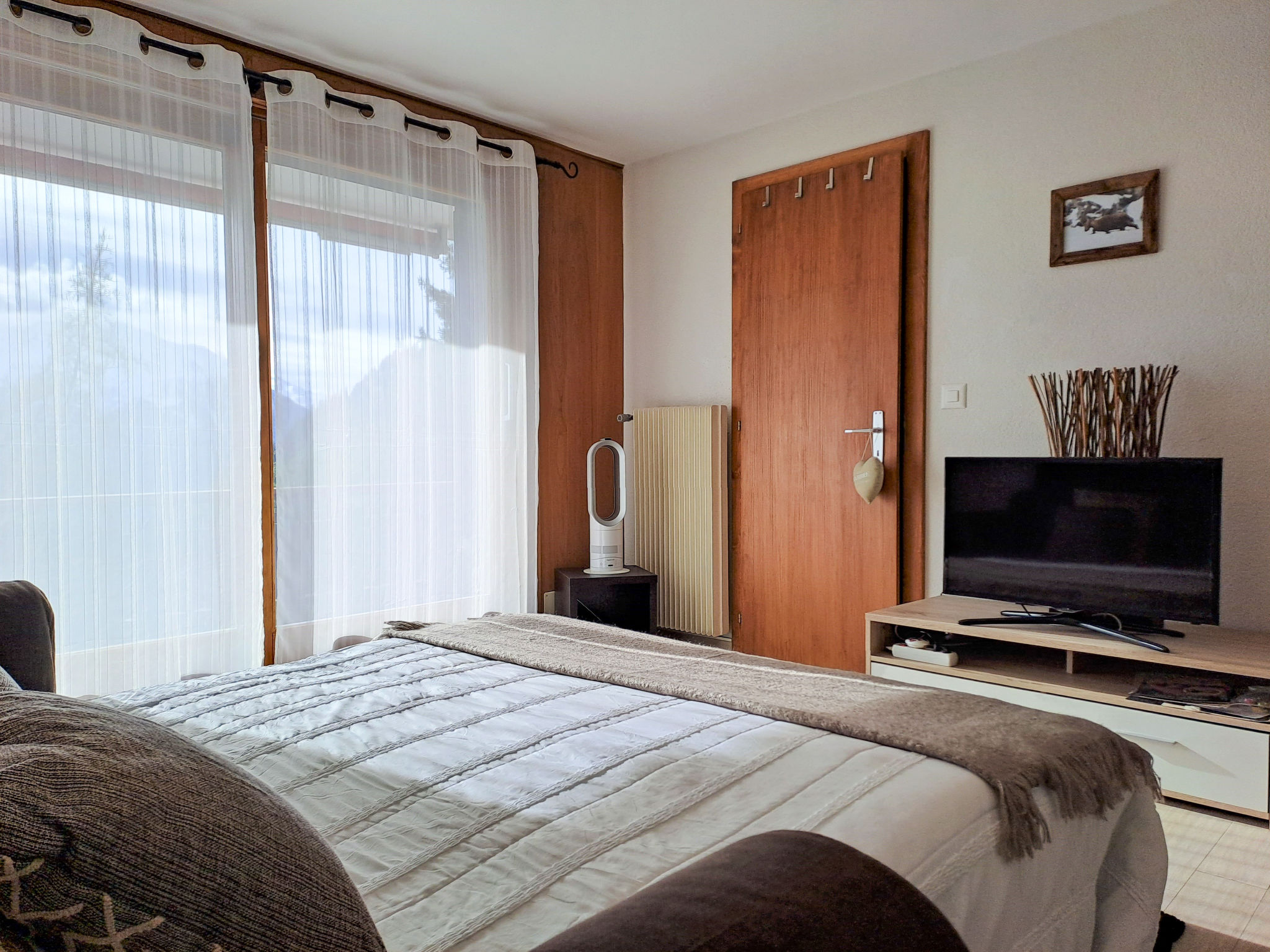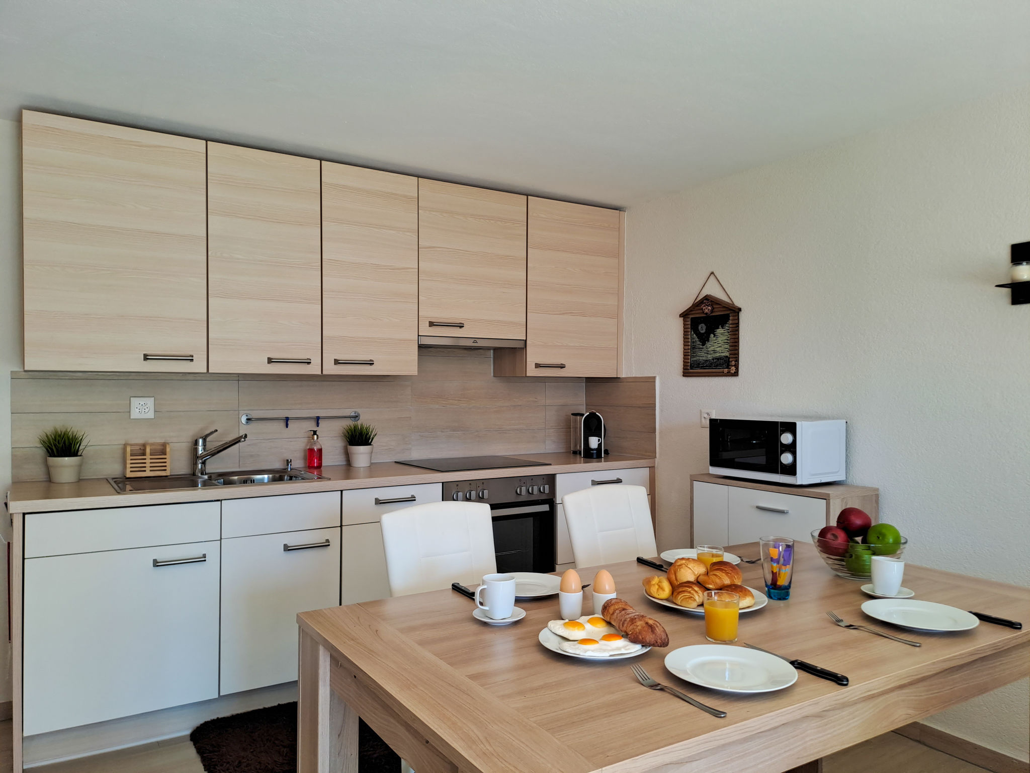 "Beausoleil 4", apt. di 2 locali 45 m2 al 1. piano. Luminoso, arredamento gradevole e di buon gusto: soggiorno/sala da pranzo grande con 1 divano letto (160 cm, lunghezza 200 cm), tavolo da pranzo e TV (via cavo). Uscita sul balcone. 1 camera con 1 x 2 letti a castello. Cucina (forno, lavastoviglie, 4 piastre cottura in vetroceramica, tostapane, bollitore elettrico, forno a microonde, macchina da caffè elettrica, capsule per la macchina da caffè (Nespresso) extra, set per raclette, set per fondue (formaggio)). Vasca/WC. Bella vista sulle montagne e sulla valle. A disposizione: seggiolone, asciugacapelli. Internet (wifi, gratis). Parcheggio nr. 4. Prego notare: adatto alle famiglie. Appartamento per non fumatori. 143.000.891.79