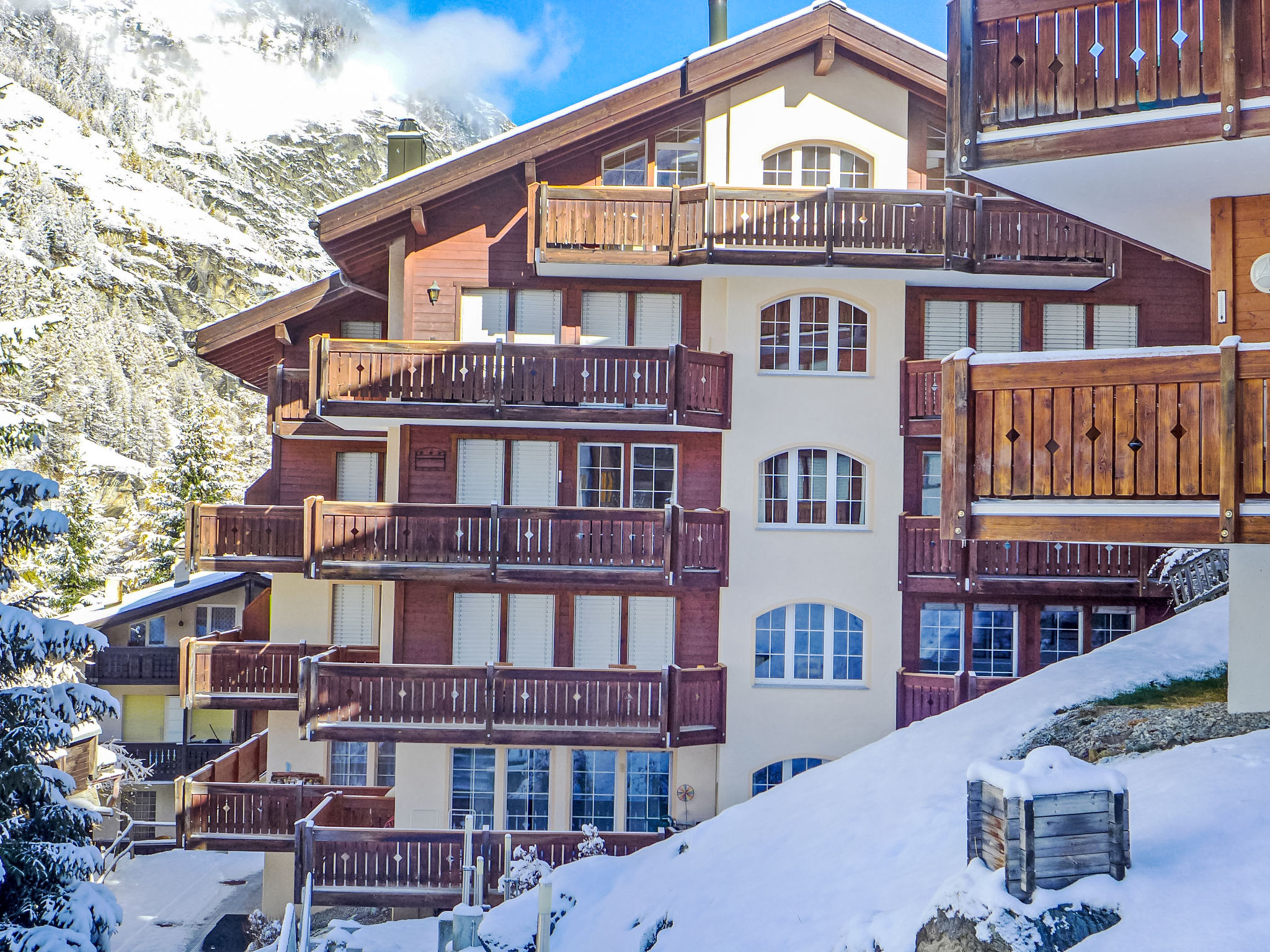 Casa plurifamiliare "Aquila", piacevole, lussuosa su 5 piani, costruita nel 2004. Nella frazione Zer Bännu, a 850 m dal centro, posizione tranquilla, soleggiata, esposizione sud. Nella casa: ascensore, deposito sci, riscaldamento centralizzato, lavatrice (extra), asciugatrice (extra). Supermercato 750 m, ristorante 350 m, panetteria 850 m, noleggio biciclette 850 m, 15 minuti a piedi dal centro, fermata bus "Wiestibrücke" 500 m, stazione ferroviaria "Bahnhof Zermatt" 850 m. Funivia, noleggio sci 700 m, fermata ski bus 500 m, scuola di sci 1.1 km, scuola di sci per bambini 1.1 km. I taxi non possono fermarsi di fronte alla casa. La consegna chiavi è presso l‘agenzia Interhome a Zermatt. Il taxi può salire fino a 50 gradini davanti alla casa. Da questo punto di vista, dopo la prima rampa di scale, l'ascensore accanto a casa Capriolo può essere utilizzato per evitare le restanti scale.