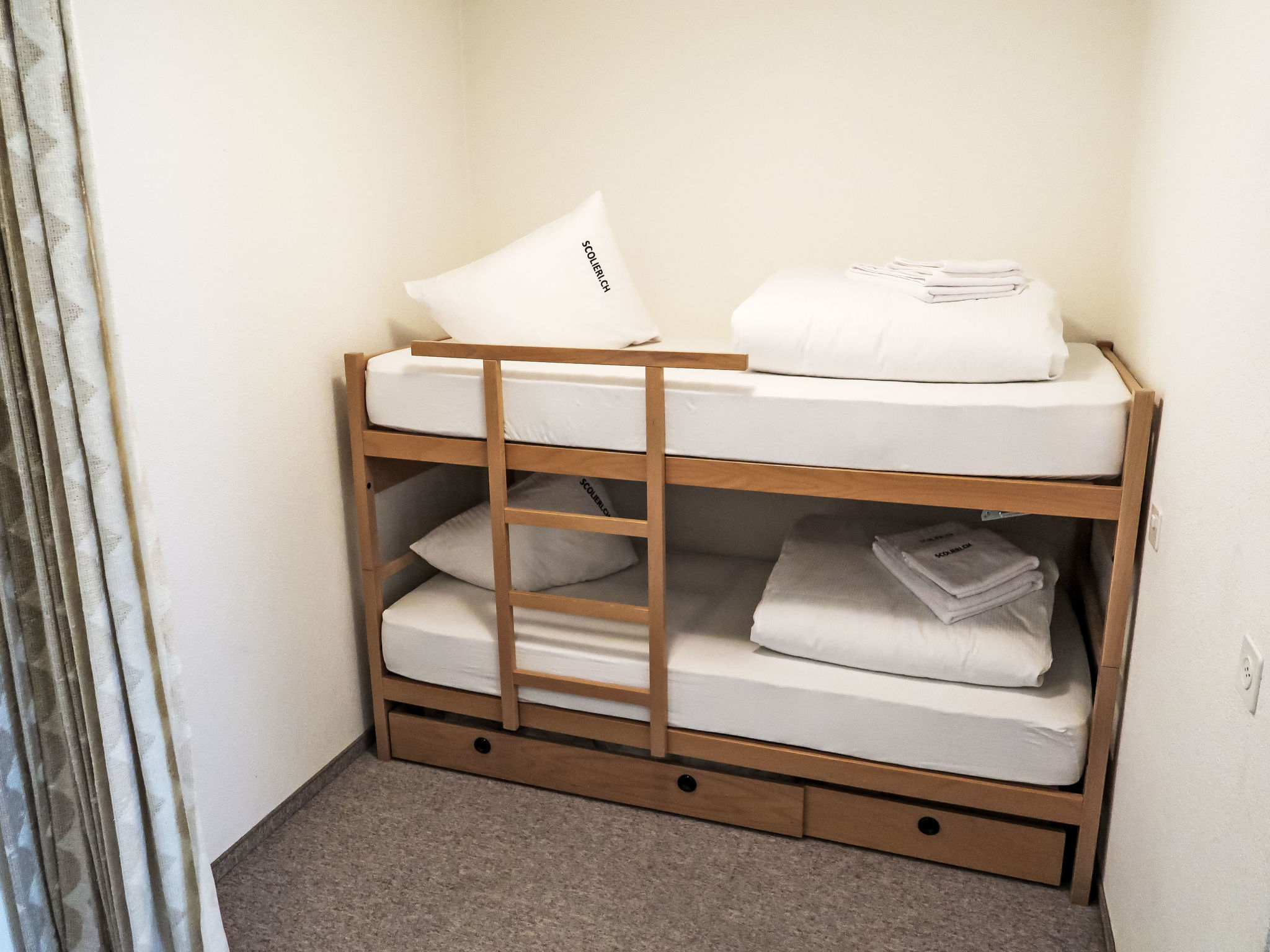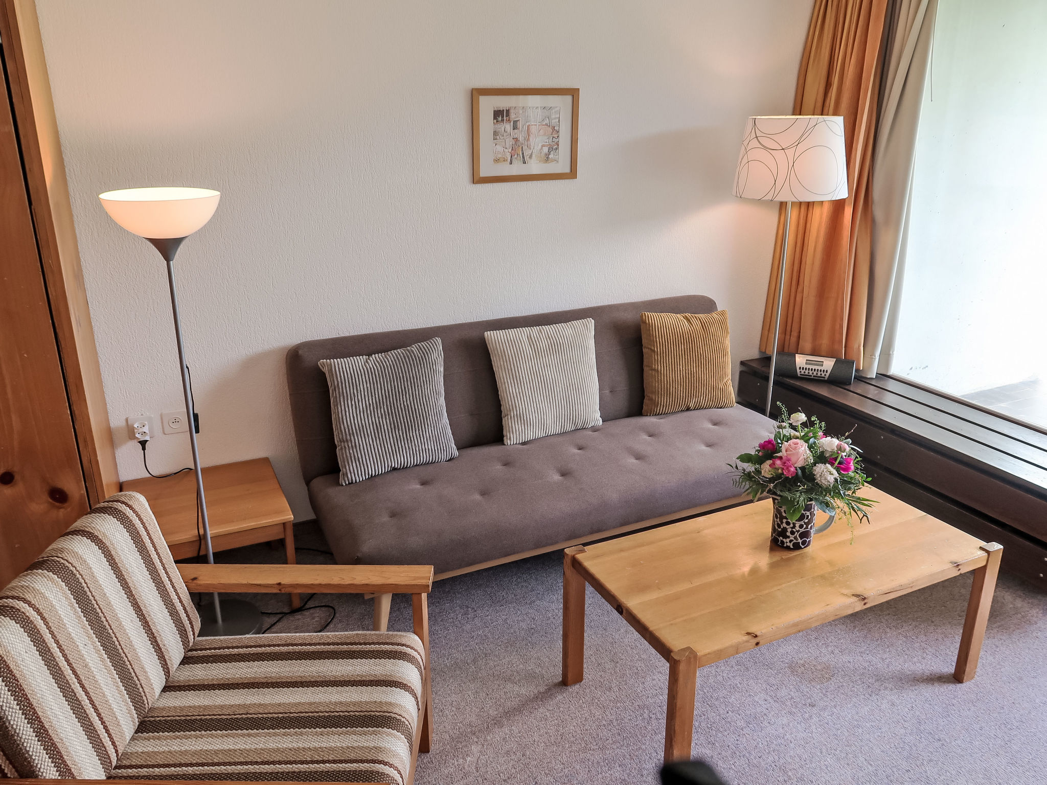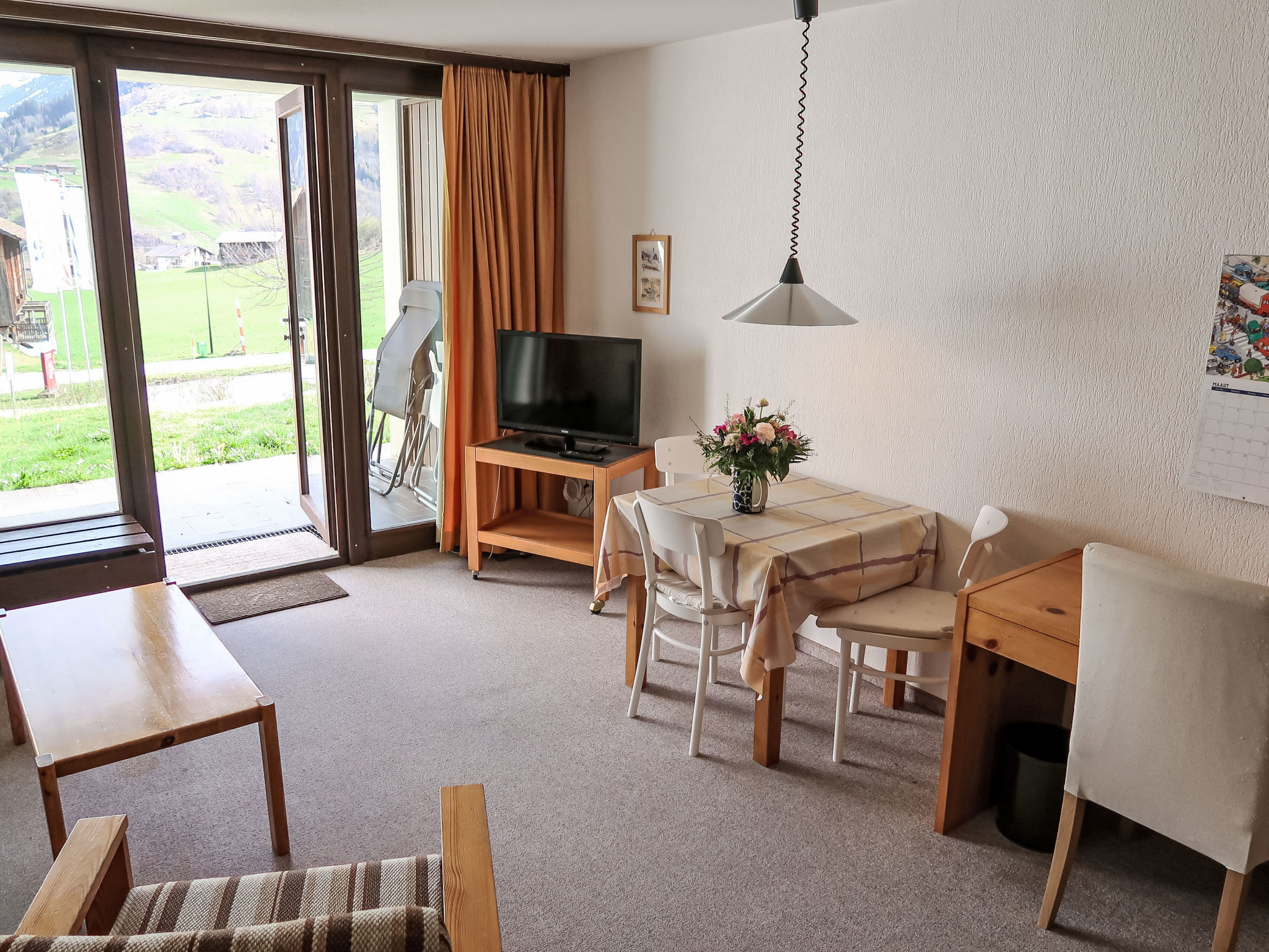 "Apt C 015" monolocale 45 m2, al pianterreno. Arredamento semplice e funzionale: soggiorno/sala da pranzo con 2 letti ad armadio e TV (satellite) (schermo piatto). Uscita verso il patio. Angolo notte con 1 x 2 letti a castello. Angolo cottura nell'ingresso (4 piastre cottura in vetroceramica). Vasca/WC. Esposizione sud, patio. Bella vista sulle montagne e sul paesaggio. A disposizione: Internet (wifi, gratis). Prego notare: appartamento per non fumatori. Uno o più posti letto adibiti a zona notte si trovano in area aperta o di passaggio (come soppalco, corridoio, alcova e simili).