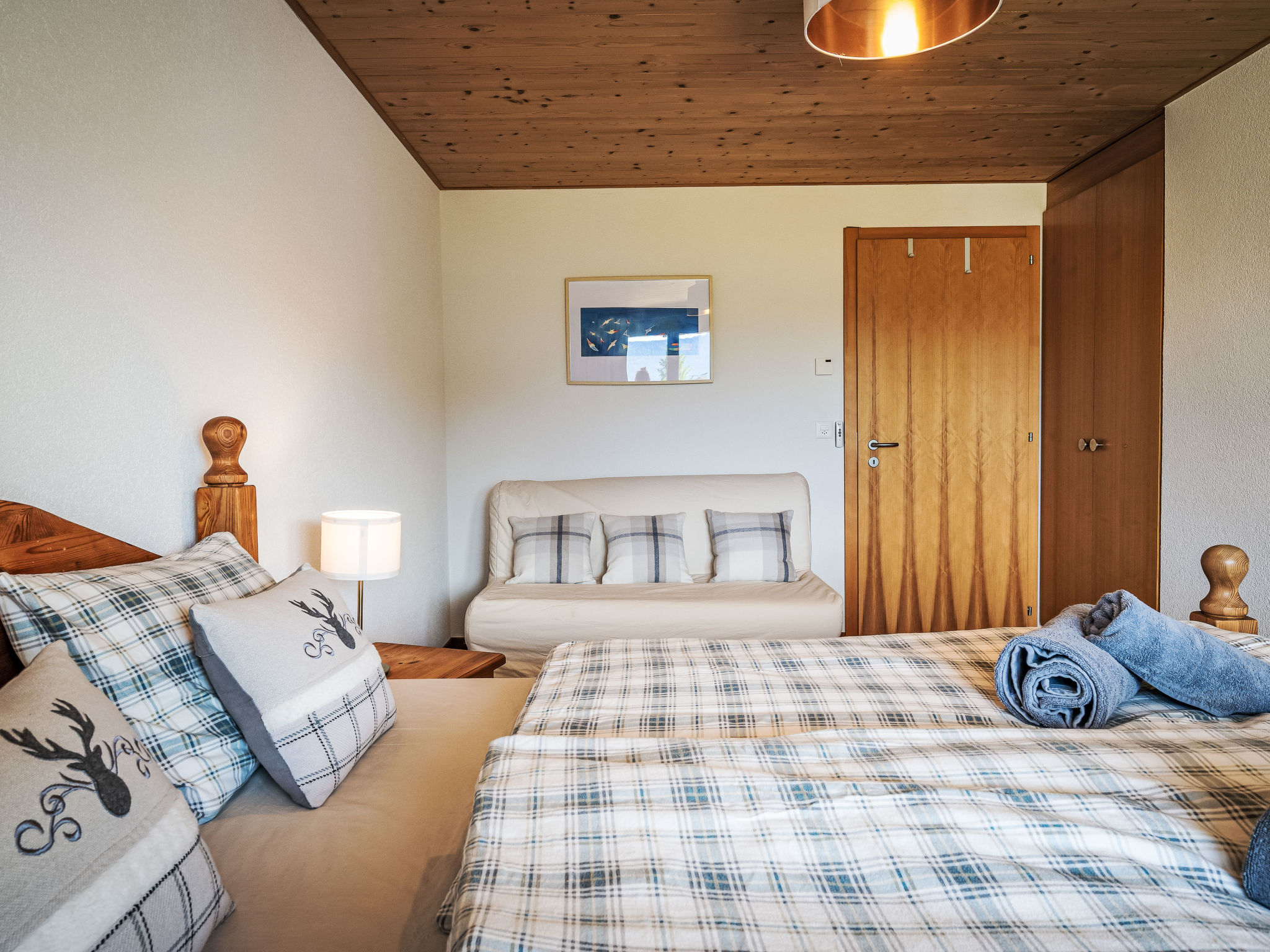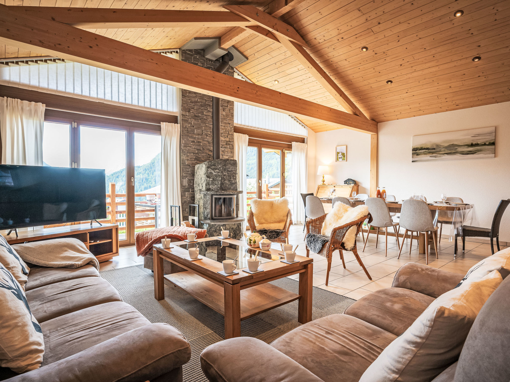 "Le Souvenir", chalet 5 locali 168 m2 su 3 piani, esposizione sud. Oggetto adatto a 8 adulti + 2 bambini. Spazioso e luminoso, in parte restaurato nel 2022, arredamento gradevole e di buon gusto: soggiorno/sala da pranzo grande con stufa svedese e TV (via cavo). Uscita sul balcone. 1 camera grande con 1 letto alla francese (160 cm, lunghezza 200 cm), vasca/doccia e TV. Cucina aperta (forno, lavastoviglie, 4 piastre ad induzione, tostapane, bollitore elettrico, forno a microonde, congelatore, macchina da caffè elettrica, capsule per la macchina da caffè (Nespresso) extra, vaporiera, set per raclette, set per fondue (formaggio)). Uscita sulla terrazza. WC separato. Piano inferiore: 1 camera piccola con 1 x 2 letti a castello (90 cm, lunghezza 200 cm). 1 camera grande con 1 letto alla francese (160 cm, lunghezza 200 cm), TV (via cavo). 1 camera con 1 divano letto (140 cm, lunghezza 190 cm), 1 letto alla francese (160 cm, lunghezza 200 cm). Uscita sul giardino, sulla terrazza. Vasca/WC, doccia/WC, WC separato. Piano superiore: ripostiglio. Balcone, esposizione sud, grande terrazza, esposizione sud, piccola terrazza, esposizione ovest, grande giardino, esposizione sud. Mobili da terrazza, barbecue (portatile). Splendida vista panoramica sulle montagne, sulla valle e sul paesaggio. A disposizione: lavatrice, asciugatrice, ferro da stiro, lettino per bimbi fino 2 anni, asciugacapelli. Internet (wifi, gratis). Parcheggio (3 Auto), garage (2 Auto), altezza 228 cm, larghezza 520 cm. Prego notare: casa per non fumatori. Massimo 1 animale/cane consentito.