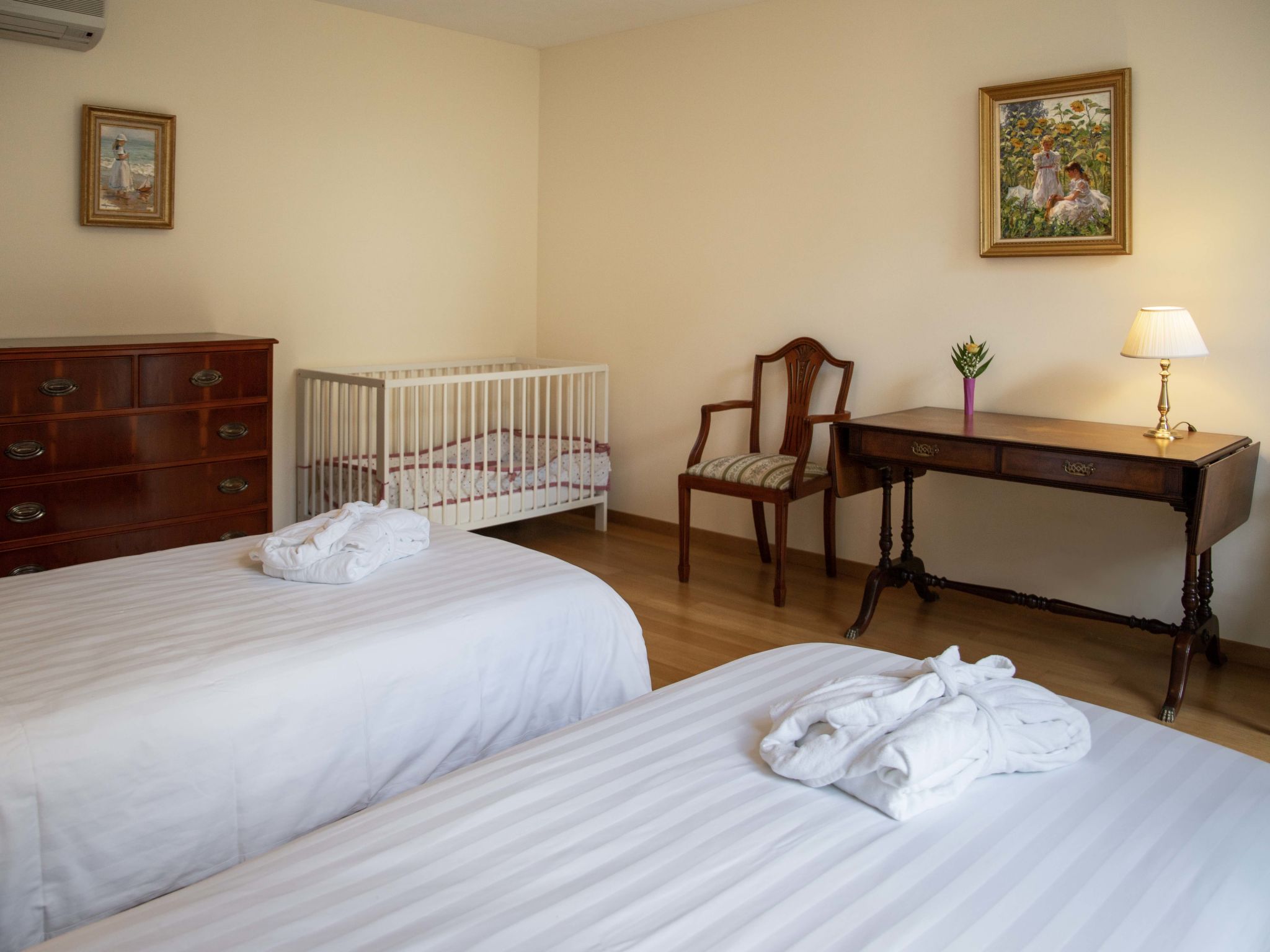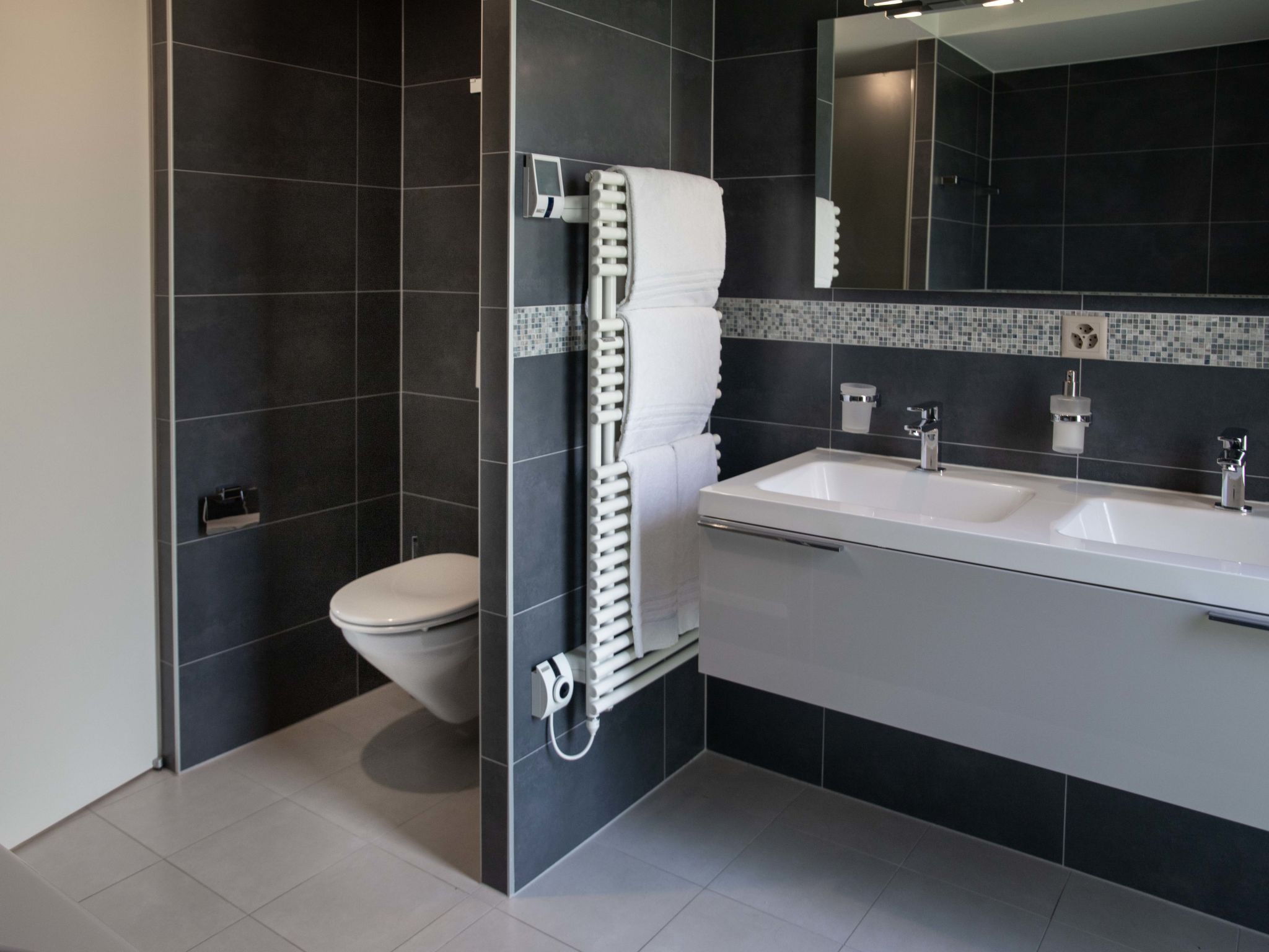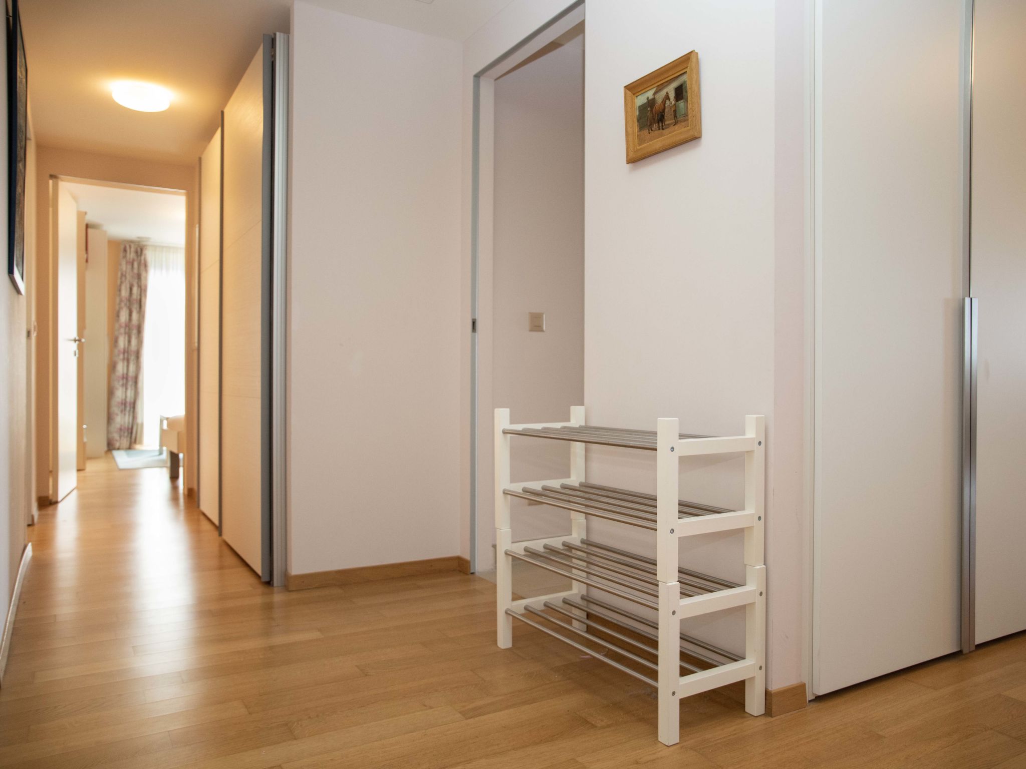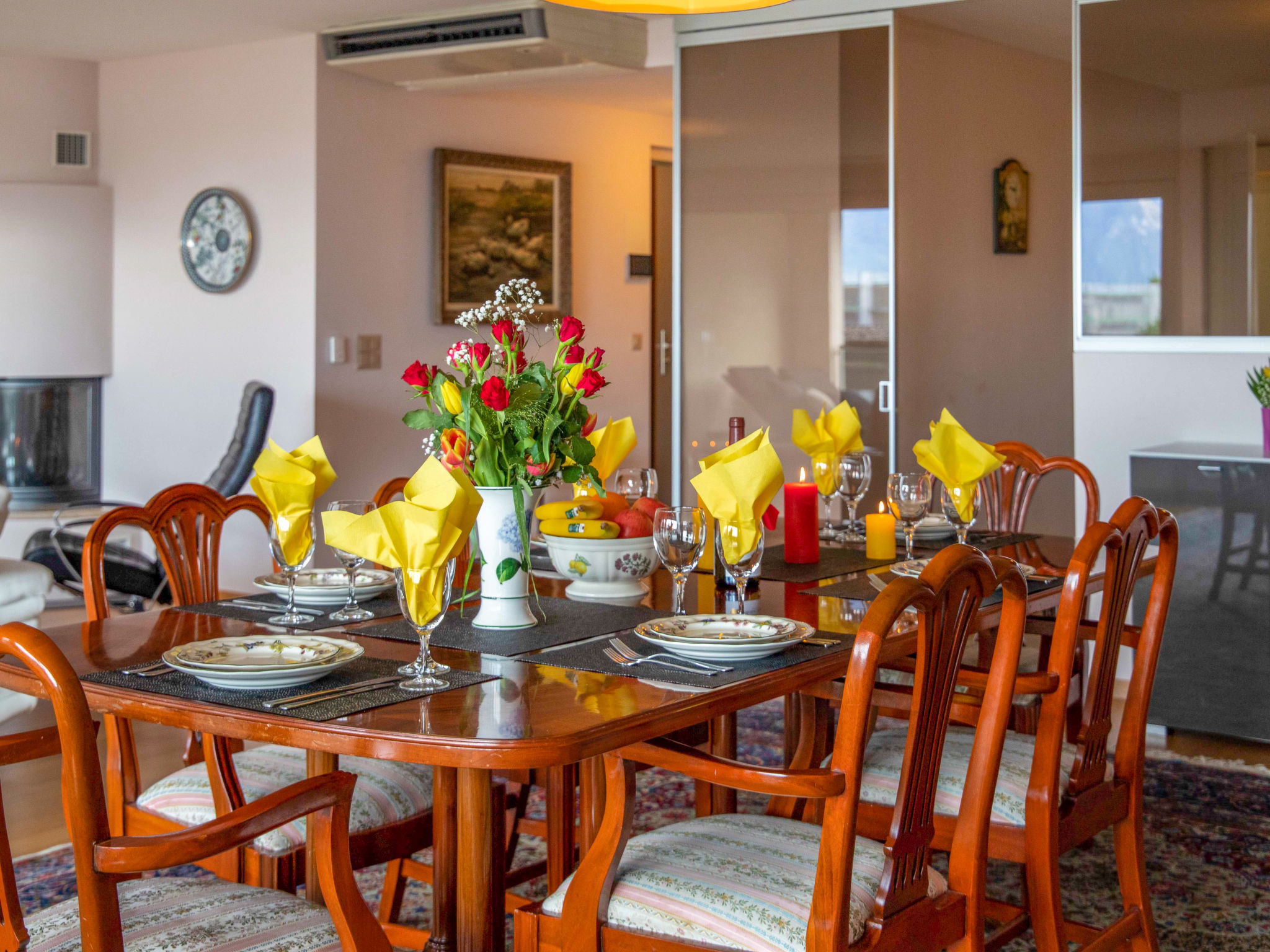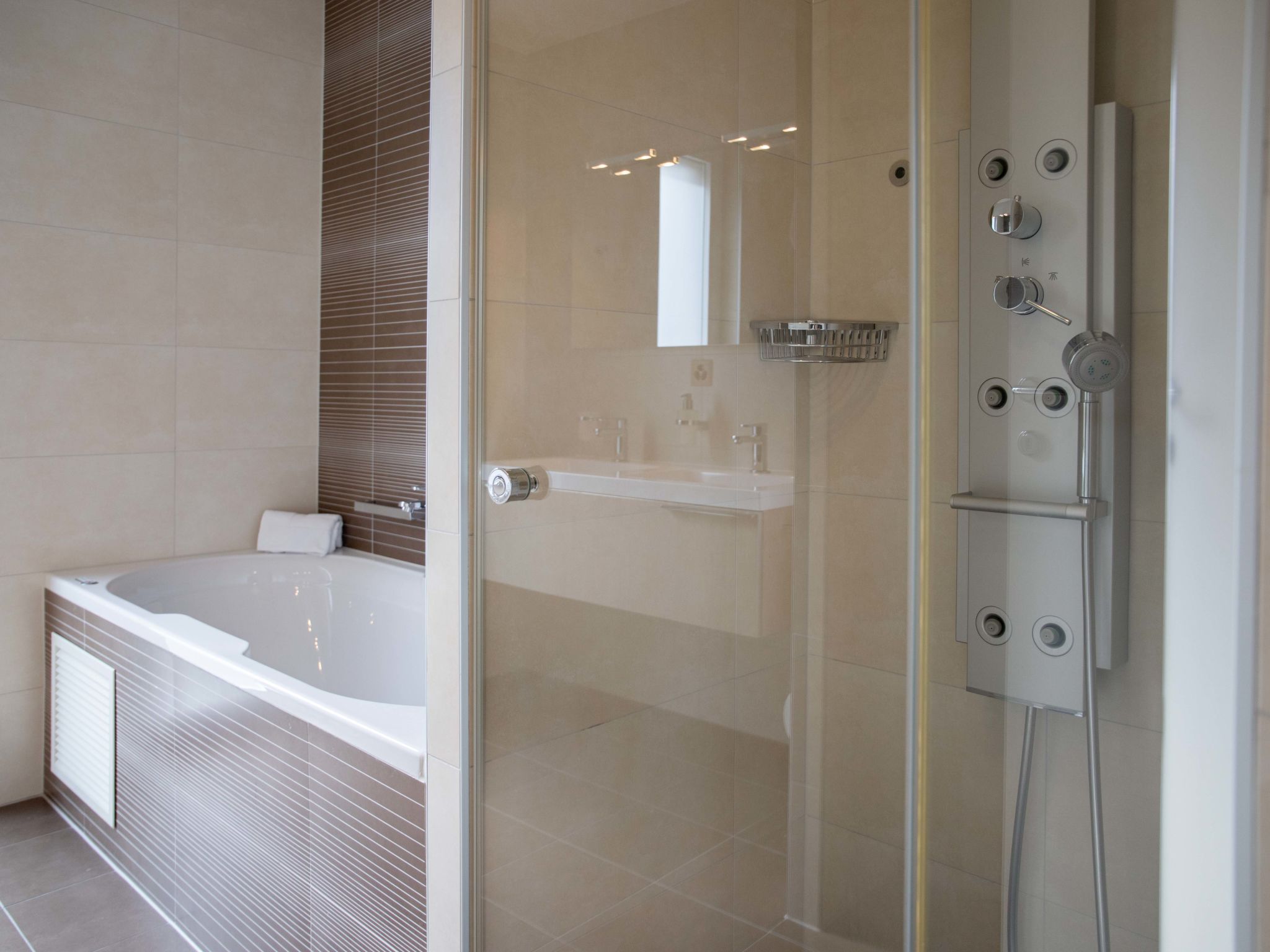 "L'Esplanade A1.4", apt. di 5 locali 214 m2 al 1. piano. Arredamento lussuoso e di buon gusto: soggiorno/sala da pranzo grande con camino (solo con funzione decorativa), TV (via cavo), DVD, riscaldamento a gas, climatizzazione e tapparelle elettriche. Uscita sulla terrazza. 1 camera grande con 1 letto doppio (160 cm, lunghezza 200 cm), vasca/doccia/WC e climatizzazione. 1 camera grande con 2 letti (90 cm, lunghezza 200 cm), vasca/doccia/WC e climatizzazione. 1 camera con 2 letti (90 cm, lunghezza 200 cm), climatizzazione. 1 camera con 1 letto (90 cm, lunghezza 200 cm). Studio. Cucina (forno, lavastoviglie, 4 piastre cottura in vetroceramica, tostapane, bollitore elettrico, forno a microonde, congelatore, macchina da caffè elettrica, capsule per la macchina da caffè (Nespresso) extra). Doccia/WC, vasca/doccia/WC. Terrazza 18 m2. Mobili da terrazza, sedie a sdraio (2). Bella vista sul lago, sulle montagne, sul paesaggio e sulla località. A disposizione: lavatrice, asciugatrice, ferro da stiro, asciugacapelli. Internet (wifi, gratis). Garage nr. 85, altezza 190 cm. Prego notare: appartamento per non fumatori, posto auto solo per vettura di piccole dimensioni.