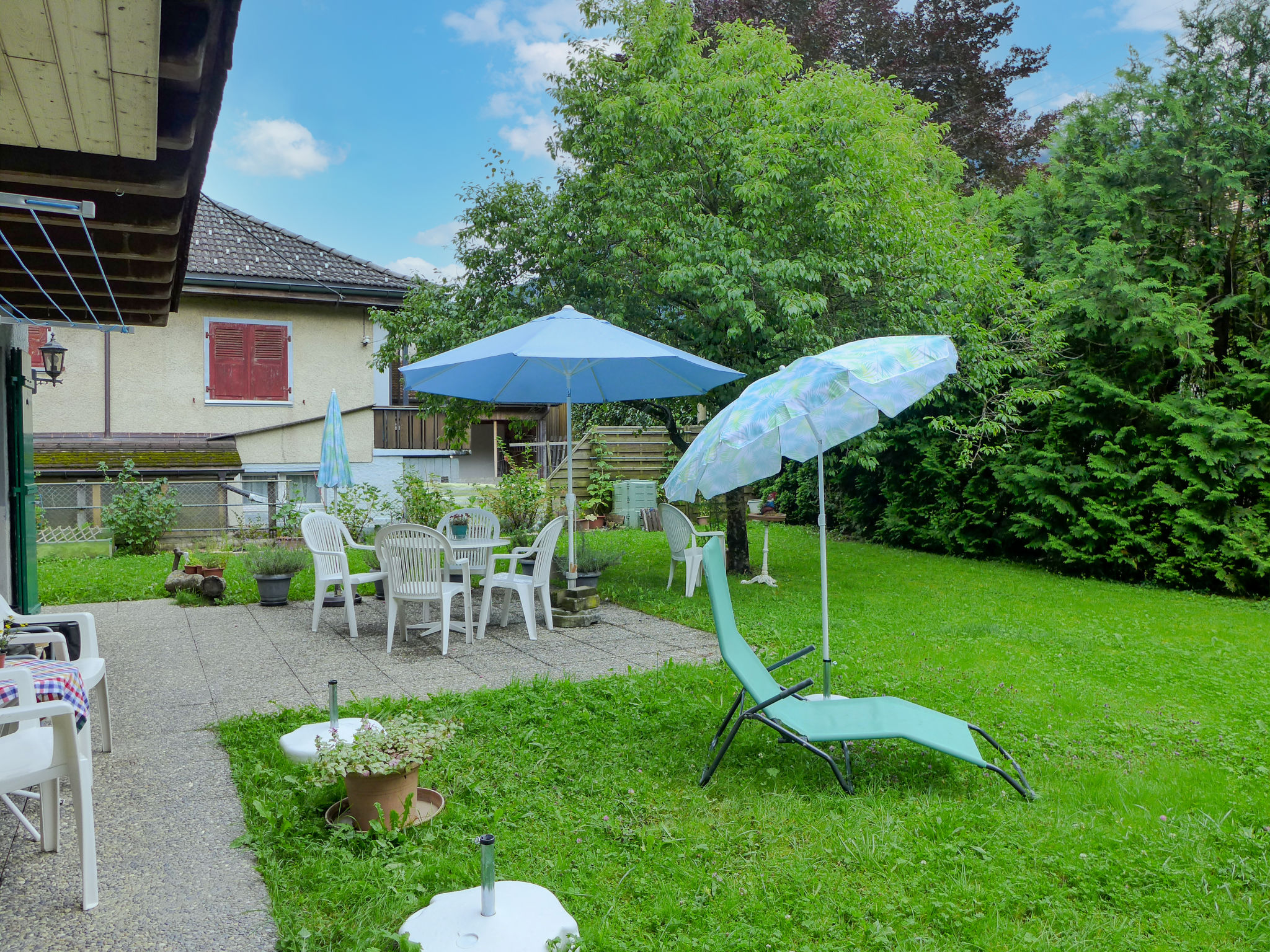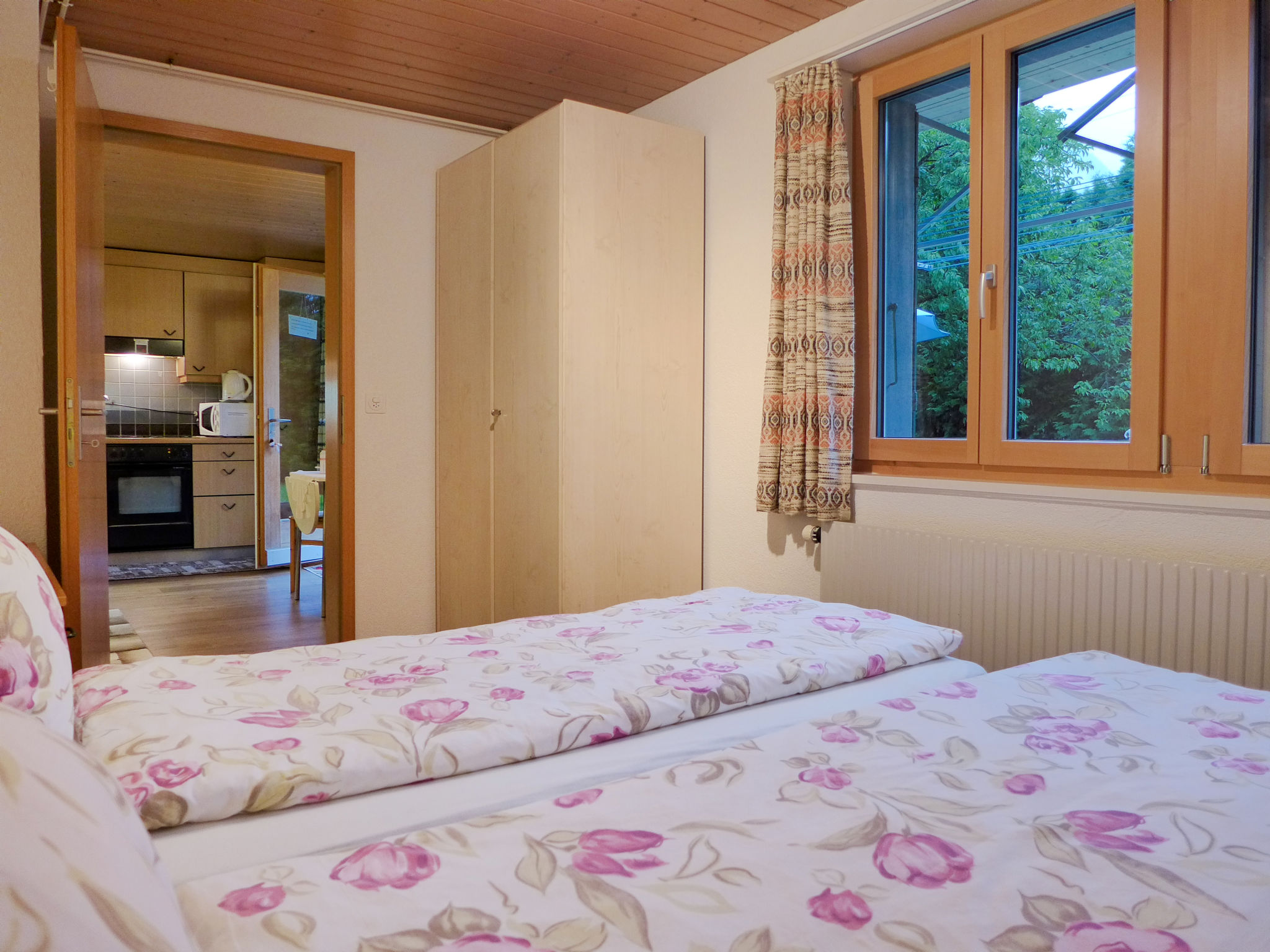 "Erika", apt. di 2 locali 35 m2, al pianterreno. Arredamento funzionale e accogliente: soggiorno/sala da pranzo con 1 divano letto, tavolo da pranzo e TV (satellite) (schermo piatto), radio. Uscita sul giardino. 1 camera con 2 letti (90 cm, lunghezza 200 cm). Cucina aperta (forno, lavastoviglie, 4 piastre cottura in vetroceramica, tostapane, bollitore elettrico, forno a microonde, macchina da caffè elettrica, capsule per la macchina da caffè (Delizio) extra, set per raclette, set per fondue (formaggio)). Doccia/WC. Grande terrazza. Mobili da terrazza, barbecue, sedie a sdraio. Parziale vista sulle montagne e sul paesaggio. A disposizione: lavatrice, ferro da stiro, asciugacapelli. Internet (wifi, gratis). Parcheggio. Prego notare: appartamento per non fumatori.