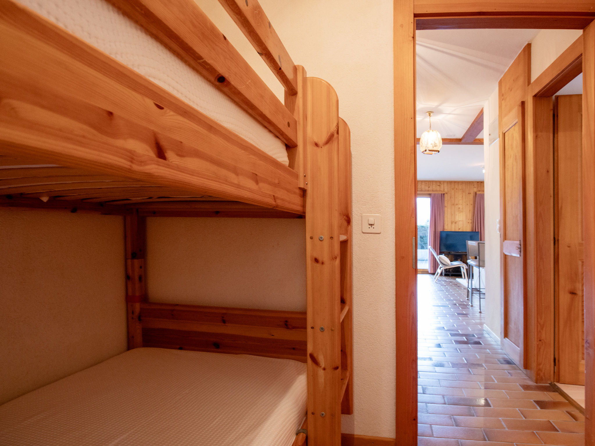 "Le Schuss 1", apt. di 3 locali 52 m2, al pianterreno, esposizione sud-est. Oggetto adatto a 2 adulti + 2 bambini. Arredamento confortevole e gradevole: soggiorno/sala da pranzo con camino, tavolo da pranzo e TV (schermo piatto). Uscita sulla terrazza, esposizione sud-est. 1 camera con 1 letto doppio (1 x 160 cm, lunghezza 200 cm). 1 camera, senza armadio con 1 x 2 letti a castello (90 cm, lunghezza 200 cm). Cucina aperta (lavastoviglie, 4 piastre cottura in vetroceramica, tostapane, bollitore elettrico, congelatore, macchina da caffè elettrica, capsule per la macchina da caffè (Delizio) extra, vaporiera, set per raclette, set per fondue (formaggio)). Uscita sulla terrazza, esposizione sud-ovest. Doccia/WC. Grande terrazza 25 m2, esposizione sud-est e esposizione sud-ovest. Mobili da terrazza. Bella vista sulle montagne. A disposizione: lavatrice, asciugacapelli. Internet (wifi, gratis). Parcheggio nr. 1 (coperto, 1 Auto). Prego notare: appartamento per non fumatori.