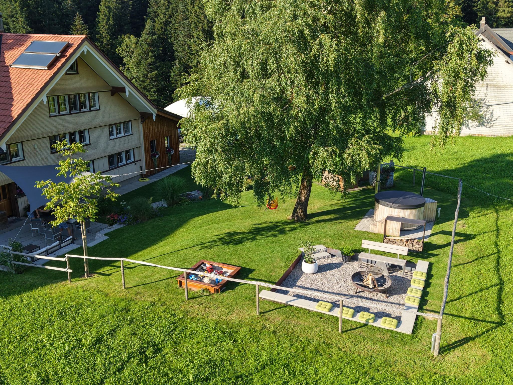Welcome to our historic farmhouse - a special holiday home with charm and comfortIn a lovingly renovated farmhouse dating back to 1707, we rent out a spacious attic flat that can accommodate 6 to 7 people. The renovation was carried out in 2020 according to building biology guidelines - with great emphasis on healthy materials and the preservation of historical elements.The flat extends over the second and third floors and combines modern living comfort with the charm of times gone by. Two bedrooms that can be darkened ensure a restful night's sleep. An open-plan kitchen, a cosy living room and a bathroom with shower create a comfortable atmosphere - perfect for a relaxing holiday.Please note: Due to the largely preserved old room structure, the flat is not barrier-free. The centuries-old doorsteps are part of the authentic character of the house, but require some attention. (especially for tall people) ;-)Equipment & extras:Own washing machine and dishwasher - ideal for longer staysDVD player, board games and two games consoles - for entertainment whatever the weatherLarge barbecue area for sausages from the stick/barbecue or simply great adventure evenings by the fire.Located right on the edge of the forest - ideal for walks and nature experiencesA small stream in the forest invites you to take a dip and splash aroundIn the newly designed garden you can laze around to your heart's content.As a little break from everyday life, the in-house sauna with colour light therapy can be used for a small extra charge. If you wish, we can also heat up the hot tub in the garden for you to relax in. It is equipped with massage jets and an aerator. (separate tariff / not possible if water is scarce)Schwellbrunn was voted the most beautiful village in Switzerland by the Swiss population in 2017. In summer, beautiful hiking trails can be explored right on the doorstep. There are plenty of bike trails and e-bike routes in the surrounding area.The Appenzellerland and the Lake Constance region offer a variety of culinary, sporting and recreational activities. There is something for everyone in the surrounding area. In winter, various snowshoe hiking trails pass close to the house. A cross-country ski trail can also be used day and night.The farmhouse is located just outside Schwellbrunn on a private road. Direct access to the house is possible and parking spaces are available right next to the flat. The steep road, paved with Ecoraster, is not necessarily recommended for cars with long wheelbase or lowered cars. The nearest bus stop is a 30-minute walk away. By car it is 10 minutes to Herisau and 20 minutes to the city of St.Gallen or Appenzell.We, the landlords, also live on the property. You are welcome to use all amenities in common. We will be happy to answer any questions you may have about your stay.Enjoy peace, nature and a unique living experience in our historic home. We look forward to your visit!