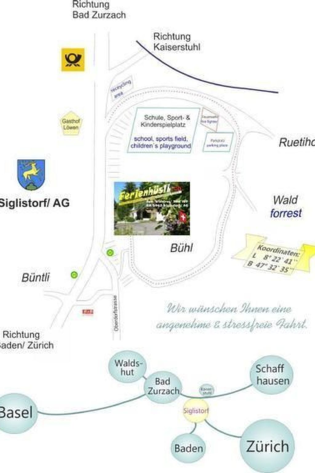 Massimo 2 animali/cani consentiti. 70m² of relaxation between the southern Black Forest, the Rhine (fall), thermal baths and Zurich Thank you for your interest in us - we look forward to welcoming you to Ferienhüsli.ch. The Ferienhüsli offers you a living room (TV, DVD, DAB+ radio and WLAN), bedroom and children's room (incl. extra bed), as well as a well-equipped kitchen with dishwasher (after all, you are on holiday ;-)) and a bathroom with bathtub and shower - on the ground floor. All areas are equipped with underfloor heating. You have a separate entrance on the car park side and your own, partly covered terrace with blinds and outdoor seating area to enjoy the midday to evening sun! The window façade can be opened completely and in front of the terrace you have your own lawn area, which you can of course use as you wish (table tennis table/ tent/ sun lounger/ fire oven etc.). There is further seating on the lower lawn. You can use the fireplace for a campfire, barbecue, enjoy nature and in summer there is an above-ground pool in the garden (unfortunately it is not allowed to build). You are invited to try the seasonal fruit and the herb garden is also at your disposal. The flat is at the end of a cul-de-sac and the new cycle path starts almost directly at the property. There is a large playground a short distance away, as well as the municipality's well-maintained sports field and plenty of woodland... Surroundings: Siglistorf is located on the cantonal border between the cantons of Aargau & Zurich - not far from the spa towns of Bad Zurzach and Baden with their thermal baths and historic town centres (Baden = highest Swiss total mineralisation of 4450mg/l at 46.6°C, Aquae Helveticae). The central location offers the best conditions for interesting excursions. You can be in Zurich or at the Rhine Falls in 30 minutes, in Lucerne or Basel in 1 hour and most of Switzerland's castles, fortresses and palaces are located in the canton of Aargau. Whether by bike or on foot, it is also worth visiting attractive excursion destinations in the nearby region:- Alpine view from Regensberg or Stadler Turm - Alpine rose reserve - medieval town of Kaiserstuhl - Rhine boat trip and much more. A wide range of flyers are available for a variety of leisure activities - to explore the region according to your taste and of course we are happy to answer your questions and can also give you further tips.We are private landlords and on request we help where we can......Kind regardsFamily WichtreySports facilities in the area: football pitch, cycling tours, riding arena / riding facilities.