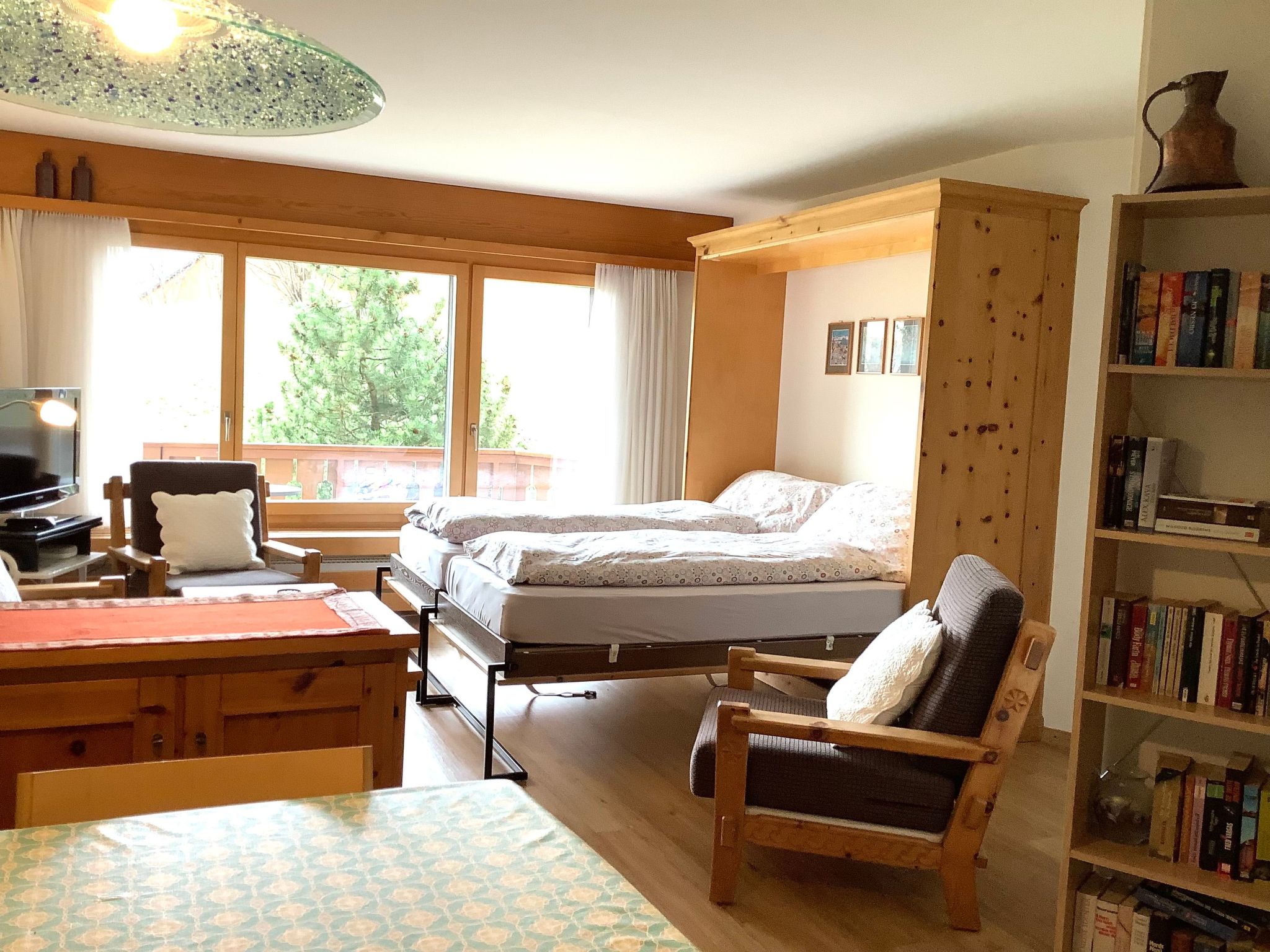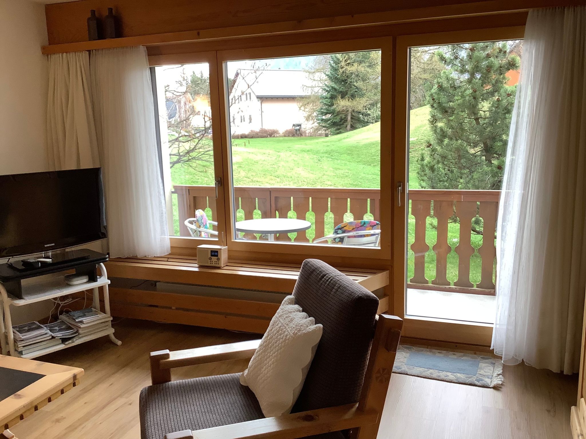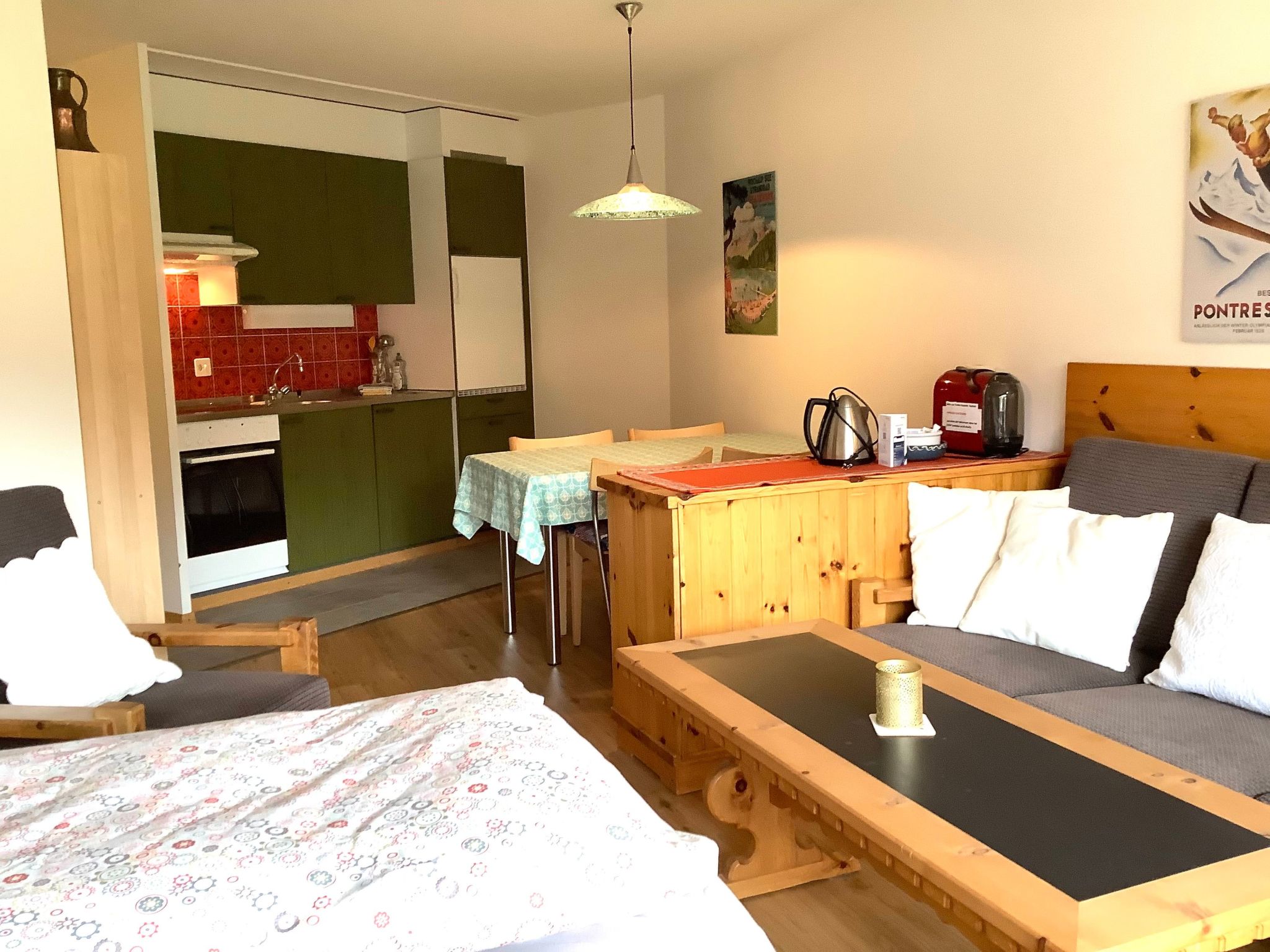 FREE PUBLIC TRANSPORT TICKETS FOR BUS AND TRAIN SUMMER AND WINTER SEASON. Beautiful, spacious 1 1/2 room flat (38m2) furnished with Swiss stone pine on the mezzanine floor, quiet location with little traffic. Living room with 2 foldaway beds SWISSCOM TV, Internet WLAN FREE furnished balcony with view of the mountains towards the Bernina Pass. Open kitchen with electric cooker (glass ceramic hob) with oven, fridge, coffee machine, toaster, kettle, fondue set. Bathroom/bathtub/WC. Washing machine, ski room, bicycle room in the house. An outdoor car park is available free of charge. Near bus station, cross-country ski run and hiking trails. Pets not allowed. Non-smoking flat. All bed linen, towels and kitchen linen included.A new bus line connects all three major ski areas directly from our bus stop. (3 min. walk)Biker friendly.Excursion possibilities: These mountains. These lakes. This light! On 580 kilometres of hiking trails across all mountains or by mountain bike on 400 kilometres of enjoyable trails: the Upper Engadine offers a first-class network of hiking trails and mountain bike trails in the midst of the pristine mountain world and the inspiring Upper Engadine lake district. The three flow trails on the Corviglia provide the right flow. The lakes of the Upper Engadin are also popular with sports enthusiasts. Kitesurfing, sailing, windsurfing, stand-up paddling: the possibilities are almost endless. The expanse of the inspiring high valley can be experienced in a particularly impressive way on the two 18-hole golf courses in Samedan and Zuoz. And in addition to the wide range of sporting activities on offer, there are also first-class cultural attractions such as a visit to the museum or the numerous art galleries in the various villages.In winter, 350 kilometres of the finest pistes in the Corviglia, Corvatsch and Diavolezza ski areas and the family-friendly Zuoz invite you to enjoy true skiing and snowboarding fun. Cross-country skiers will find over 220 kilometres of groomed trails in the Upper Engadine and the side valleys. The winter hiking trails and cross-country ski trails on the frozen lakes of the Upper Engadine sparkle with light, sunshine and vastness in the midst of an inspiring mountain world. Those who want to enjoy the tranquillity and beauty of the snow-covered forests can hike along the 150 km of winter hiking trails in the side valleys of Val Roseg, Val Fex or Val Bever, while those who prefer an overview can enjoy breathtaking views on the panoramic hiking trails high above the lakes on Muottas Muragl.Families can enjoy the Engadin sunshine on a carriage ride into Val Roseg or Val Fex, or toboggan down into the valley on the 4.2 km long, winding Muottas Muragl toboggan run.Welcome to Engadin St. Moritz.Other kitchen equipment (Kitchen1): Fondue crockery, kettle, pressure cookerSports facilities in the area: fishing, basketball, mountaineering, football pitch, ice skating, golf course, canoeing, climbing, mountain biking, paragliding, bike tours, rafting, riding boxes (guests), indoor riding arena, riding arena / riding facilities, tobogganing, rowing, skiing (alpine), skiing (cross-country), sports centre, squash, surfing, diving, tennis, sailingLocation description: Pontresina - The fine pleasures of the high Alps Old Engadine houses and stylish hotel buildings from the Belle Epoque characterise the sunny, sheltered high-altitude health resort. Nestled against a breathtaking backdrop of majestic mountain peaks, above all Piz Bernina, the highest peak in the Eastern Alps, Pontresina is the starting point for alpinists, hikers and climbers in both summer and winter. But culture lovers, romantics and connoisseurs will also find real gems in and around Pontresina, for example a horse-drawn carriage ride into the contrasting Val Roseg or the Bernina Express to the south. In winter, countless inspiring cross-country skiing routes and picturesque winter hiking trails through the enchanting landscape are a treat for the senses. The Diavolezza ski area, which is particularly popular with freeriders, is just a stone's throw away. In summer, the largest colony of ibex in Switzerland delights explorers, while the new "Bernina-Glaciers" adventure area brings the fascination of glaciers in the Bernina region to life.