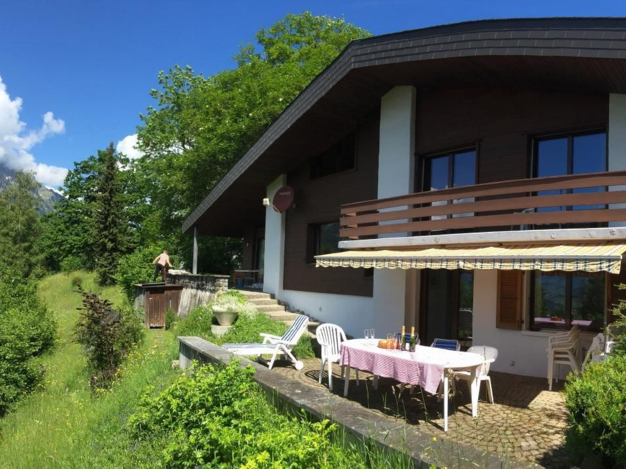 Massimo 2 animali/cani consentiti. Halteweidli is a 200m2, 6-bedroom chalet in Aeschi bei Spiez that can hold up to 16 people, in the heart of the Bernese Oberland. The chalet is south facing, with two sunny terraces and a 1500m2 garden, breathtaking views the length of the Kandertal, and, from the North side, of the Thunersee. It is right on the cross country trails, and about one km from the local downhill pistes. Being just a 30min drive from Wengen, Kandersteg, Grindelweg, Adelboden, Gstaad and Lautebrunnen, it is ideal for those that like challenging and varied skiing. It is very secluded at the end of a private lane (which is cleared by the commune!), with our nearest neighbour some 400m away, on the edge of the Suldtal nature reserve. It isn’t rare to see deer next to the chalet while you have your morning coffee! It is 2 hours door-to-door from Geneva, 30mins from Bern, 1.5hrs from Lausanne, Basel and Zurich. The chalet is both elegant and cosy, with high ceilings, south facing picture windows, an open fire place, wifi, large screen TV, DVD, etc. It is ideal for families with loads of games and a split-level 18m2 children's room. One double bedroom is equipped with a cot. It is ideal for cross-country skiers, people who love to get away from the crowd, those who enjoy varied downhill skiing in top resorts, families with children, and those who appreciate a beautifully kept, unique chalet, in an absolutely top location.Other leisure facilities: All year: Indoor swimming pool with wellness and massage, paraglide tandem flights, helicopter tours, guided tour on the Lamafarm, western riding, visiting the earthworm yard, visit the farm Hatti. Summer: Carriage Rides, Electro Bike and Mountain Bike rental, Cheese Dairy Visits, Botanical Excursions, a lot of hiking possibilities, guided village tours. Winter: Skiing, snowboarding, sledging, cross country skiing, winter walking paths, snow shoe hiking, Christmas path.Excursion possibilities: Nature reserve Suld Valley: Starting at the restaurant Pochtenfall you reach the imposing 80 m high waterfall after 20 minutes walk. Apart from easy or demanding walks the valley of Suld offers many possibilities for barbecues, picnics and relaxing in pure nature. Niesen "the swiss pyramid": After a spectacular ride by the funicular train, the view from the top at an altitude of 2362 meters offers a splendid 360° panorama of the imposing Bernese Alps, the lakes Thun and Brienz and to the Bernese lowland. Jungfraujoch - Top of Europe: A highlight of every Swiss journey is an unforgettable day trip to the highest situated railway station of Europe and the alpine wonder world of ice and snow at 3454 meters. Lakes of Thun and Brienz: This beautiful lakes are the heart and the center of the Bernese Oberland. While you enjoy a good meal or a glass of wine on board of a ship while your eyes will rest by glancing at the lovely shores with the splendid historical castels and up to the highest mountain peaks. Other living room features (Living room1): Dining room seats 14, windows on 3 sides, high ceilings, open fire place, flat screen TVOther bedroom furniture (Bedroom1): Built-in wardrobe, carpet floor, south facing, access to the lower terraceOther kitchen equipment (Kitchen1): microwave/grill, nespresso machine, induction plates, dishwasher, raclette and fondue sets, fully equipped with mixer, etcNearby sports facilities: Fishing, Mountain climbing, Climbing, Mountainbiking, Bike tours, Rafting, Horse stalls (guests), Riding possibilities, Toboggen, Rowing, Skiing (alpin), Cross-country skiing, Diving, Tennis, Water skiing, SailingLocation description: Aeschi (860 m above sea level) and the somewhat higher situated Aeschiried (1000 m) lie on a sunny terrace and offer a wonderful view of the surrounding mountain panorama and of the Lake Thun. The original Peasant village is still marked of farming, folklore and tradition. If you want to escape the everyday hectic, you are just right staying with us. Aeschi offers an intact nature to refuel your batteries. Thanks to the very central situation, all the well known tourist destinations of the Bernese Oberland are very close. Aeschi is easy to reach both by public transport (train to Spiez and bus to Aeschi/Aeschiried) and by car. Apart from two grocery shops there are also a butchery, two bakeries, a cheese shop, two banks, a post office, 2 flower shops and a doctor.
