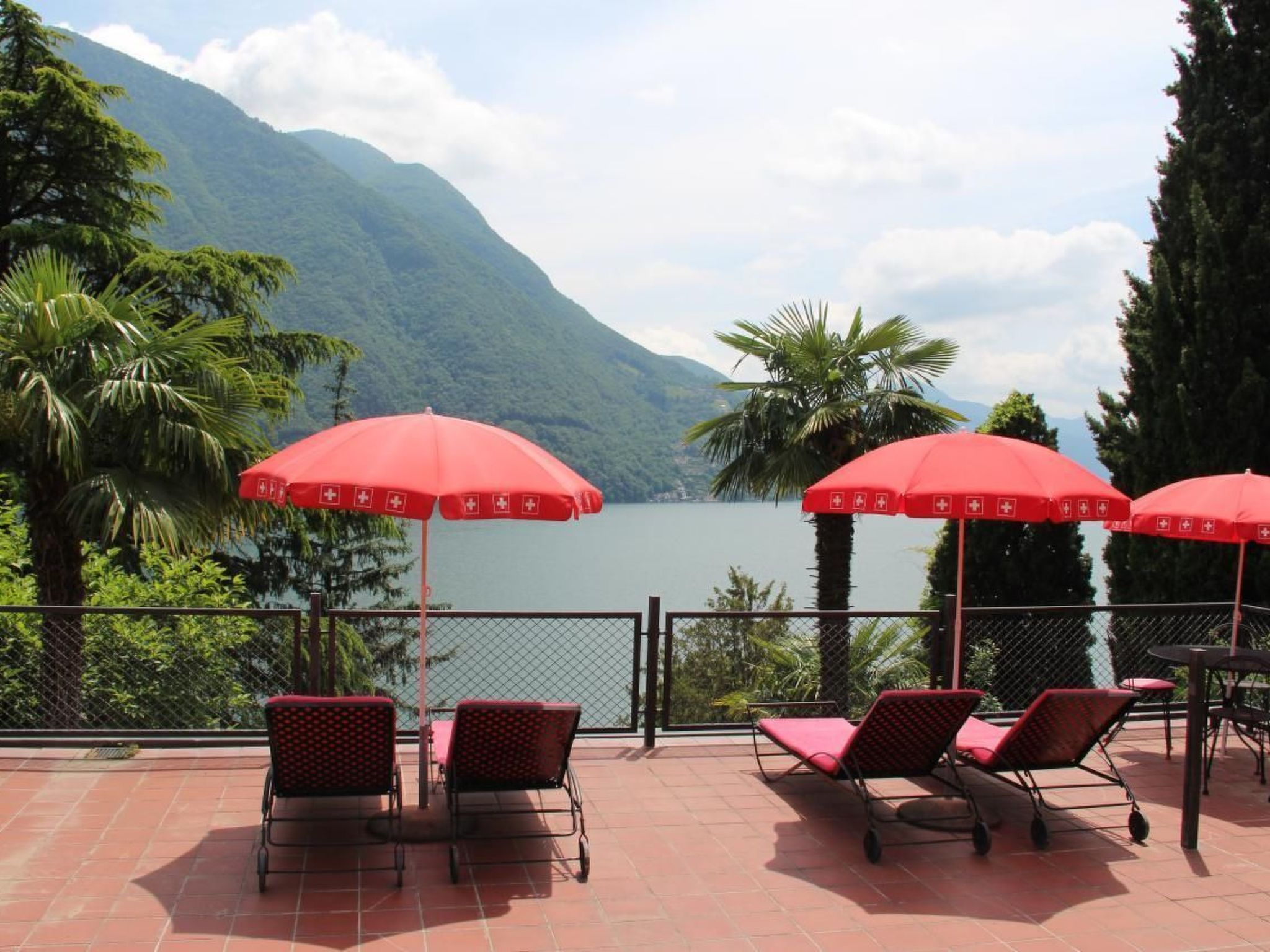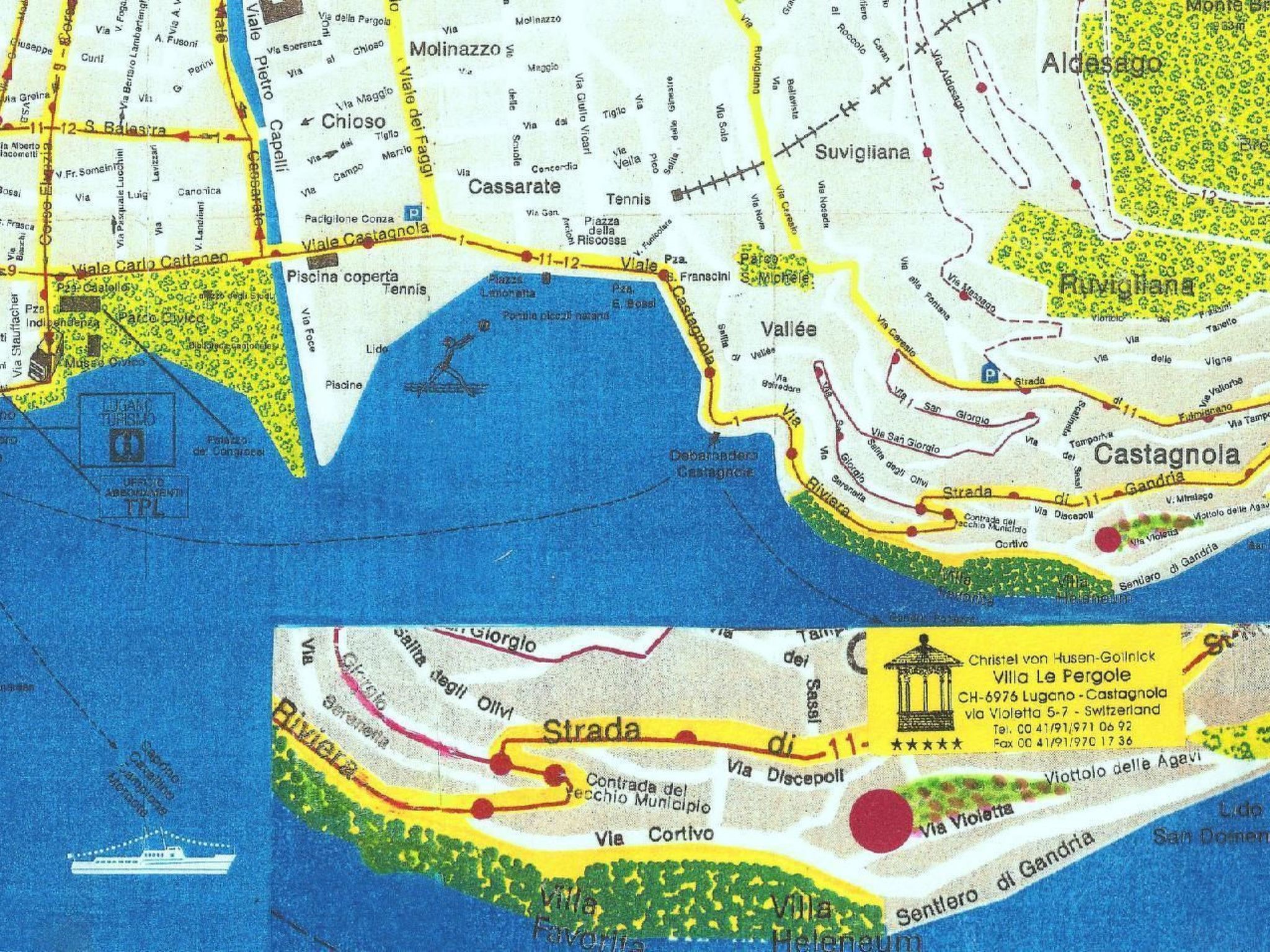 The nostalgic BARONY LE PERGOLE with 3 villas and a total of 10 flats, all with private entrances directly from the outside (non-smoking) of different sizes for 1-9 persons, is located in the most exclusive residential area of the municipality of LUGANO, namely in Castagnola at the foot of "Monte Brè" near the lake and at the beginning of the romantic lakeside path to the picturesque fishing village of "Gandria". The exceptional historic residence is peacefully and sunnily enthroned away from any disturbance from municipal and cantonal roads above a terraced Mediterranean tree garden with palm trees between the private cul-de-sac "via Violetta" and the ancient olive footpath "Viottolo degli Agavi" of Lugano-Castagnola.Communal indoor swimming pool 4x8 m for swimmers aged 8 and over accompanied by adults - subject to charge - in operation from June to September with 140 m2 of communal sun terraces with table tennis, deckchairs and parasols are available to guests.Subject to official closure at any time due to Covid.However, in 130 m via private road + stairs down to the lake communal boat and bathing jetty (free of charge) and in 500 m via ancient olive footpath to the lido "Lido San Domenico" with swimming in the lake (for a fee).All flats are tastefully and comfortably furnished, some with valuable antique furniture (for connoisseurs): Washing machine with integrated tumble dryer and/or communal tumble dryer in the wash house on the communal terrace. TV, safe and WiFi (free of charge), air conditioning and/or air conditioning units. Electricity consumption to be paid according to meter. To: lake with bathing jetty (for adults) and landing stage 130 m + steps, scheduled boat at the "Villa Heleneum" museum 250 m, Lido San Domenico 400 m, bus 70-400 m, restaurants 300 m, grocers, Lido Lugano, tennis court, fitness centre, mountain railway to Monte Brè 1.2 to 1.5 km. Centre of Lugano 2.5 km. Residence managed by the owner, who lives on site.Non-smoking flat. Zoover Awards 2010 to 2012 "Best holiday home Lugano".Car park for normal 4 pers. car or 5 pers. van available with advance reservation to be paid on arrival.The additional costs are to be paid in cash on arrival and the guarantee deposit is to be paid in cash on arrival. NL-4372