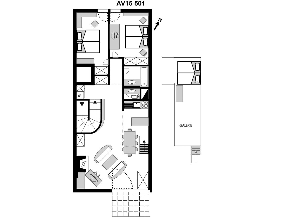 Appartement comprenant 1 hall d'entrée,1 chambre avec lit double et une TV,1 chambre avec 2 lits simples,1 lit double à la mésanine. 1 salle de bain,1 wc séparé,le séjour avec une mésanine comprenant une cuisine toute équipée,cuisinière 4 plaques vitrocérame,un four, un grand frigo, un lave vaisselle, une machine à café Nespresso, coin à manger, 2 canapés 2 places, 1 TV. grand balcon plein sud. 1 garage.