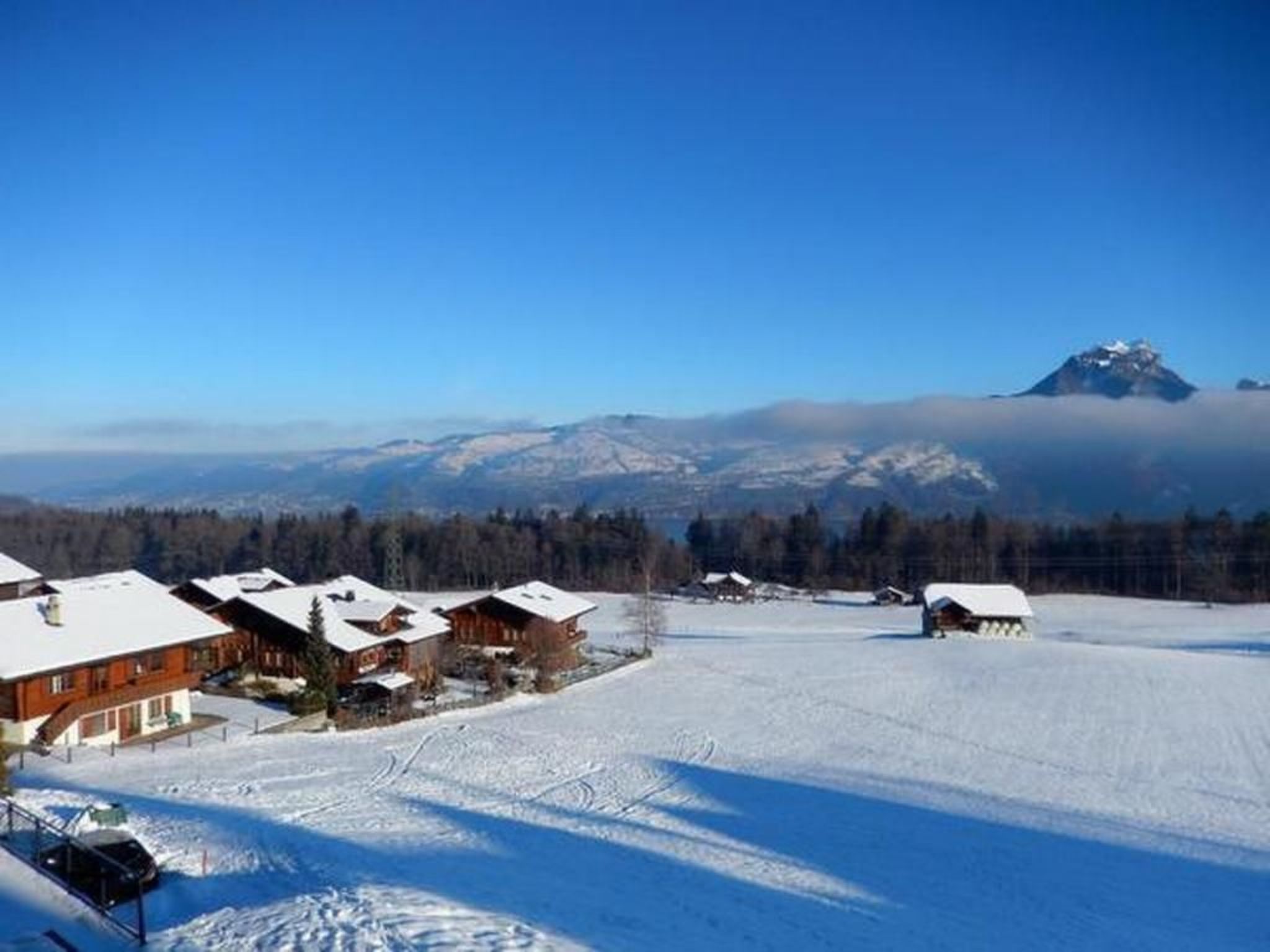 This comfortable and well-equipped two-room flat is located on the 1st floor of a chalet in mint condition. From the spacious balcony, you can enjoy an enchanting view of Lake Thun, the Niederhorn and the Alps and towards Interlaken and Thun.KITCHEN:The large and very well-equipped kitchen includes a ceramic hob, oven, large fridge with freezer compartment and dishwasher. The equipment also includes a NESPRESSO coffee machine, kettle, toaster, hand blender, raclette oven and fondue caquelon with rechaud.LIVING AND DINING ROOM:The living/dining room has a large table, home TV with over 300 channels, DVD, digital radio, good WiFi and a comfortable sofa that can be converted into a single bed if necessary.BEDROOM:The small cosy bedroom offers a double bed with two separate comfort mattresses. It also has direct access to the balcony.The flat also has its own laundry room and an outside private car park. The lift in the building is certainly a big plus.LOCAL DESCRIPTION:Aeschi and the slightly higher situated Aeschiried are situated on a sunny terrace and offer a marvellous view of the surrounding mountain panorama and Lake Thun. The village is still characterised by agriculture, folklore and tradition. Away from the hustle and bustle of the big city, Aeschi offers peace, relaxation and unspoilt nature. Thanks to its central location, all the well-known excursion destinations in the Bernese Oberland are within easy reach. Aeschi can be reached quickly and easily by public transport (train to Spiez and bus to Aeschi/Aeschiried) as well as by private car.INFRASTRUCTURE:The village centre with two grocery shops, a bakery, butcher's shop, two banks, a flower shop, kiosk, various restaurants and an indoor swimming pool as well as a doctor can be reached on foot in less than 5 minutes.