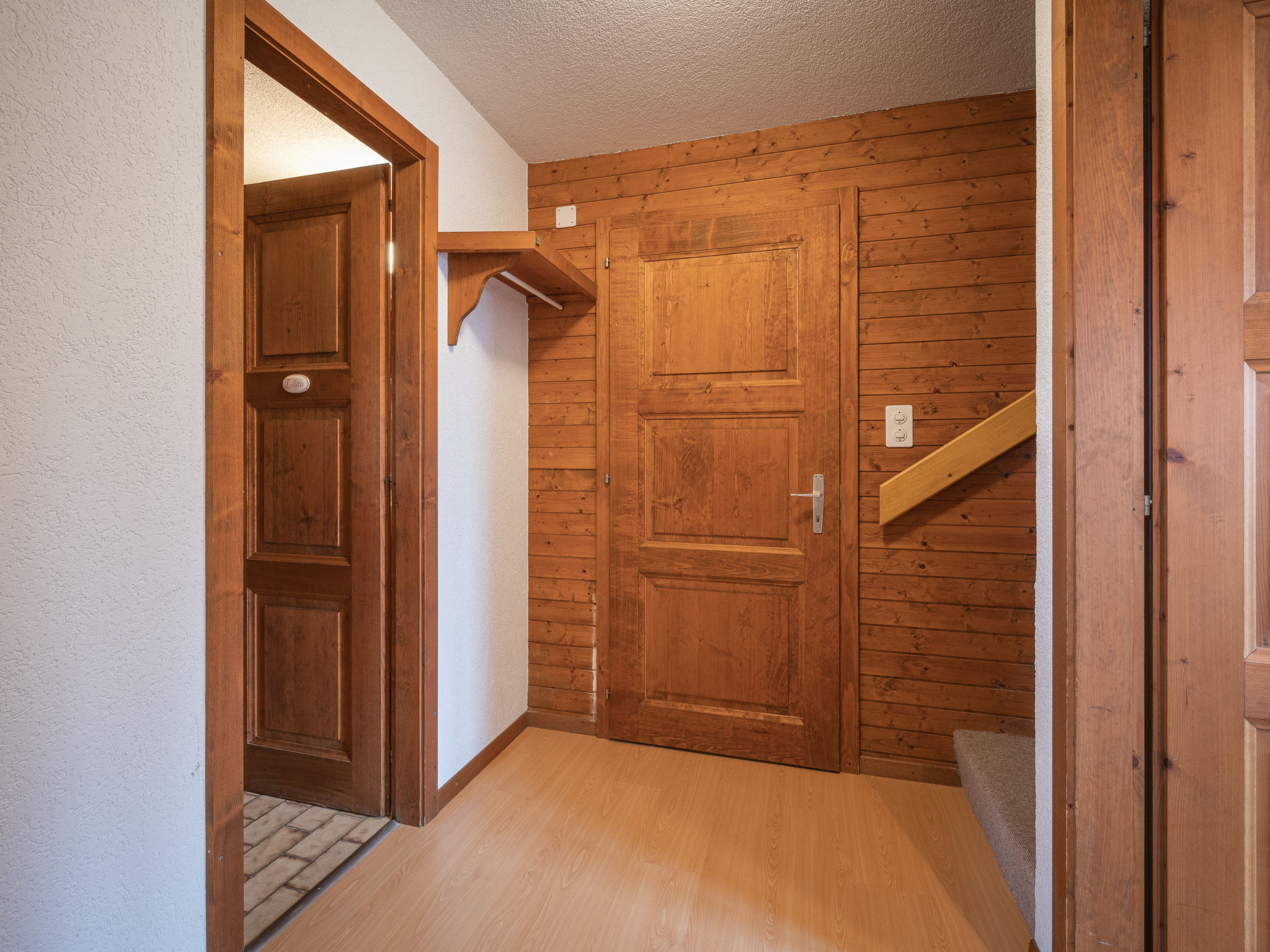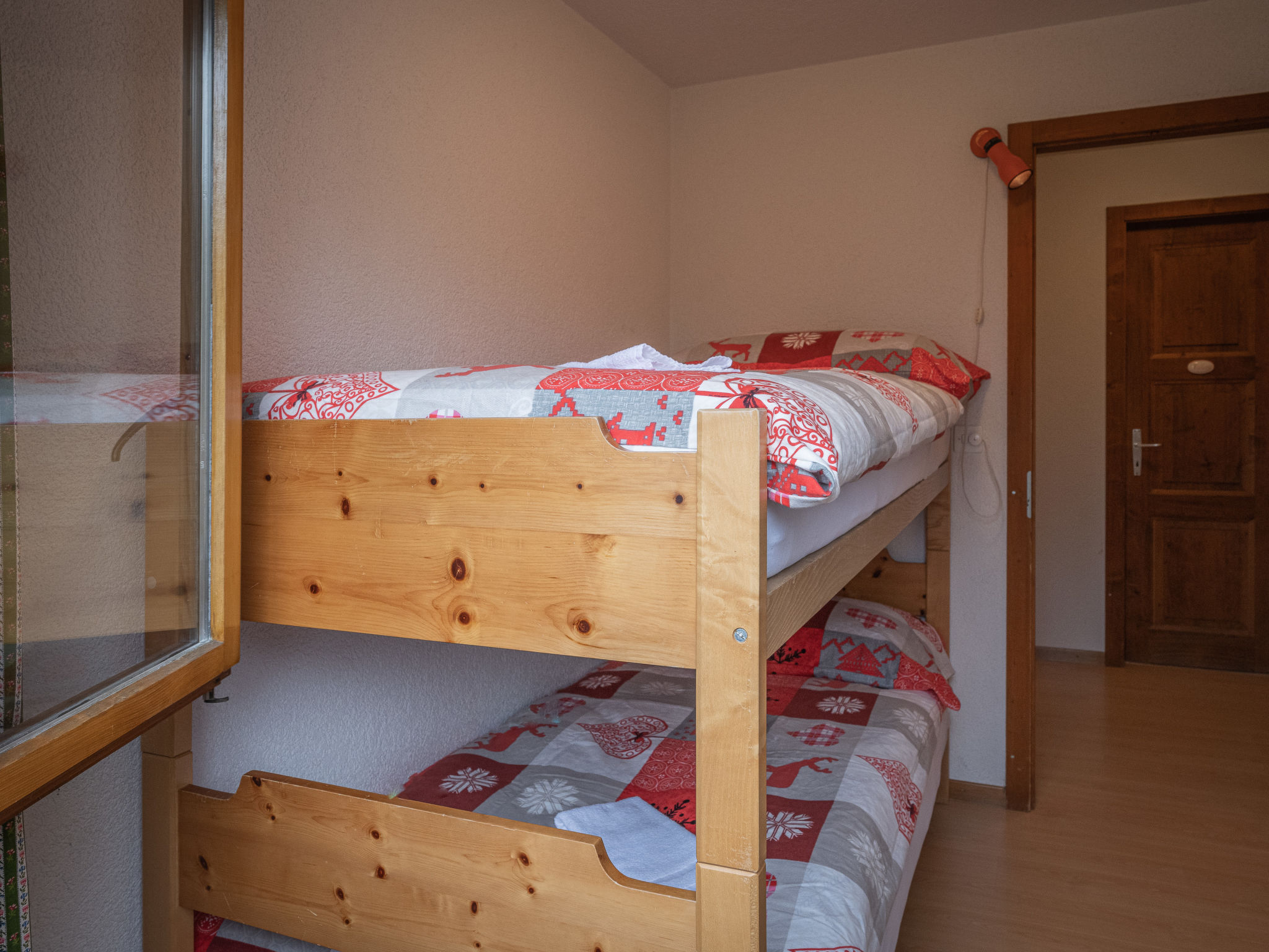 Chalet 4 locali su 2 piani, esposizione sud. Arredamento confortevole: soggiorno/sala da pranzo con camino, TV e radio. Uscita sul balcone. Angolo cottura (forno, lavastoviglie, 4 piastre cottura in vetroceramica, tostapane, forno a microonde, macchina da caffè elettrica, capsule per la macchina da caffè (Nespresso) extra, set per fondue (chinoise, formaggio)). WC separato. Piano inferiore: 1 camera con 2 letti (90 cm). 1 camera con 2 letti e lavabo. 1 camera per bambini con 1 x 2 letti a castello. Vasca/WC, doccia. Riscaldamento elettrico. Balcone. Sedie a sdraio, ripostiglio. Bella vista sulle montagne. A disposizione: ferro da stiro, lettino per bimbi fino 2 anni. Internet (wifi, gratis). Garage. Prego notare: appartamento per non fumatori.
