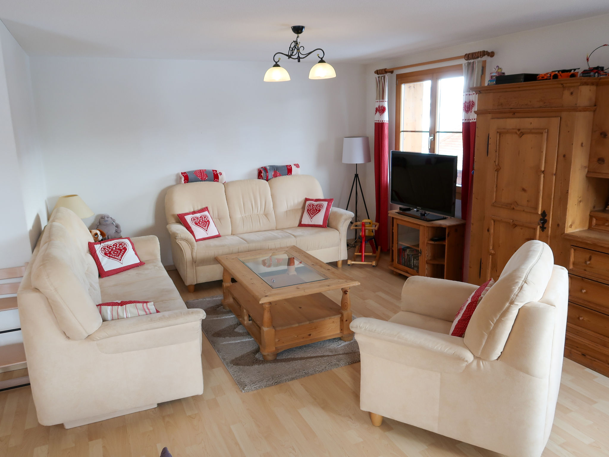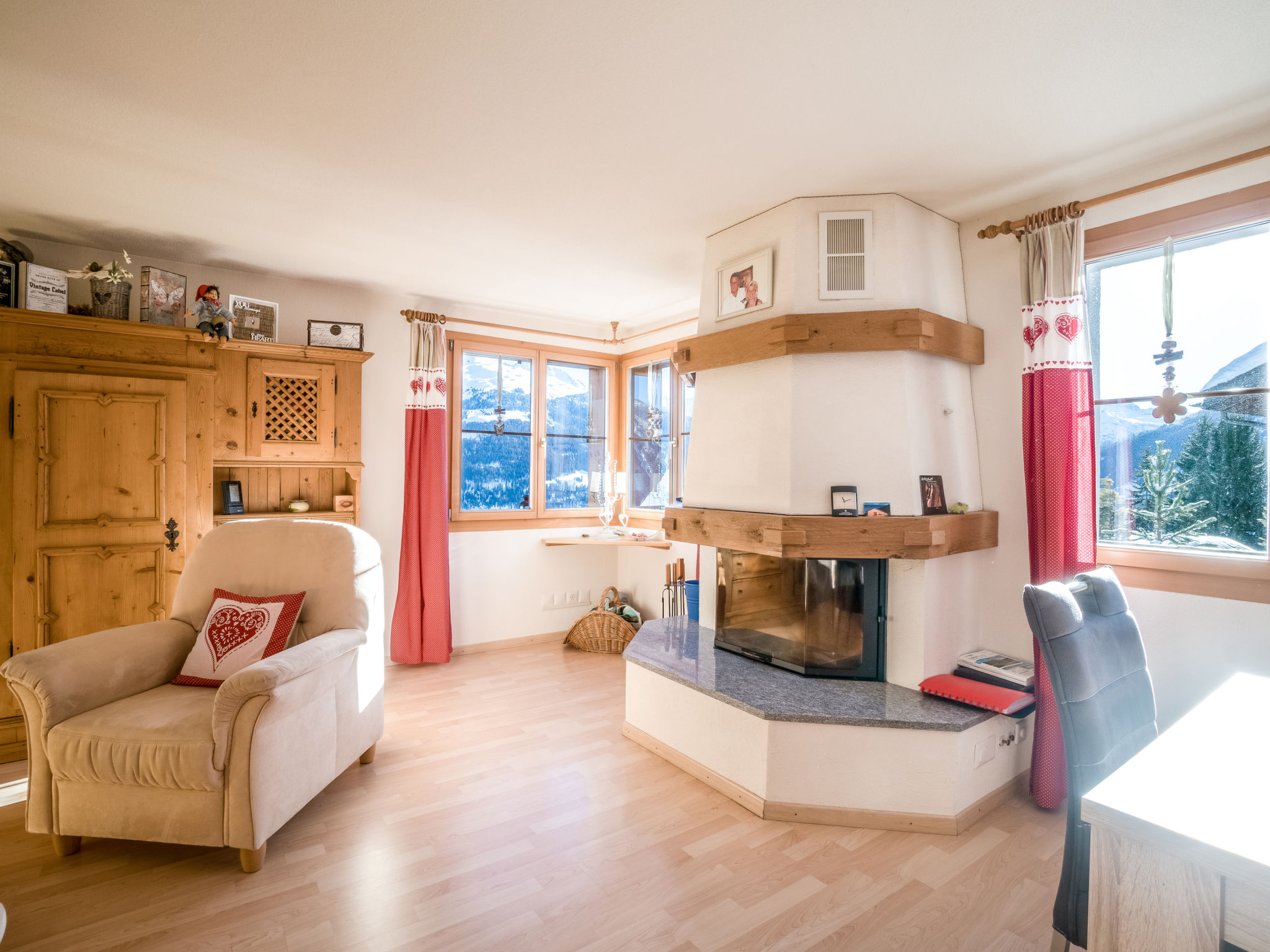 "Tga Stgirat Obergeschoss", apt. di 3 locali 82 m2 al 1. piano. Arredamento confortevole e di buon gusto: soggiorno/sala da pranzo con camino e TV (schermo piatto), DVD. Uscita sulla terrazza. 1 camera matrimoniale. Uscita sulla terrazza. 1 camera matrimoniale. Cucina aperta (forno, lavastoviglie, 4 piastre cottura in vetroceramica, tostapane, bollitore elettrico, macchina da caffè elettrica, set per raclette, set per fondue (formaggio)). Doccia/WC, WC separato. Terrazza 23 m2. Mobili da terrazza. Bella vista sulle montagne, sulla valle e sul paesaggio. A disposizione: asciugacapelli. Internet (wifi, gratis). Parcheggio (1 Auto), garage (extra) vicino alla casa. Prego notare: appartamento per non fumatori. Massimo 1 animale/cane consentito.