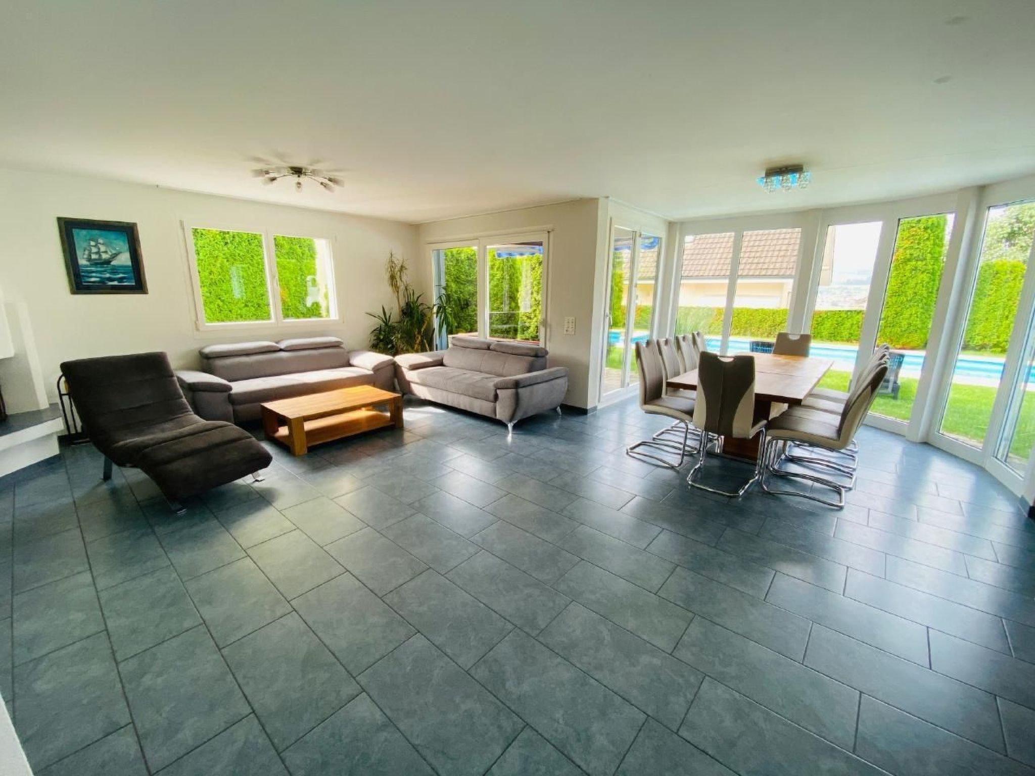 Massimo 2 animali/cani consentiti. Welcome to our villa with numerous relaxation and leisure options. There is a heated 12-metre outdoor pool and a whirlpool that can be used all year round. For sporting activities, there is a fitness area and an infrared sauna. Three terraces, including a pool terrace, and a barbecue area invite you to linger. The surrounding area offers picturesque hiking trails and large grounds with well-tended lawns. The villa has four comfortable bedrooms, a fully equipped kitchen and a very spacious living area. We look forward to your visit! Further information: The heated pool (12 m x 3.5 m) is open from the beginning of April to the end of August, while the whirlpool is available all year round at a pleasant 37 degrees Celsius. The villa consists of four bedrooms, three of which are located on the top floor: - Two rooms, each with a 180x200 cm bed - One room with a 140x200 cm bed - A fourth room in the basement with natural light, equipped with two beds (140x200 cm and 180x200 cm) - A cot (playpen) is also available The house is located on a quiet hillside in a private cul-de-sac and is therefore ideal for children. The breathtaking nature in the immediate vicinity offers numerous beautiful hiking trails that enrich the overall experience. A parking space is available in the locked garage, which is connected to the house. In front of the house there is further parking for up to 4 cars belonging to the property. Further important information: - Only the persons registered at the time of booking may be present in the house and at the pool area; visitors are not permitted. A fee will be charged for unregistered guests. - The house is designed as a wellness oasis and offers a quiet and relaxing holiday. - Due to its location in a residential area, the quiet hours stipulated by the Canton of Aargau (from 12 noon to 1 p.m.) and the quiet hours at night (from 8 p.m.) must be strictly observed. - The house is only suitable for families, business people and groups of adults (30+). Youth groups are not permitted. Such bookings will be automatically cancelled without refund. - Two outdoor cameras cover the entire outdoor area, whereby only the security company has access to the recordings.Excursion options: Lake Hallwil, Aarau, Zurich, Basel, LucerneOther living room equipment (living room1): FireplaceOther bedroom furnishings (bedroom1): Sofa in bedroomOther kitchen equipment (kitchen1): Dolce Gusto and filter coffee machineSports facilities in the surrounding area: ice skating, mountain biking, sports centre, squash, tennisLocation description: A village not far from the motorway in the canton of Aargau. Approx. 30 minutes from Zurich. Total population 3500.