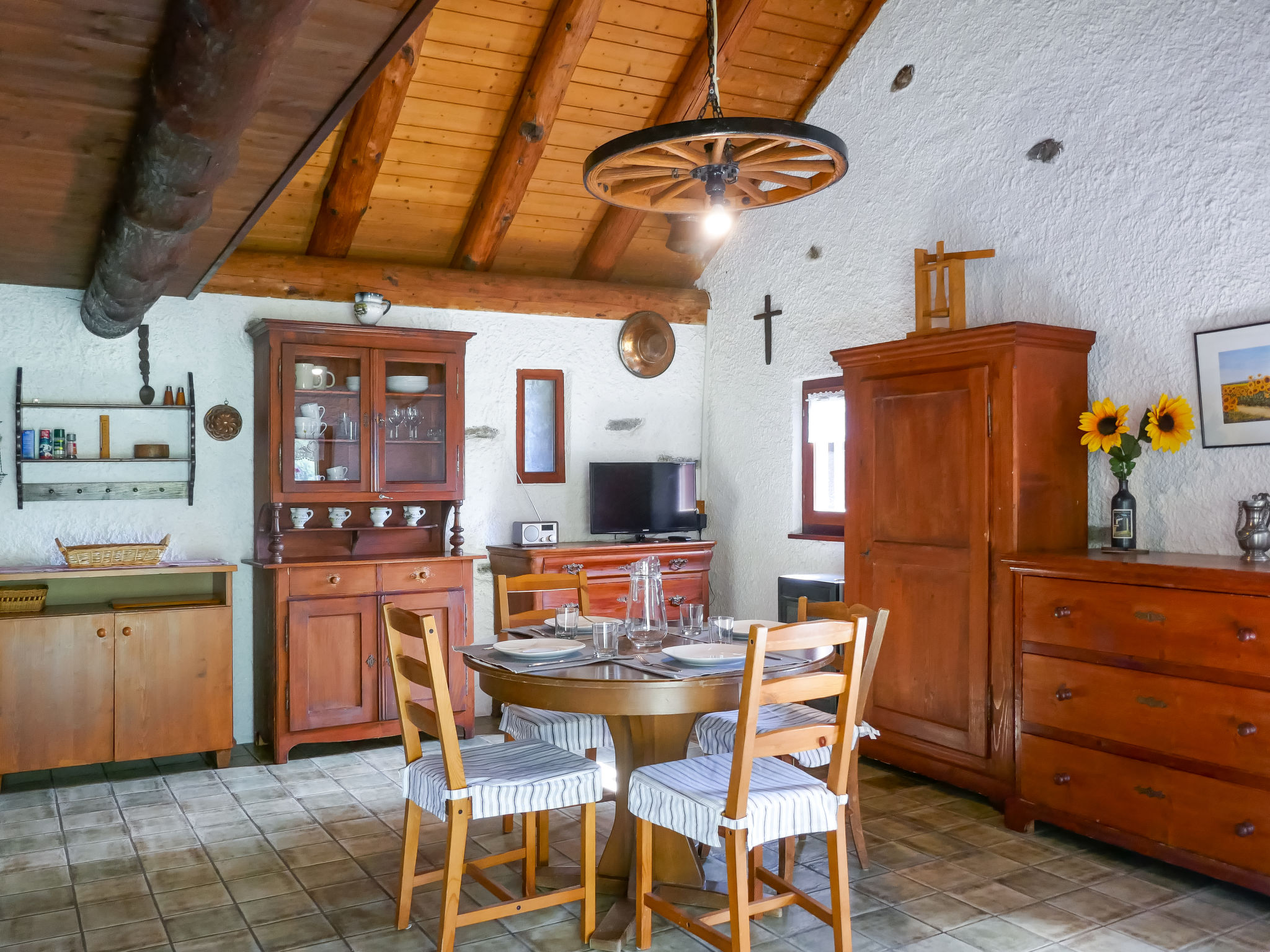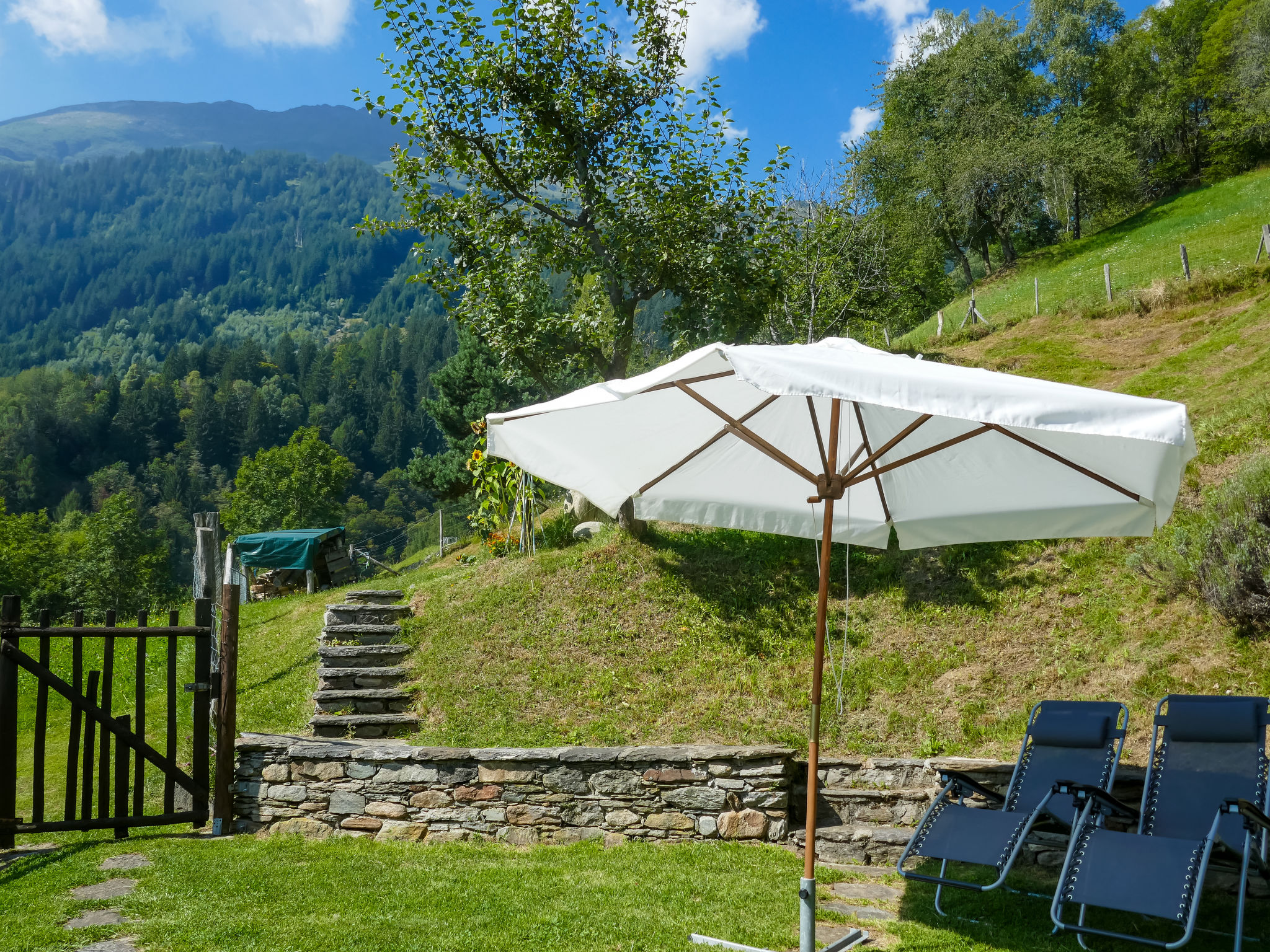 "Rustico Girasole", monolocale casa di campagna 55 m2 su 3 piani, esposizione sud-est. Arredamento semplice e rustico: soggiorno/sala da pranzo aperto con 1 divano letto, camino, TV (satellite), radio e stufa a gas. Uscita sulla terrazza. Cucina aperta (4 punti cottura, forno, fornello a gas) con stufa a legna. Piano inferiore: doccia/WC. Riscaldamento a legna. Corrente da energia solare. Piano superiore: soppalco aperto con 2 letti (90 cm, lunghezza 210 cm), 1 letto doppio (1 x 160 cm, lunghezza 210 cm). Terrazza. Sedie a sdraio (3). Splendida vista panoramica sulle montagne e sulla valle. A disposizione: Internet (wifi). Prego notare: appartamento per non fumatori. Massimo 3 animali/cani consentiti. Estintore. Uno o più posti letto adibiti a zona notte si trovano in area aperta o di passaggio (come soppalco, corridoio, alcova e simili). NL-00001922
