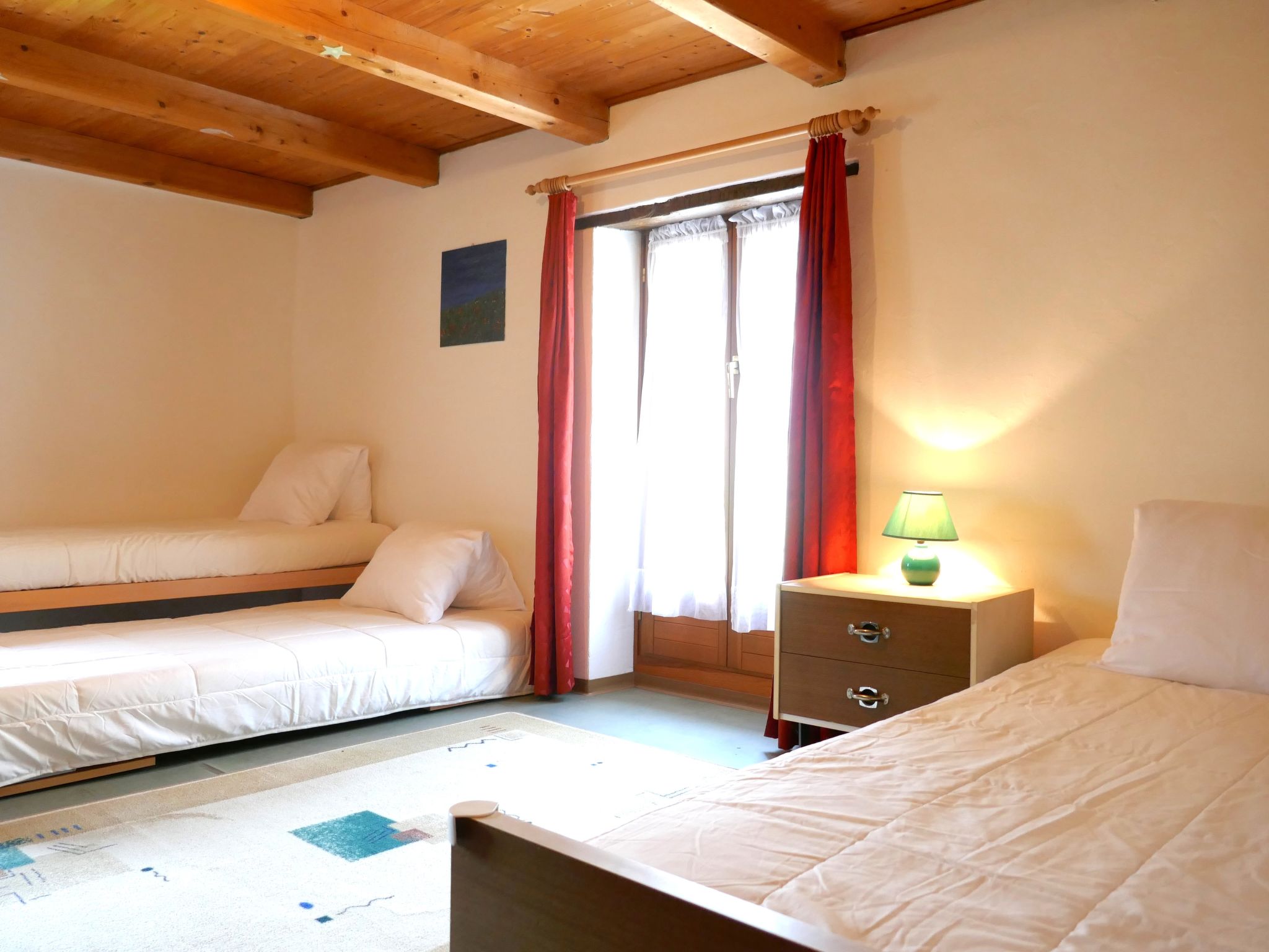 "Casa Calanca", casa 4 locali 140 m2. Oggetto adatto a 2 adulti + 3 bambini. Arredamento semplice e funzionale: soggiorno con TV e DVD. Cucina (forno, lavastoviglie, 4 piastre cottura in vetroceramica, forno a microonde, congelatore, macchina da caffè elettrica, capsule per la macchina da caffè (Delizio) extra, set per fondue (formaggio)) con tavolo da pranzo, radio e stufa a legna. Uscita verso il patio. WC separato. Piano superiore: 1 camera con 1 letto (90 cm, lunghezza 200 cm), 1 letto estraibile (2 pers. 2 x 90 cm, lunghezza 200 cm). Uscita sul balcone. 1 camera matrimoniale con 1 letto doppio (2 x 90 cm, lunghezza 200 cm). Vasca/bidet/WC. Riscaldamento elettrico, riscaldamento a legna. Giardino. Barbecue (portatile), sedie a sdraio (2), veranda. Bella vista sul paesaggio e sulla cittadina. A disposizione: lavatrice, asciugatrice, ferro da stiro, seggiolone, lettino per bimbi fino 2 anni (extra), asciugacapelli. Internet (wifi, gratis). Prego notare: adatto alle famiglie. Casa per non fumatori. Massimo 1 animale/cane consentito.