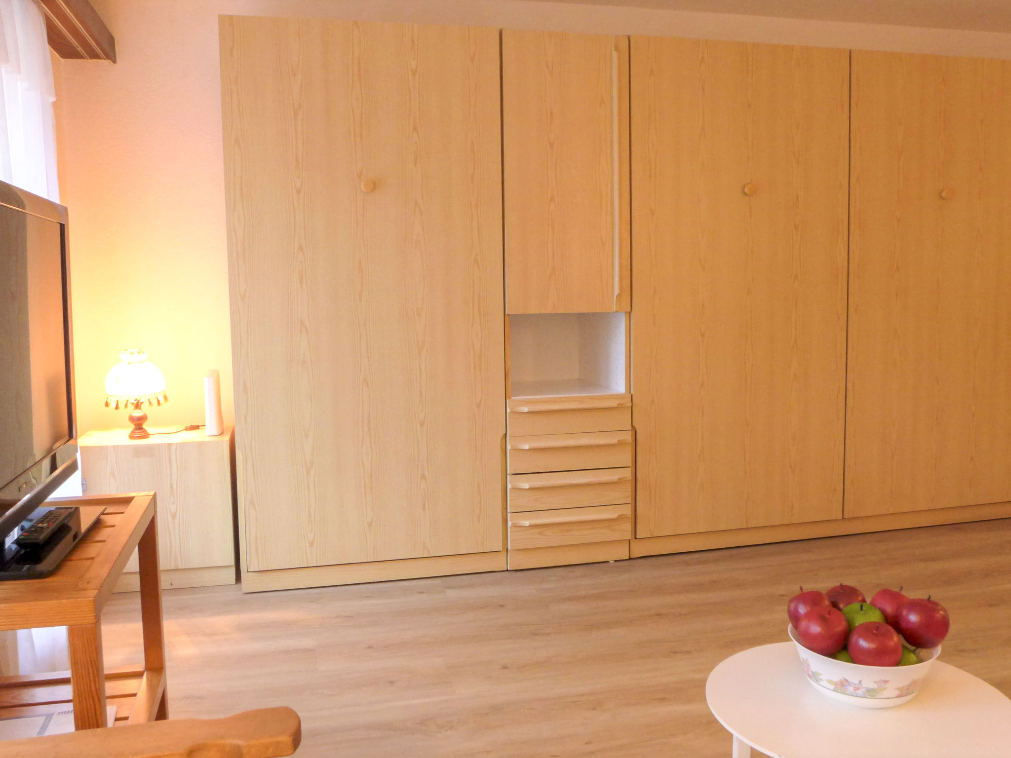 Monolocale 25 m2 al 3. piano. Arredamento semplice e funzionale: soggiorno/camera con 3 letti ad armadio (90 cm, lunghezza 200 cm), tavolo da pranzo e TV. Uscita sul balcone. Piccola cucina nell'ingresso (3 punti cottura, forno, tostapane, bollitore elettrico, congelatore, macchina da caffè elettrica). Vasca/WC. Balcone 8 m2. Mobili da balcone. Splendida vista sul Cervino. A disposizione: asciugacapelli. Internet (wifi, gratis). Prego notare: appartamento per non fumatori. Massimo 1 animale/cane consentito.