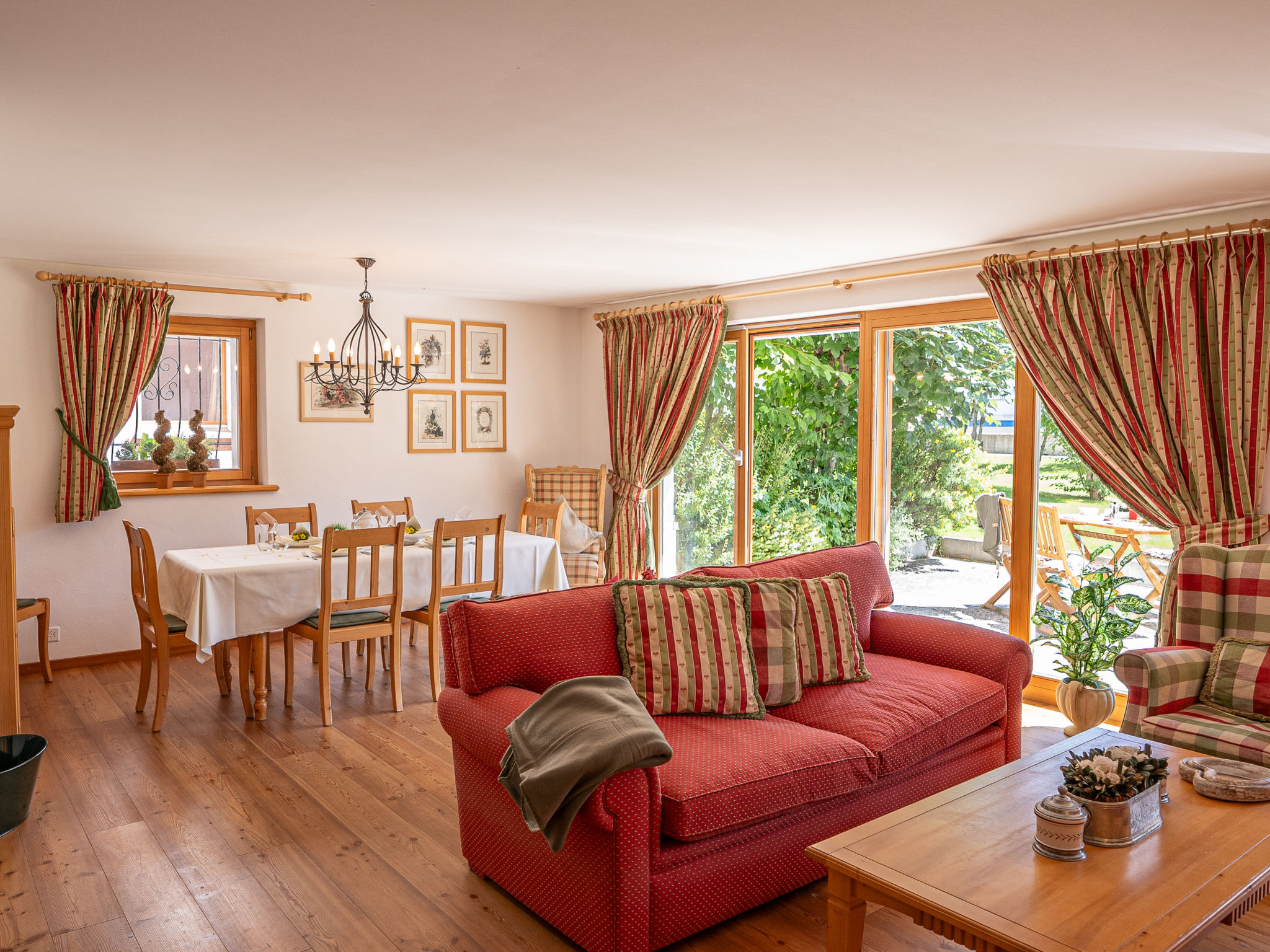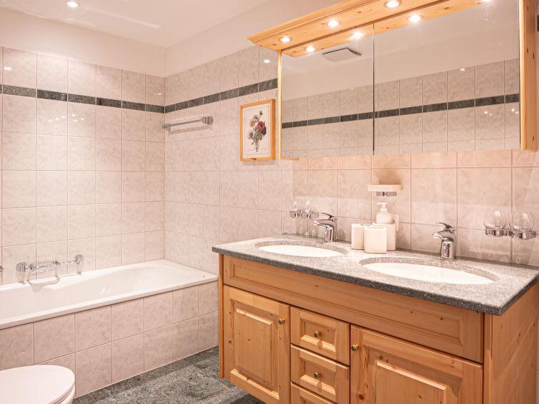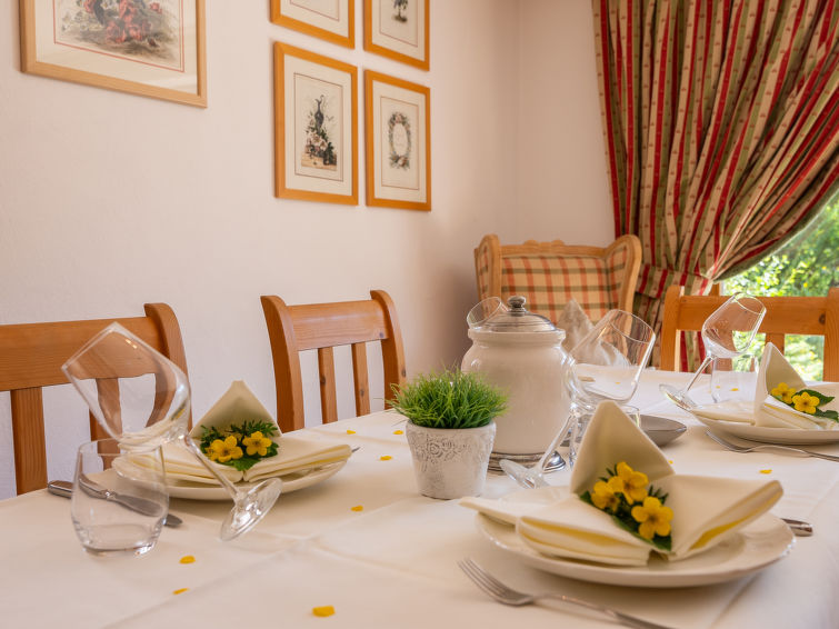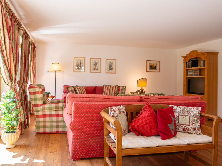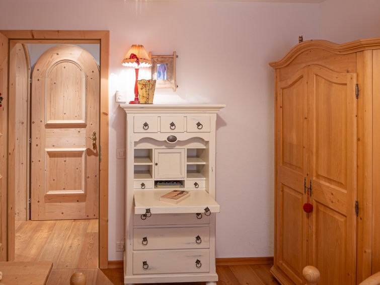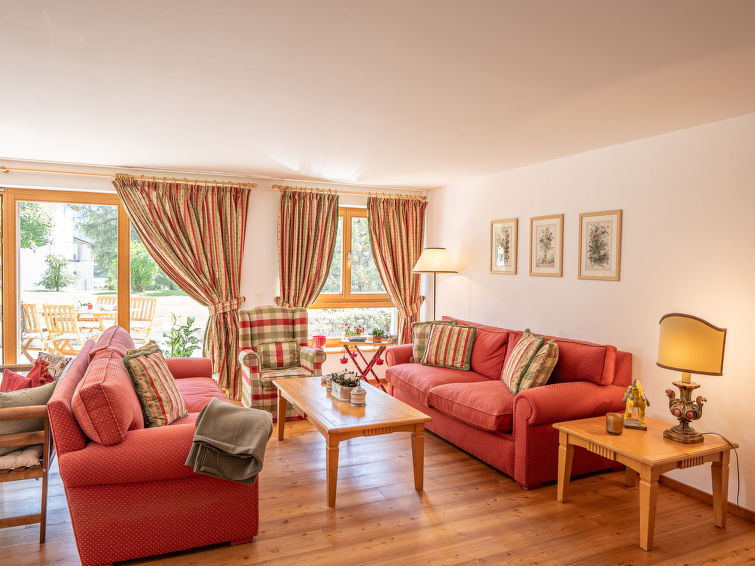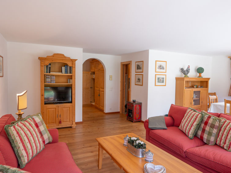 "Chesa Dal Luf B1", apt. di 3 locali 110 m2, al pianterreno. Spazioso e luminoso, arredamento di buon gusto e accogliente: soggiorno/sala da pranzo grande con TV (schermo piatto). Uscita sul giardino, verso il patio. 1 camera matrimoniale grande con 1 letto doppio (2 x 90 cm, lunghezza 200 cm), vasca/WC e bidet. 1 camera con 2 letti (90 cm, lunghezza 200 cm). Grande cucina (forno, lavastoviglie, 2 piastre cottura in vetroceramica, 2 piastre ad induzione, tostapane, bollitore elettrico, macchina da caffè elettrica, capsule per la macchina da caffè (Nespresso) extra). Doccia/WC. Riscaldamento. Pavimenti in legno. Mobili da terrazza. Bella vista sulle montagne e sul paesaggio. A disposizione: ferro da stiro, asciugacapelli. Internet (wifi, gratis). Garage nr. 5+6, altezza 250 cm, larghezza 230 cm. Prego notare: appartamento per non fumatori, casa per non fumatori.