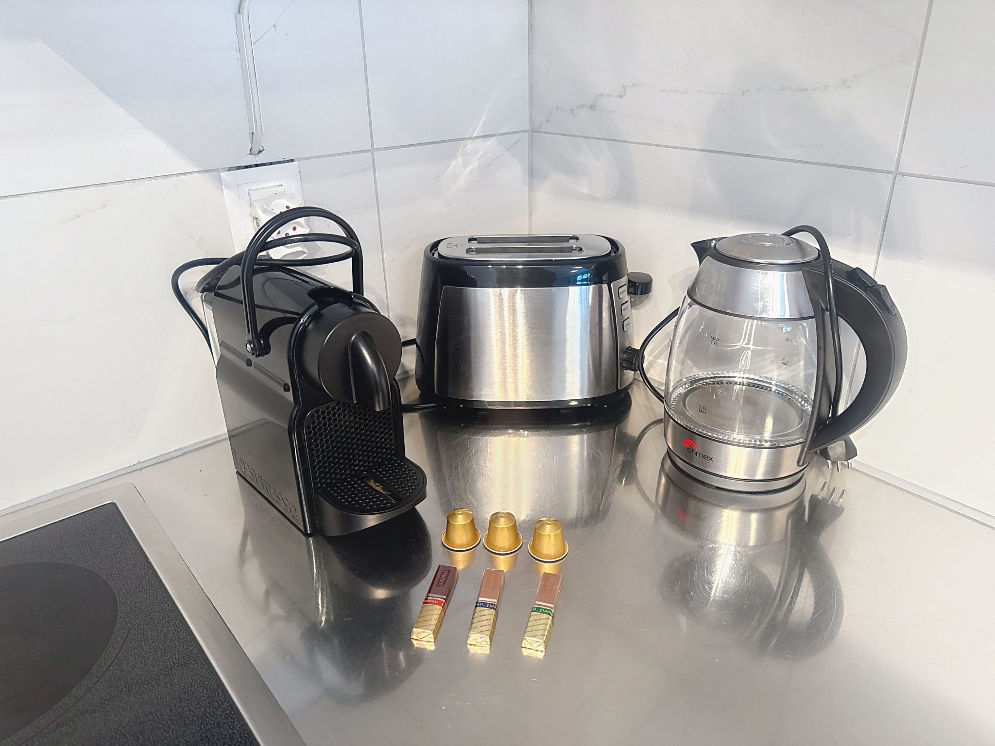🫕 UNA CUCINA BEN ATTREZZATA con lavastoviglie, forno, microonde, macchina del caffè, bollitore, tostapane, set per fonduta e provviste di base come caffè, tè, olio, sale e pepe.